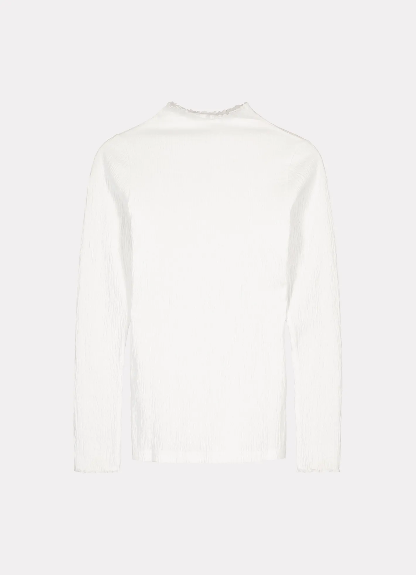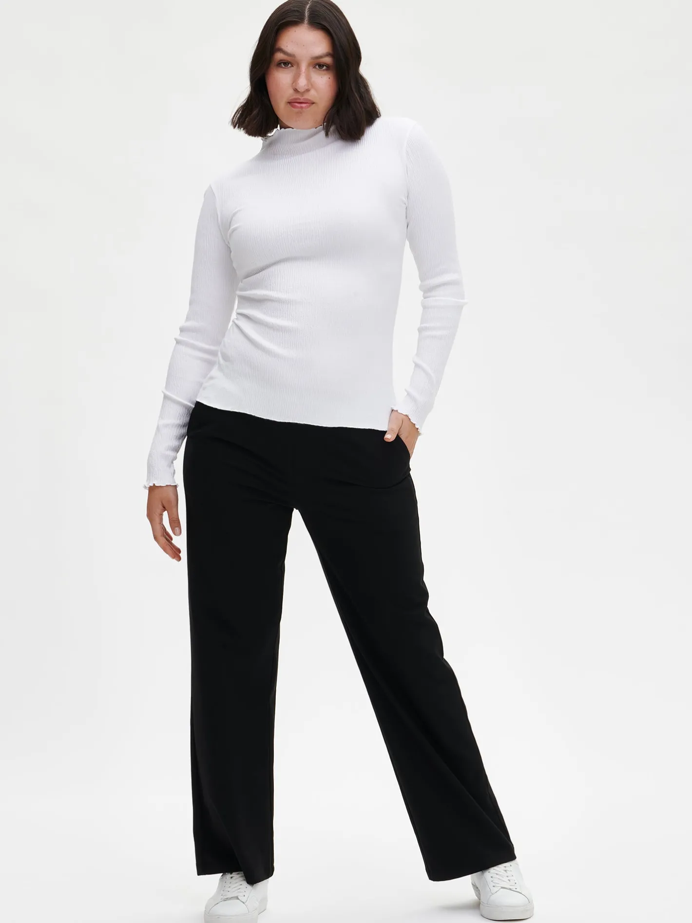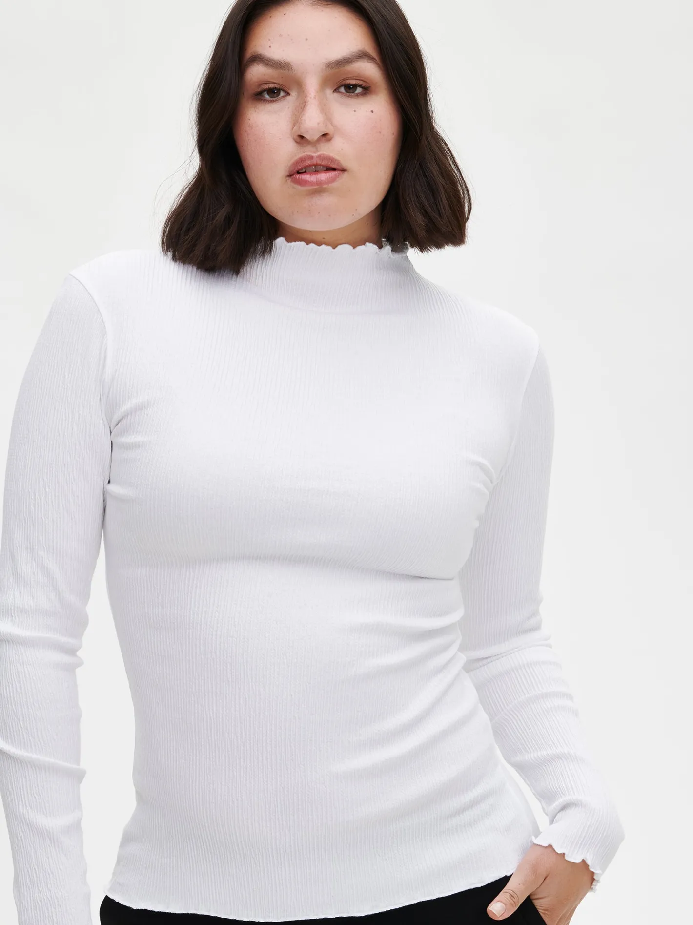 Naisten istuva, valkoinen struktuuripintainen Mette-pusero. Tyylikkäässä puserossa on matala pystykaulus ja täyspitkät hihat. Ajattoman puseron voi helposti yhdistää erilaisten housujen, hameiden tai mekkojen pariksi. Puseron pääntien ja hihansuiden reunat on huoliteltu rullapäärmeellä, joka luo paidan reunoihin kauniin aaltoilevan efektin. Puseron pituus koossa M on noin 65 cm. Materiaali on miellyttävää ja joustavaa puuvilla-polyesteri-elastaani-neulosta.