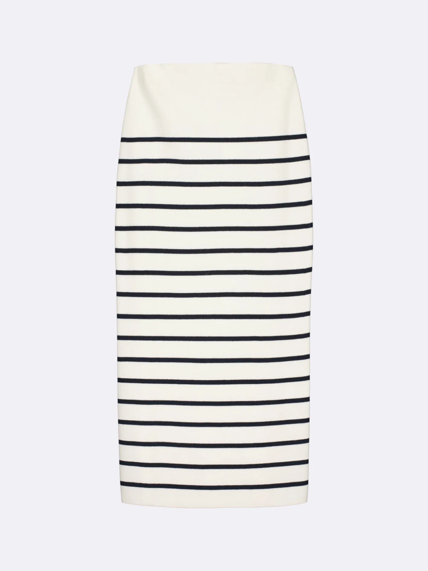 Naisten raidallinen luonnonvalkoinen-musta Milano-hame. Ajaton ja monipuolinen neulehame ihastuttaa ympäri vuoden. Tyylikkäässä ja mukavassa vuorittomassa hameessa on joustava vyötärö. Hameen pituus koossa M on noin 85 cm. Hame on milano-neulosta, joka pysyy ryhdikkäänä käytössä. Tuote on valmistettu vastuullisesti tuotetusta laadukkaasta puuvillasta.