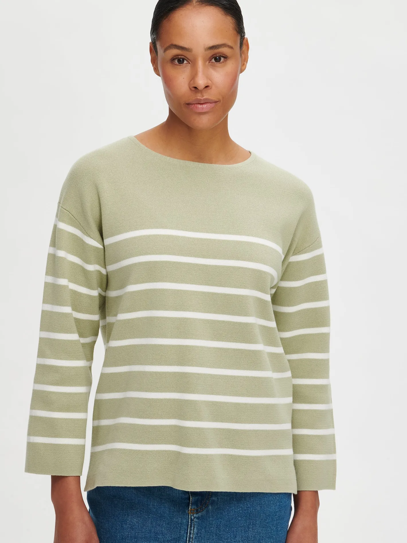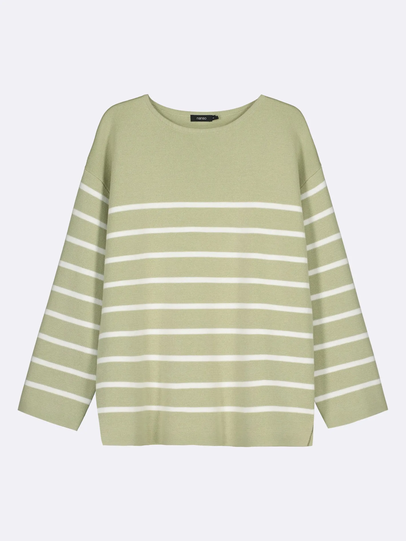 Naisten pitkähihainen, raidallinen vihreä Milano-neulepusero. Tyylikäs ja ajaton raitaneule on aina muodissa. Rennossa suoralinjaisessa neulepuserossa on ovaali pääntie, pudotettu olka ja täyspitkät hihat. Tuotteen pituus koossa M on noin 64 cm. Neulepusero on milano-neulosta, joka pysyy ryhdikkäänä käytössä. Neulepusero on valmistettu vastuullisesti tuotetusta laadukkaasta puuvillasta.