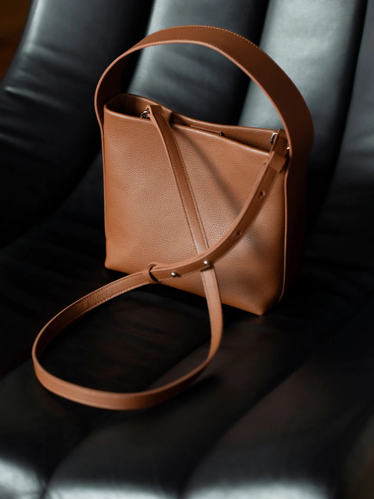 - Nahkalaukussa on sekä kantohihna että irrotettava ja säädettävä olkahihna.