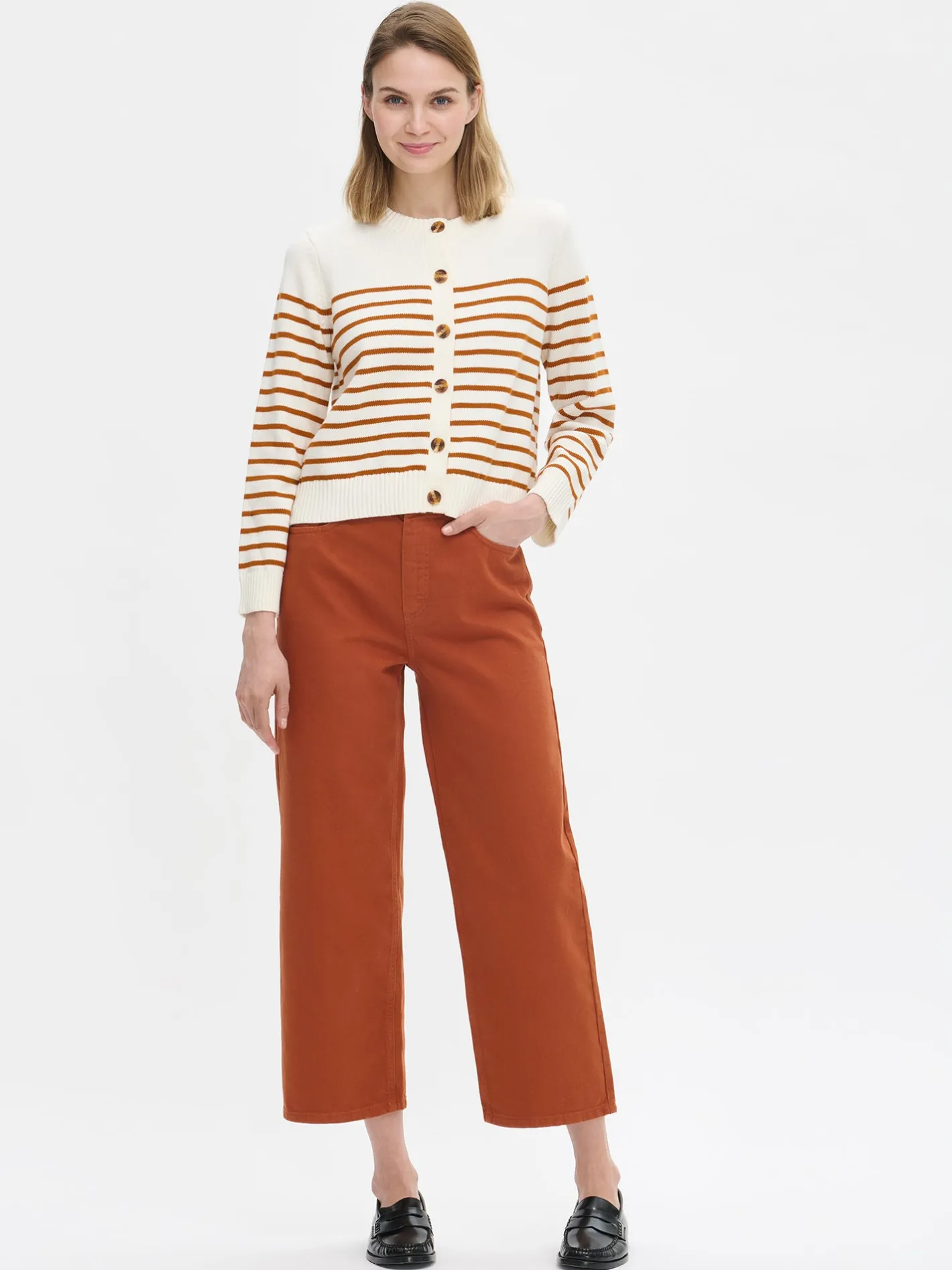 Naisten pitkähihainen, valko-ruskea raidallinen ja suoralinjainen Mira-neuletakki. Kaunis neuletakki on vaatekaapin kulmakivi ja helppo yhdistää moniin eri asuihin. Muotoonneulotussa puuvilla neuletakissa on pyöreä pääntie, täyspitkät hihat ja edessä napitus. Tuotteen pituus koossa M on noin 56 cm. Neuletakki on valmistettu sertifioidusta laadukkaasta puuvillasta.