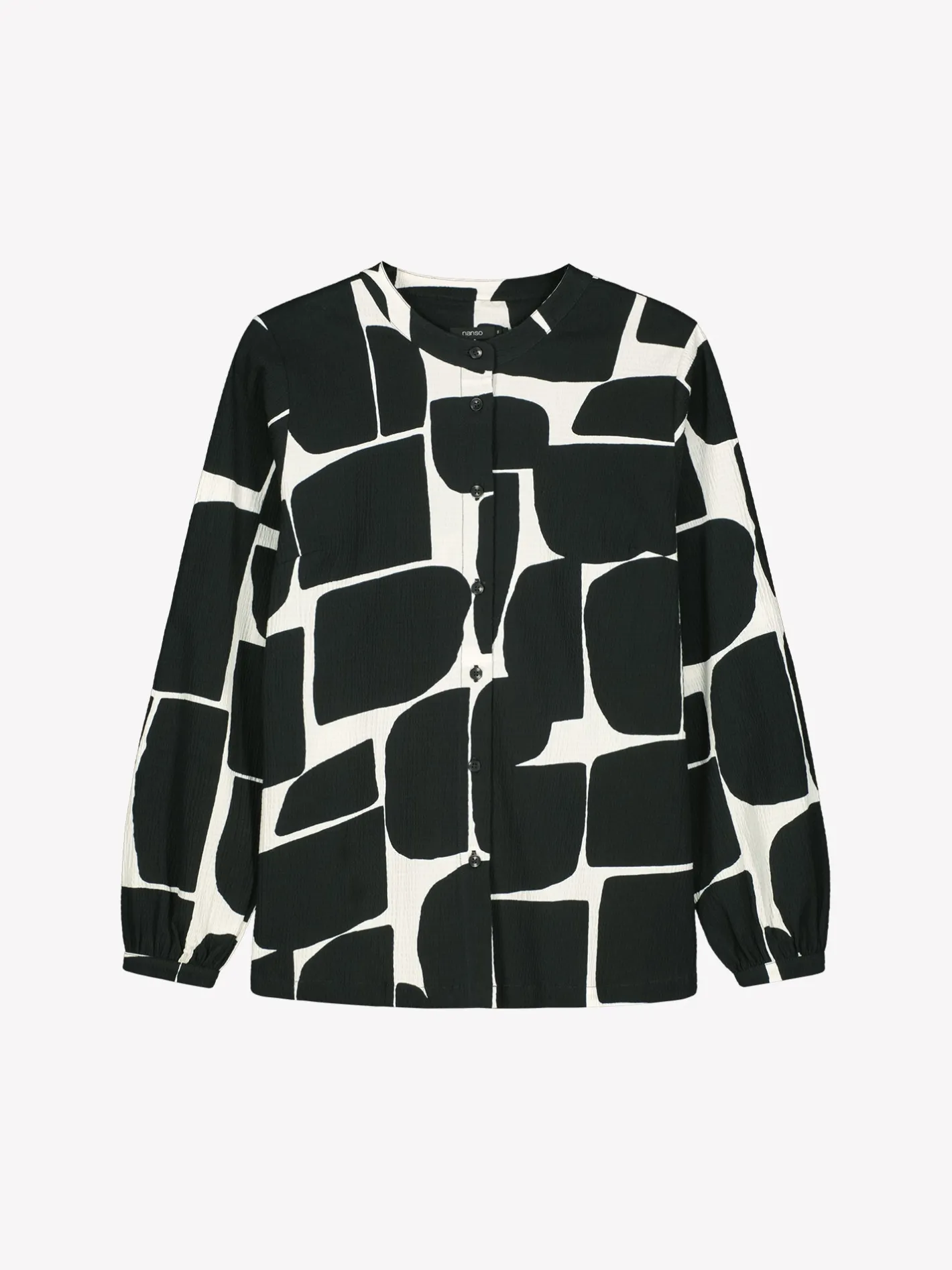 Naisten kuosillinen Muuri-paitapusero. Suoralinjaisessa paitapuserossa on kaulus, edessä napitus ja rintamuotolaskokset. Puserossa on täyspitkät hihat, jotka poimuttuvat kauniisti hihansuun kaitaleen yläpuolella. Hihansuissa on nappihalkiot ja helma on suora. Puseron pituus koossa 38 on noin 70 cm. Tuote on valmistettu laadukkaasta ja ryhdikkäästä kudotusta puuvillakangasta, jossa on hieman elastaania antamassa joustoa.