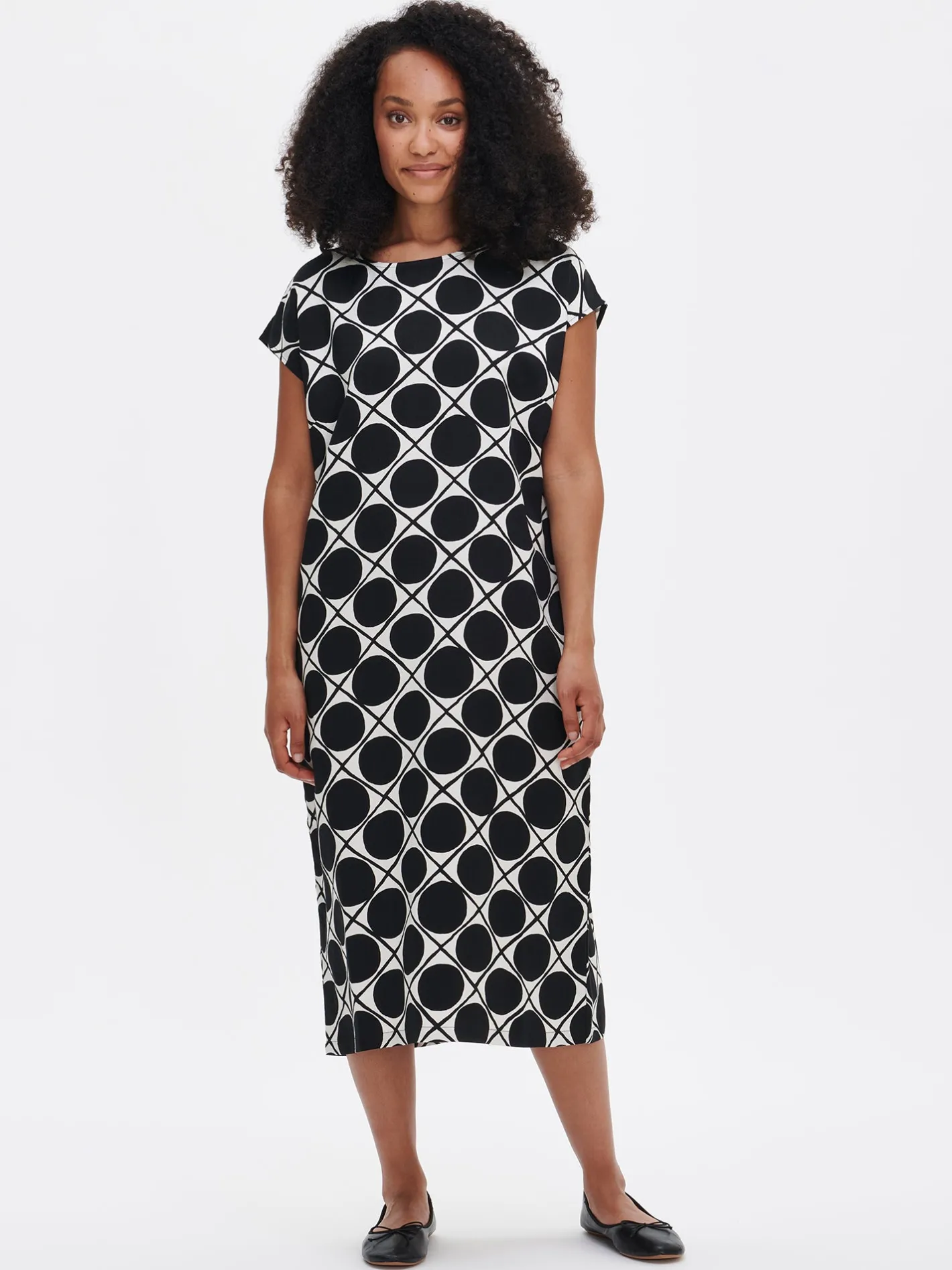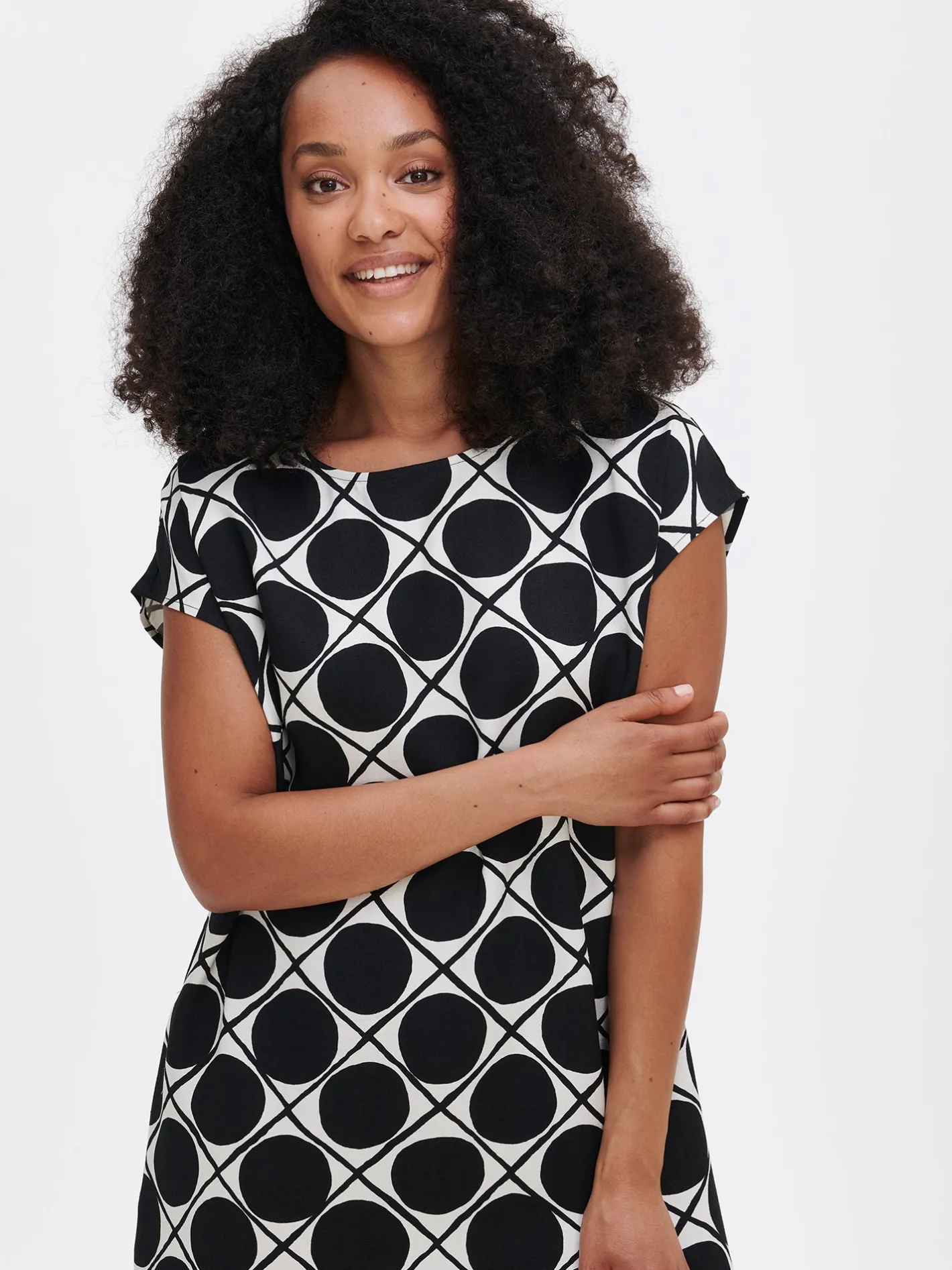 Sharon on 165 cm pitkä ja hänellä on päällään tuotteesta koko 36. Mallin ympärysmitat ovat: rinta 82 cm, vyötärö 66 cm ja lantio 94 cm