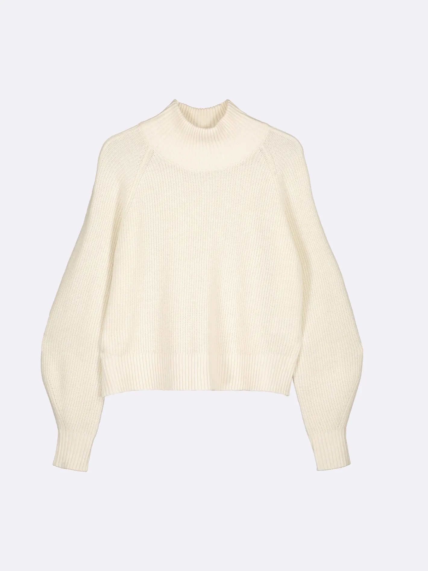 Naisten lämmin luonnonvalkoinen Nora-neulepusero. Mukavaan neulepaitaan on ihanaa pukeutua sään viilentyessä. Yhdistä neulepaita vaikka tyylikkäiden farkkujen tai suorien housujen pariksi. Neulepuserossa on pystykaulus ja täyspitkät hihat. Neulepuseron pituus koossa M on noin 55 cm. Puolipatenttineulos on pehmeän ja miellyttävän tuntuista villa-polyamidi sekoitetta. Tuotteen valmistuksessa on käytetty sertifioitua villaa. Neuleen hoito-ohjeet löydät