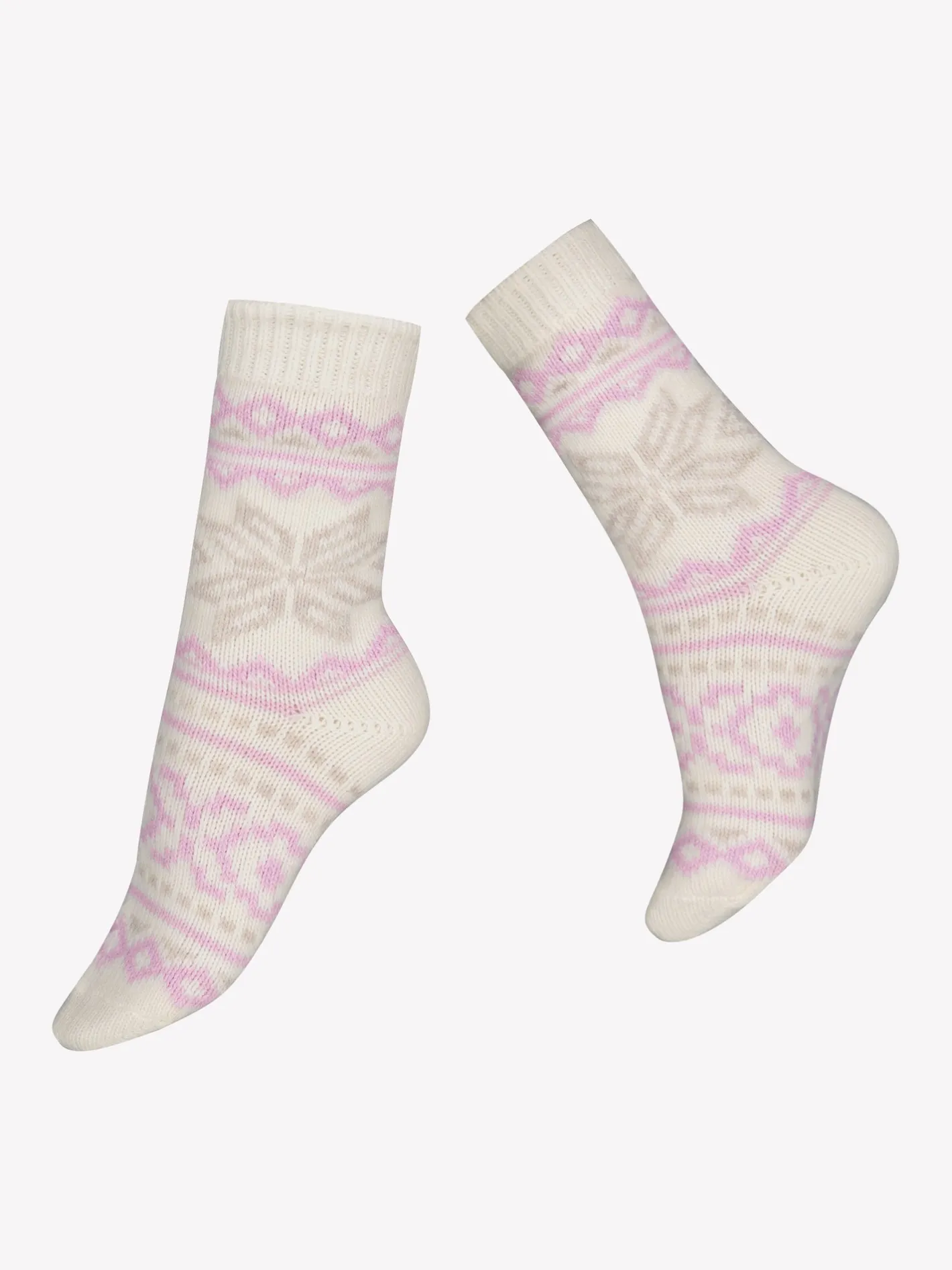 Pehmeät alpakkasekoitesukat sulostuttavalla kirjoneulekuviolla. Nämä sukat ovat täydelliset, kun haluat vain rentoutua ja oleskella kotona mukavasti.