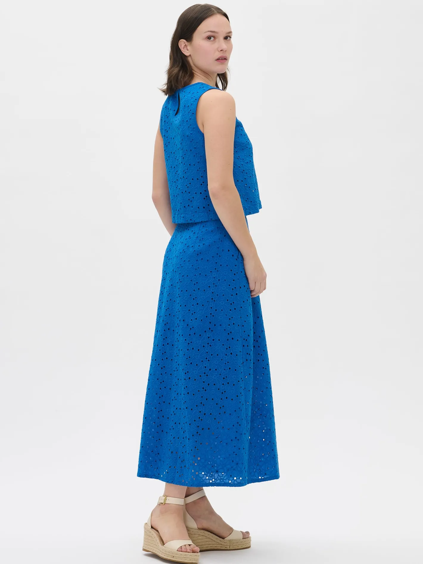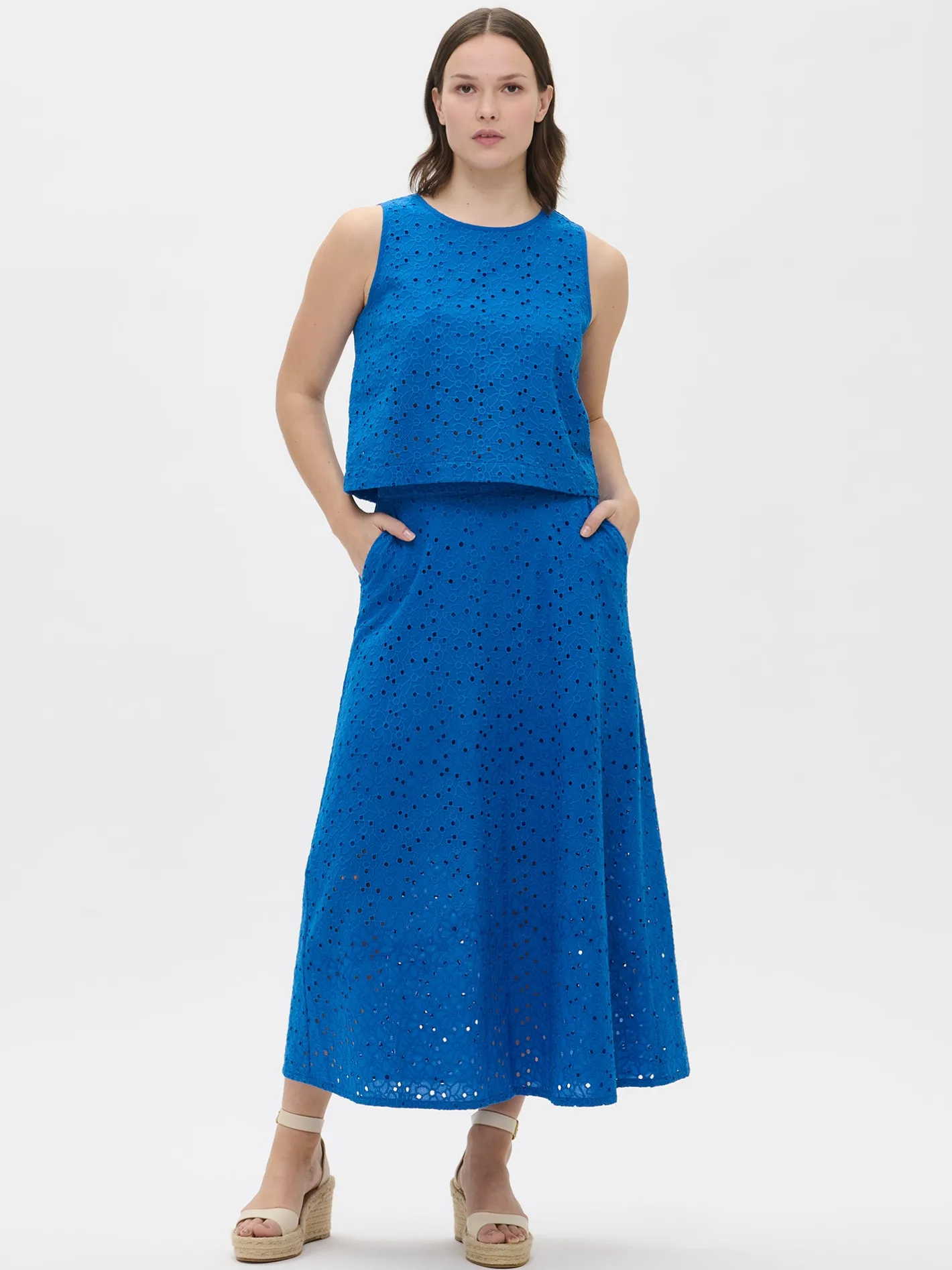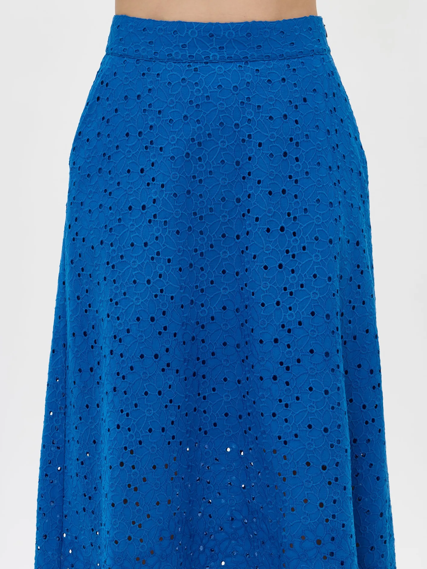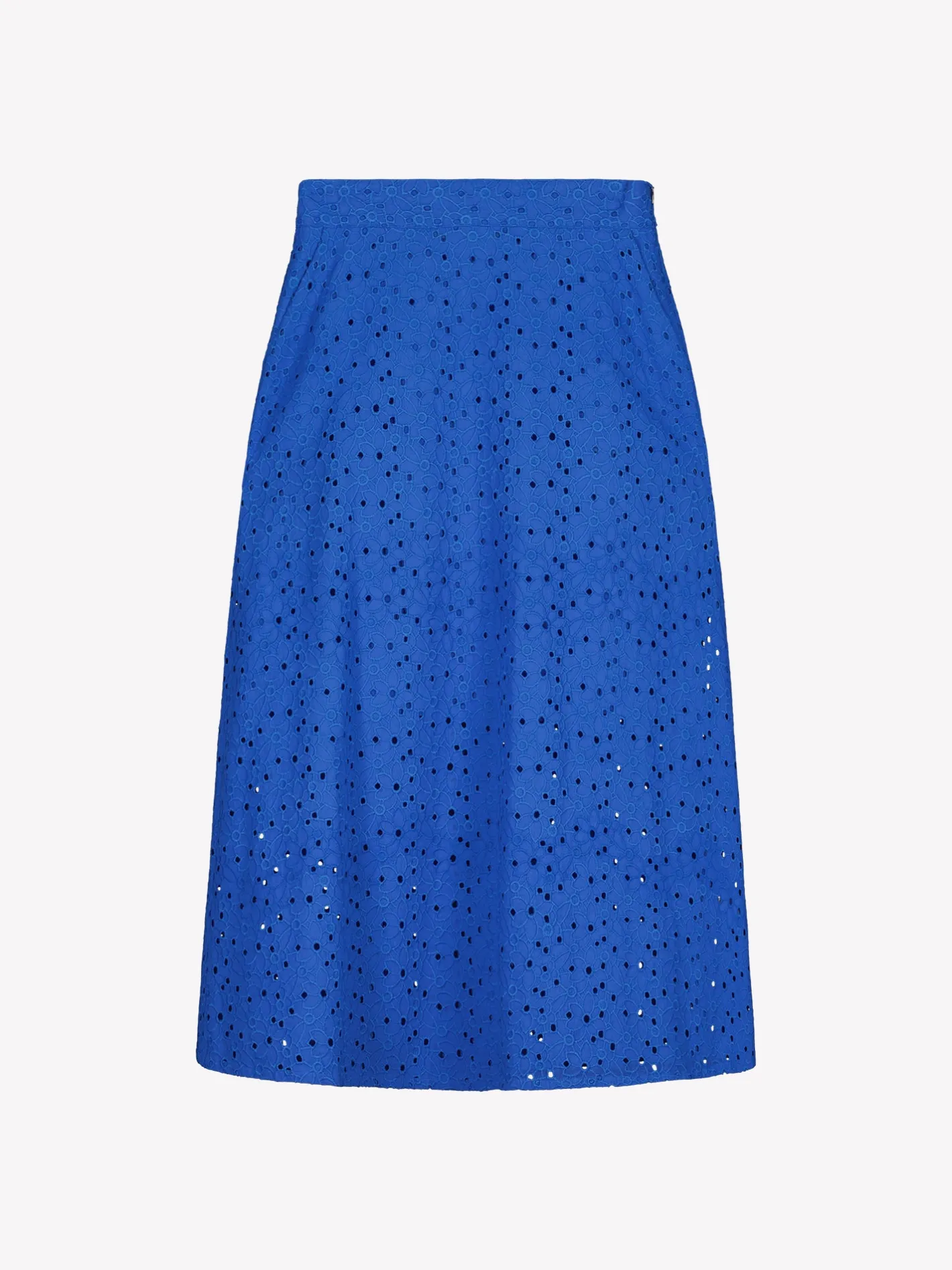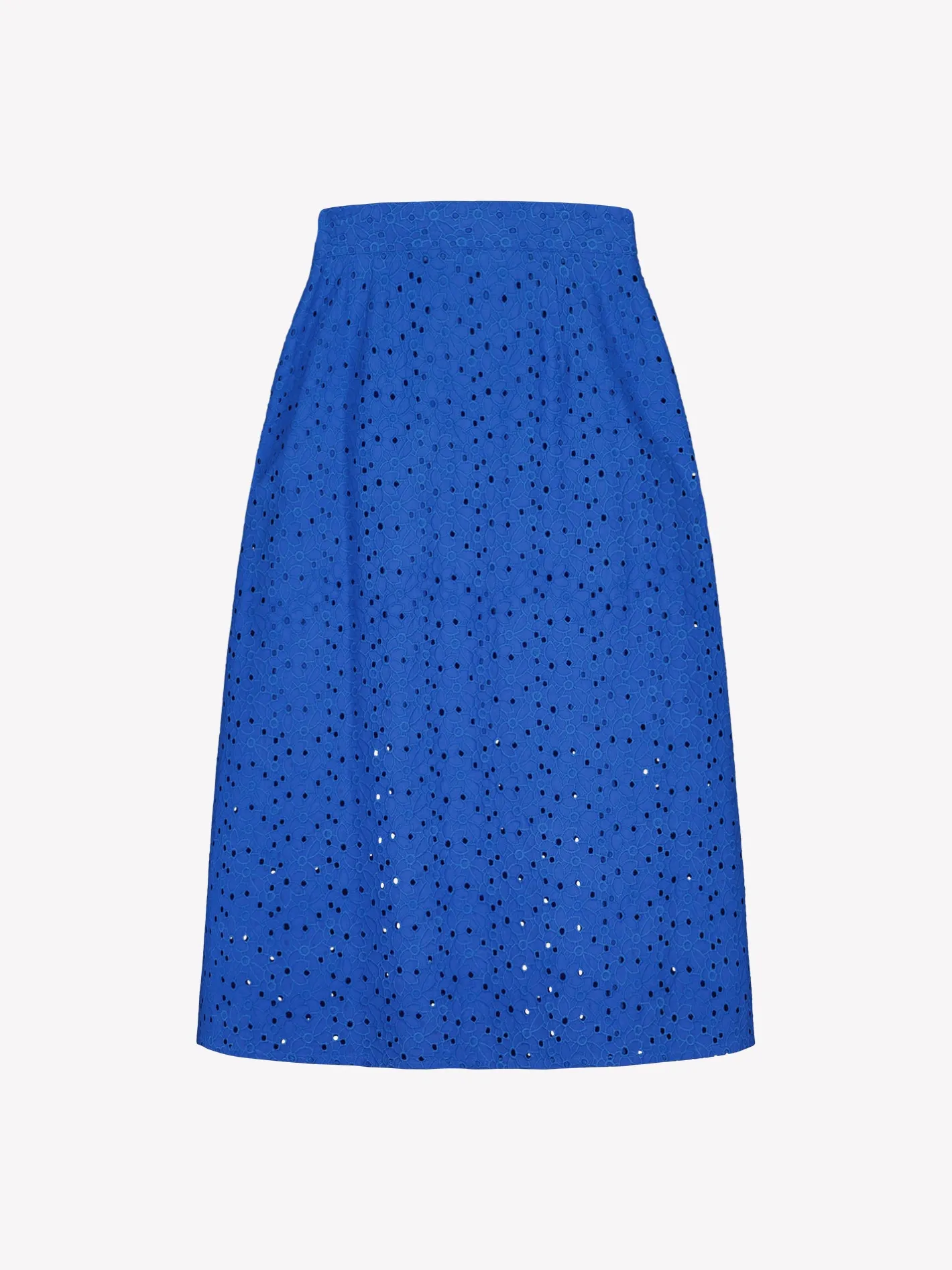 Naisten sininen brodeerattu Nuppu-hame. Hameessa on istuva vyötärö, helma on A-linjainen ja sivussa on taskut sekä vetoketju. Hameen pituus koossa 38 on noin 87 cm. Materiaali on kudottua puuvilla-popliinikangasta, jossa on kaunis brodeeraus. Materiaali on kevyttä ja hengittävää. Hameessa on ohut puuvillavuori.