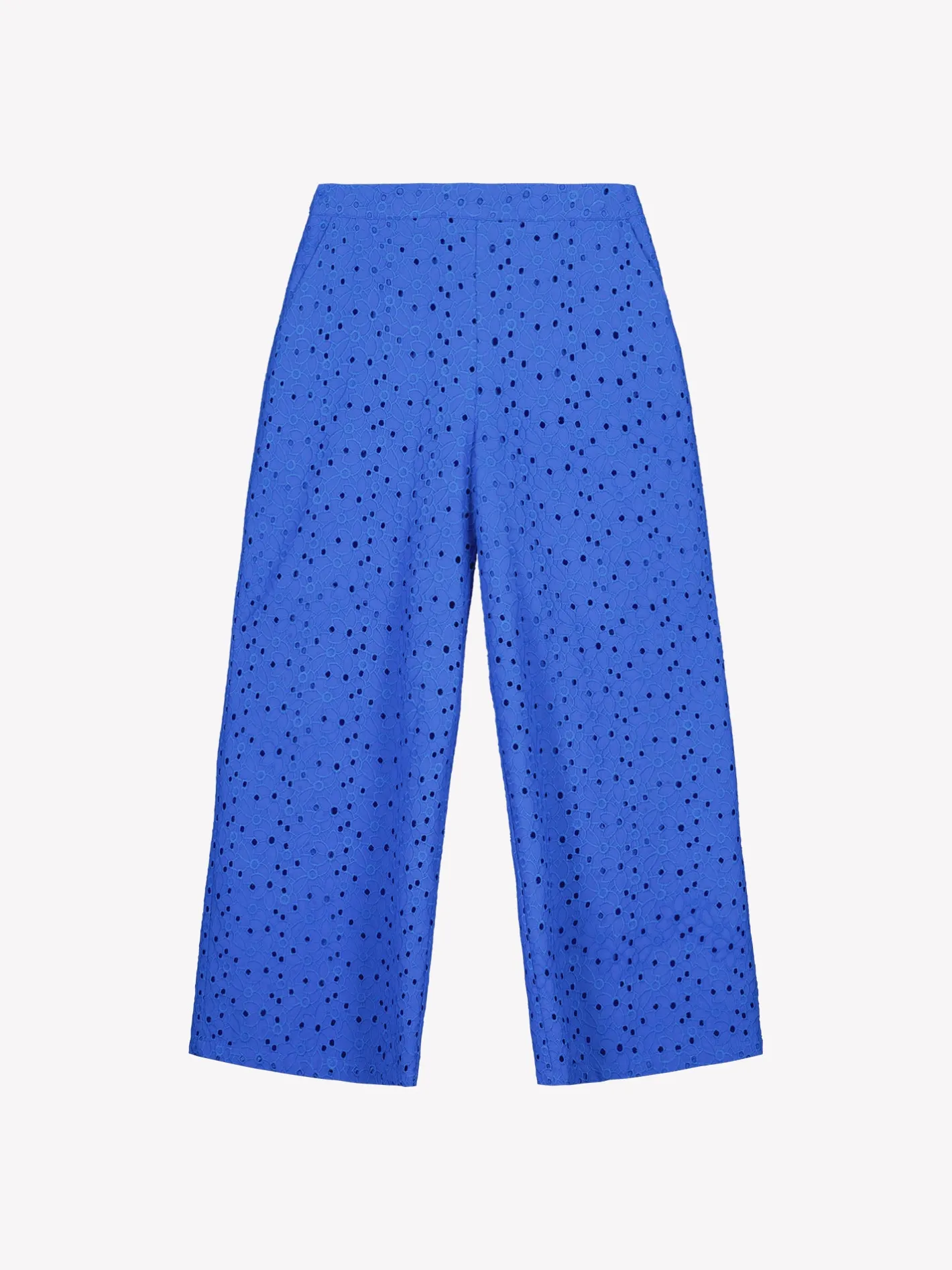 Naisten siniset brodeeratut Nuppu-housut. Leveä lahkeisissa housuissa on istuva vyötärö ja sivussa on taskut sekä vetoketju. Housut ovat 7/8 pituiset ja sisälahkeen pituus koossa 38 on noin 67 cm. Materiaali on kudottua puuvilla-popliinikangasta, jossa on kaunis brodeeraus. Materiaali on kevyttä ja hengittävää. Housujen yläosassa on ohut puuvillavuori.