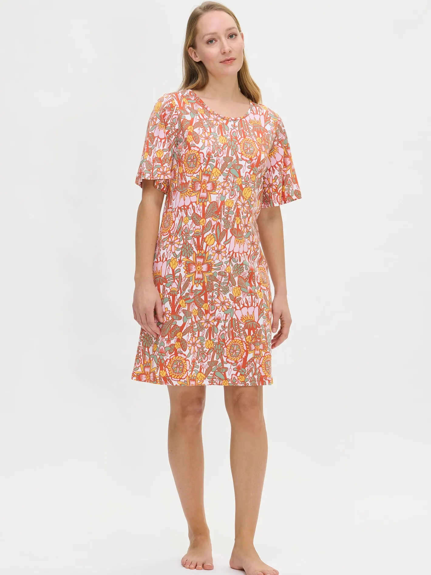 Naisten kuosillinen monivärinen Oodi-yöpaita lyhyillä kellotetuilla hihoilla, pyöreällä pääntiellä ja sivutaskuilla. Yöpaidan pituus koossa M on noin 95 cm. Materiaali on laadukasta, iholla miellyttävän pehmeältä tuntuvaa ja helppohoitoista puuvilla-modaali-neulosta, joka pysyy hyvänä pesusta toiseen. Täydellinen valinta rentoihin öihin, joissa mukavuus ja tyylikkyys yhdistyvät.
