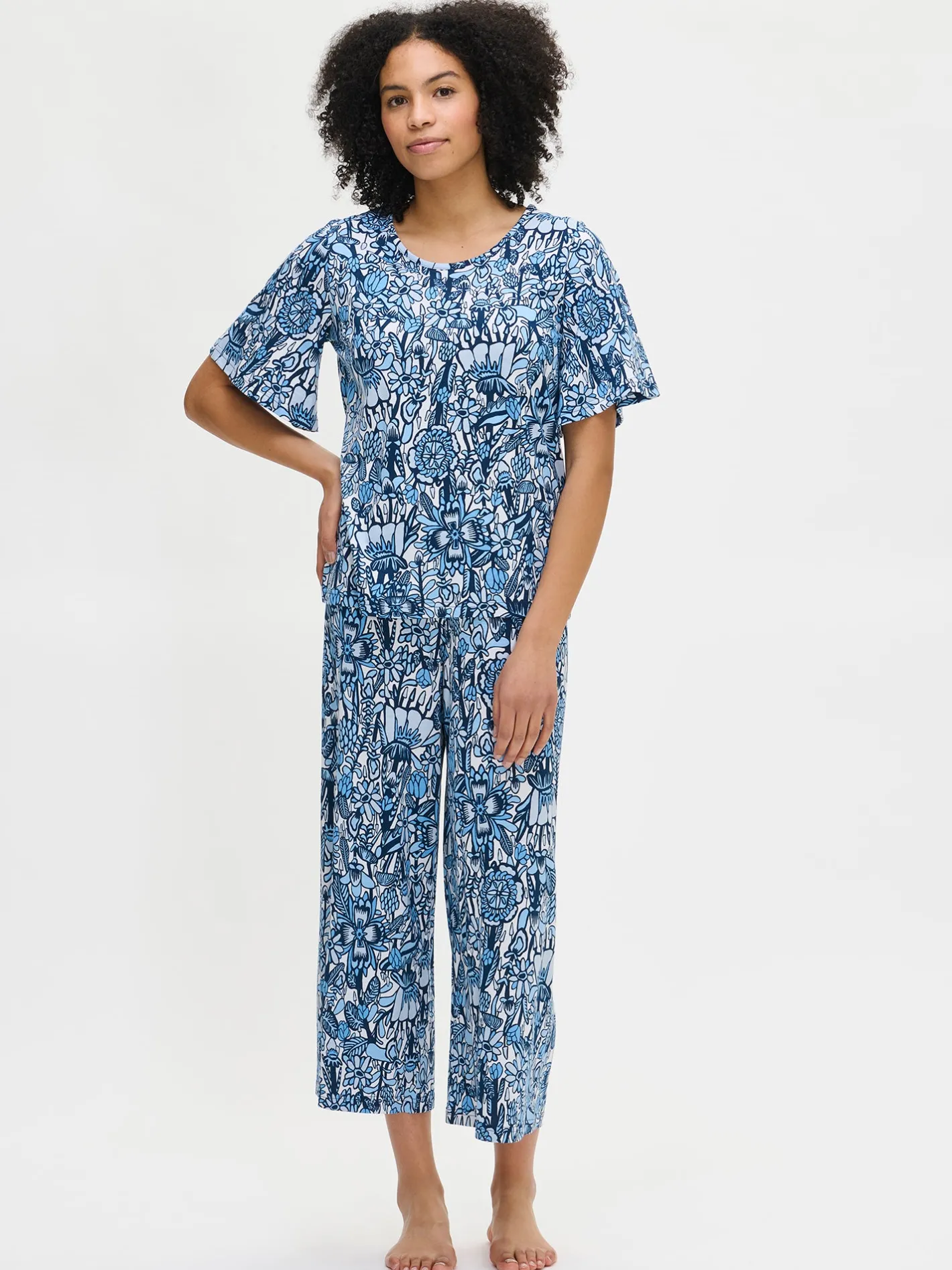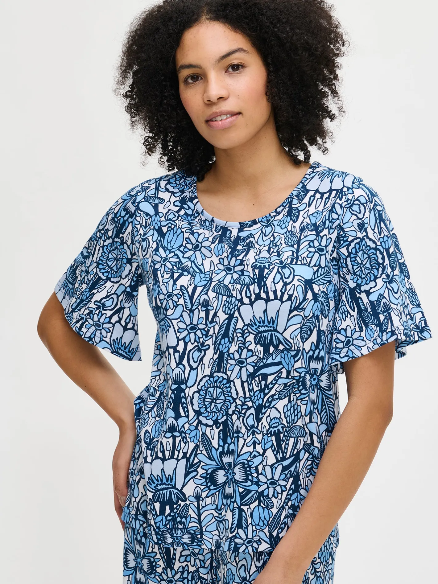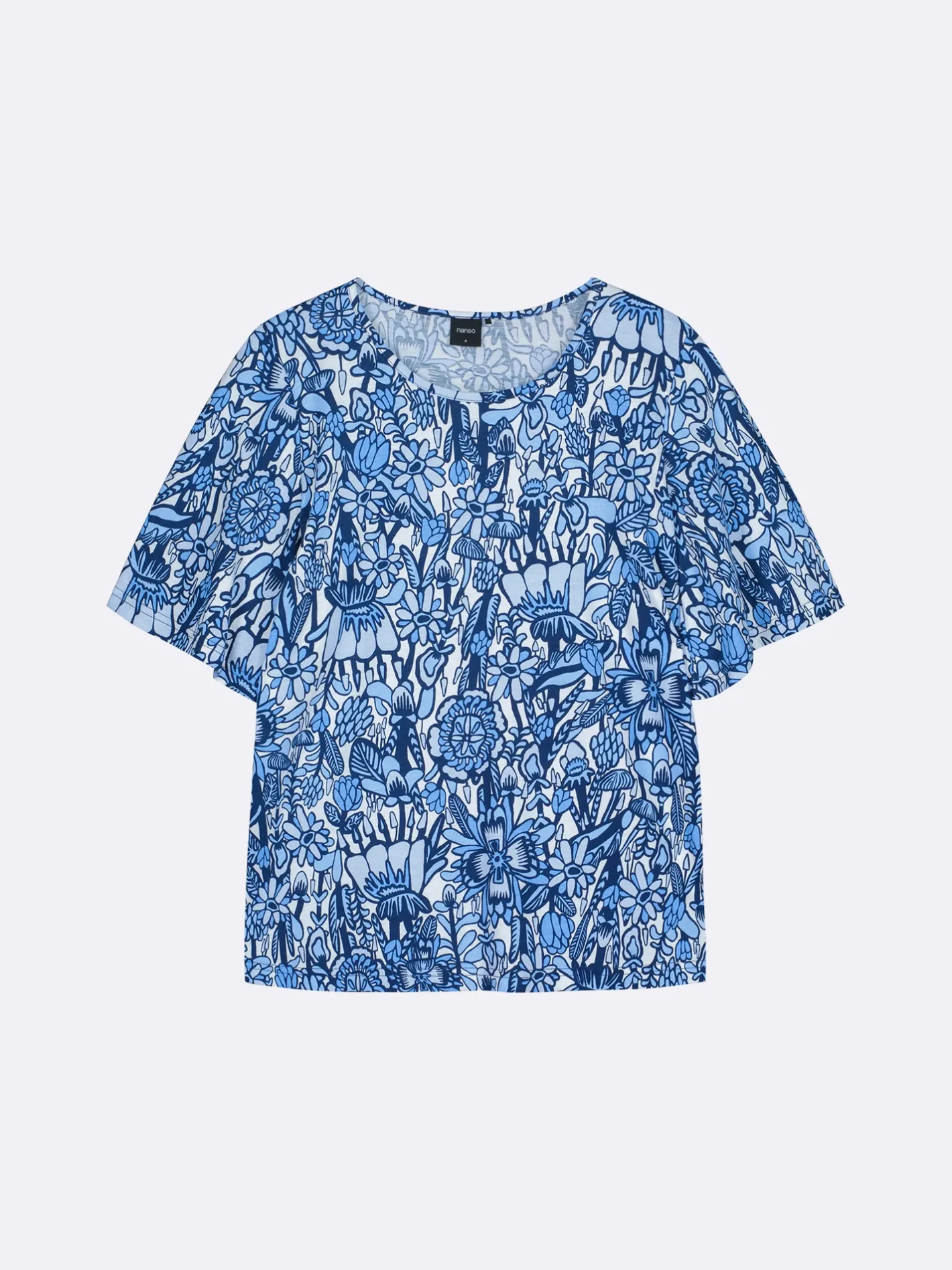 Naisten kuosillinen sininen Oodi- t-paita lyhyillä kellotetuilla hihoilla ja pyöreällä pääntiellä. T-paidan pituus koossa M on noin 67 cm. Materiaali on laadukasta, iholla miellyttävän pehmeältä tuntuvaa ja helppohoitoista puuvilla-modaali-neulosta, joka pysyy hyvänä pesusta toiseen. Täydellinen valinta rentoihin päiviin, jolloin mukavuus on tärkeintä.