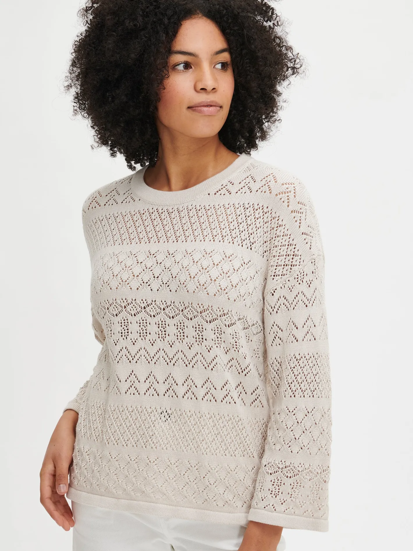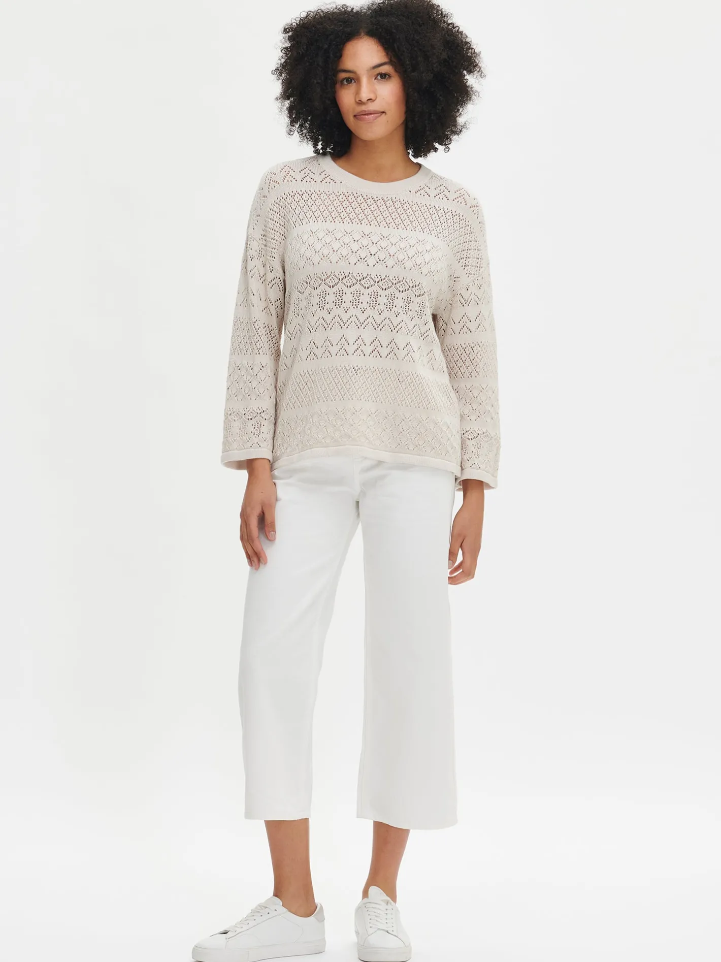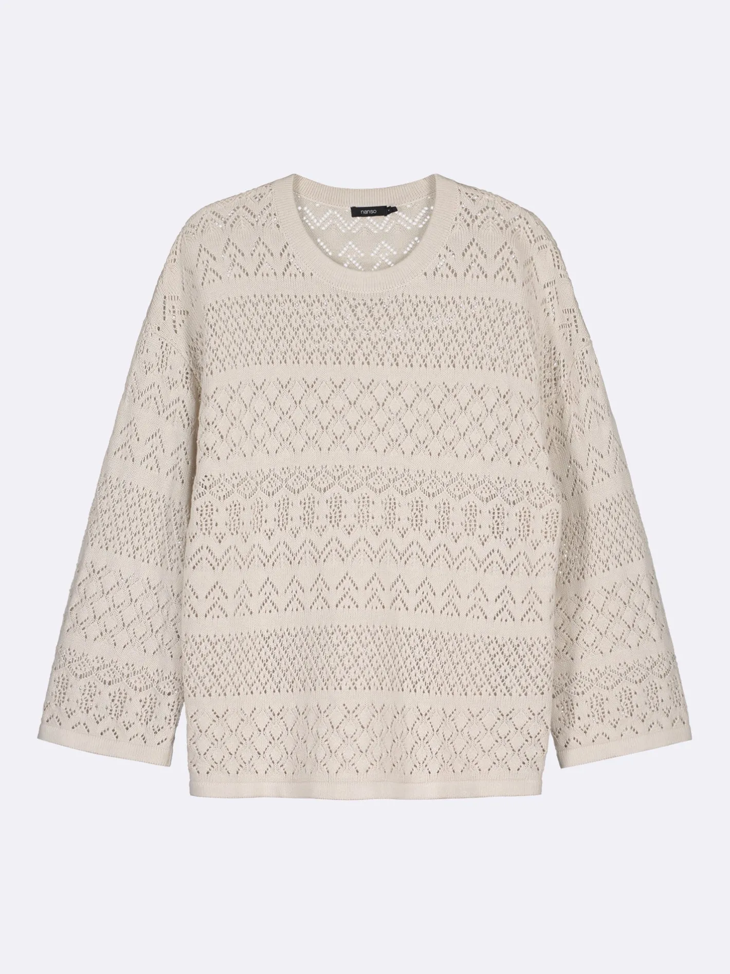 Naisten beige Palermo-neulepusero. Kaunis pitsineule on ihana valinta kesään. Muotoonneulotussa puuvilla neulepuserossa on pyöreä pääntie pudotetulla olalla ja 7/8 pituiset hihat. Neuleessa on kaunis pitsikuvio. Neulepuseron pituus koossa M on noin 62 cm. Tuote on valmistettu sertifioidusta puuvillasta.