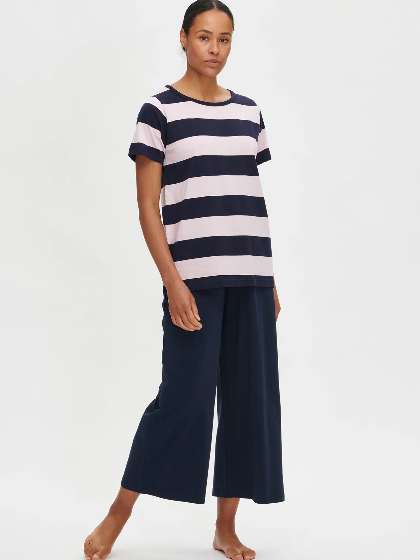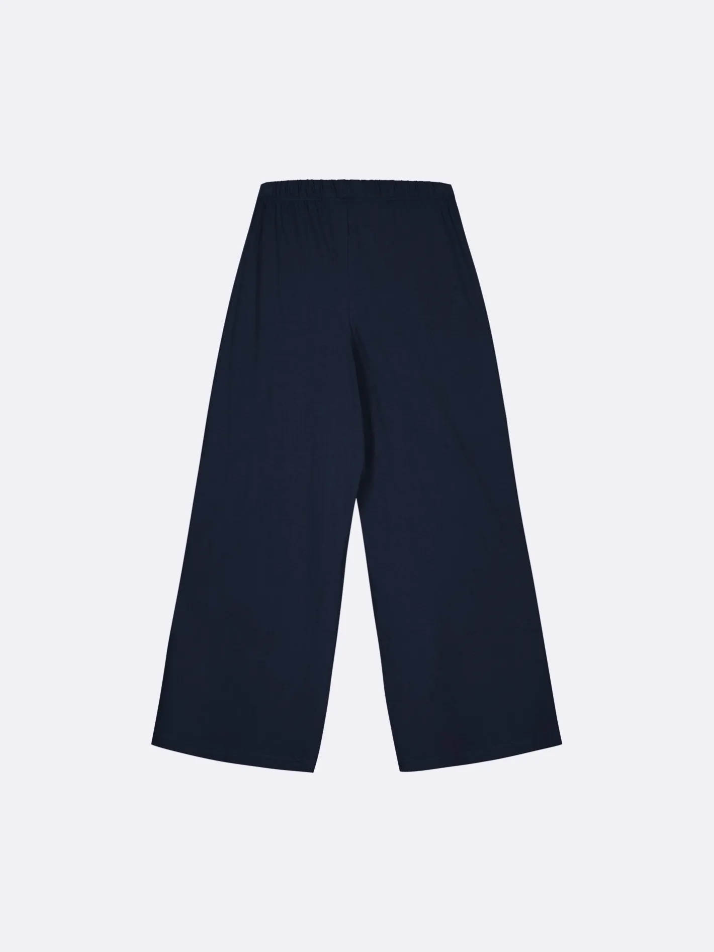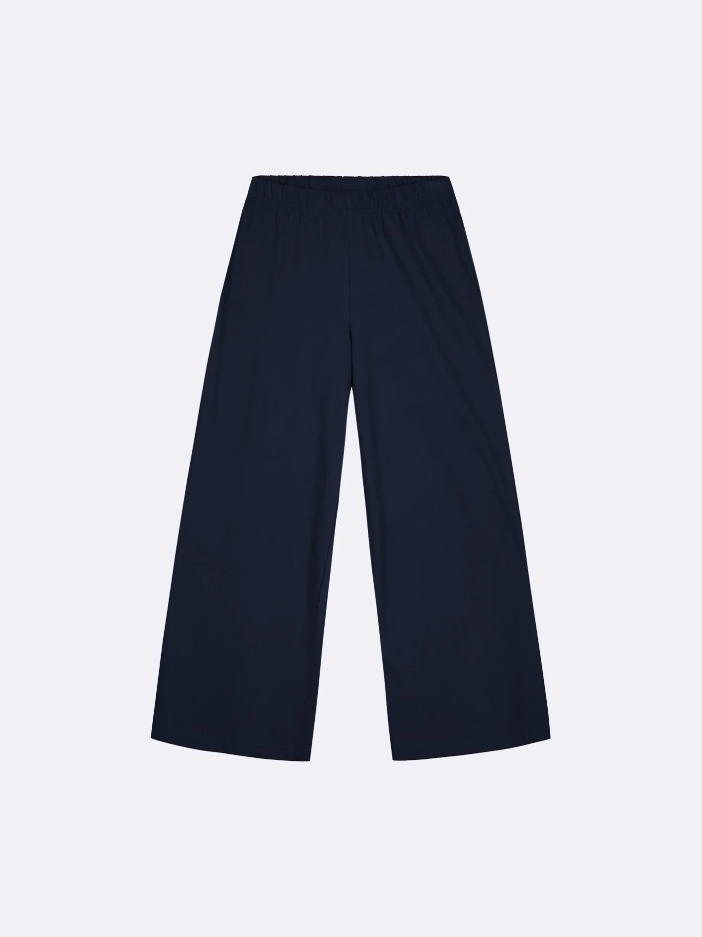 Naisten yksiväriset tummansiniset Palkki-housut. Rennot, leveälahkeiset housut ovat tyylikkäästi 7/8-pituiset. Materiaali on laadukasta, iholla miellyttävän pehmeältä tuntuvaa ja helppohoitoista puuvillaneulosta, joka pysyy hyvänä pesusta toiseen. Neulos on valmistettu sertifioidusta puuvillasta.