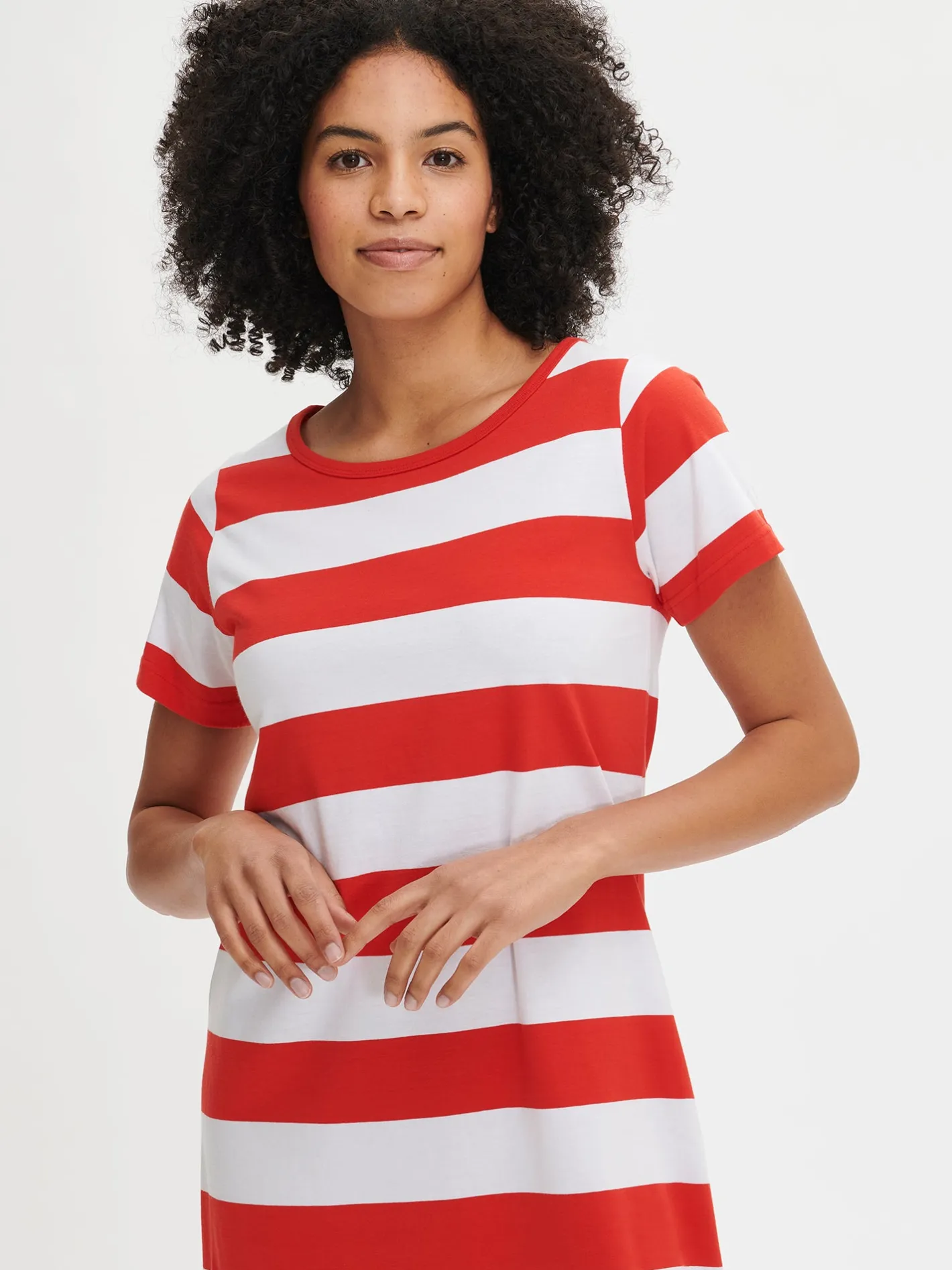 Naisten raidallinen Palkki-yöpaita lyhyillä hihoilla ja ovaalilla pääntiellä. Yöpaidan pituus koossa M on noin 95 cm. Materiaali on laadukasta, iholla miellyttävän pehmeältä tuntuvaa ja helppohoitoista puuvillaneulosta, joka pysyy hyvänä pesusta toiseen. Neulos on valmistettu sertifioidusta puuvillasta.