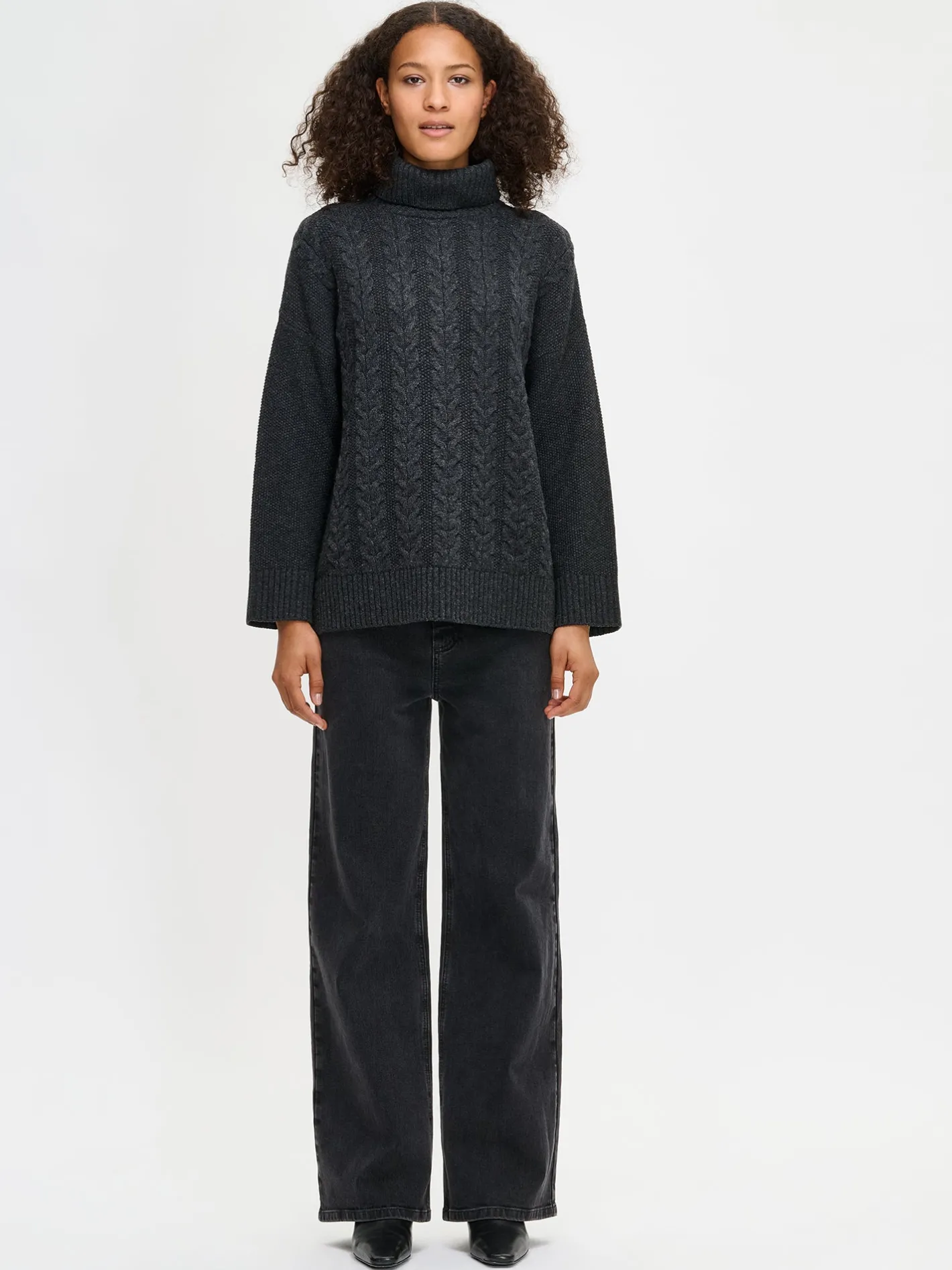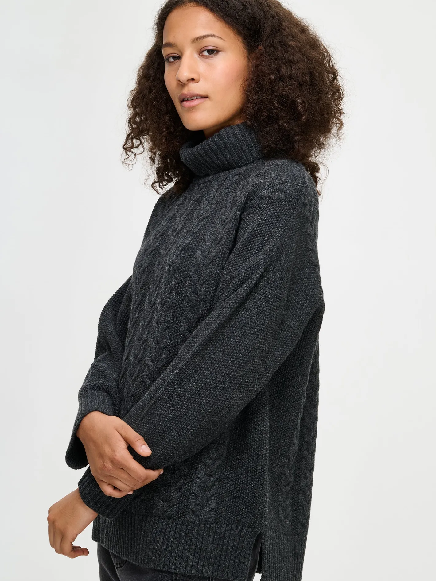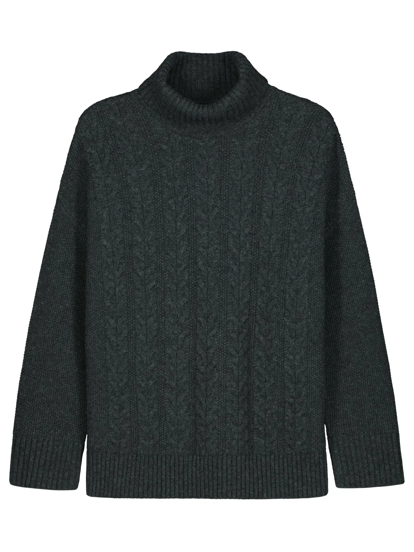 Naisten rento tummanharmaa Palmikko-neulepusero poolokauluksella. Muotoonneulotussa neulepuserossa on pystykaulus, pudotettu olkalinja, täyspitkät hihat ja sivuhalkiot. Hihansuissa ja helmassa on resori. Neulepuserossa on kaunis neulottu palmikkokuvio ja sen pituus koossa M on noin 66 cm. Neulos on pehmeän ja miellyttävän tuntuista villa-polyamidi sekoitetta. Tuotteen valmistuksessa on käytetty sertifioitua villaa.