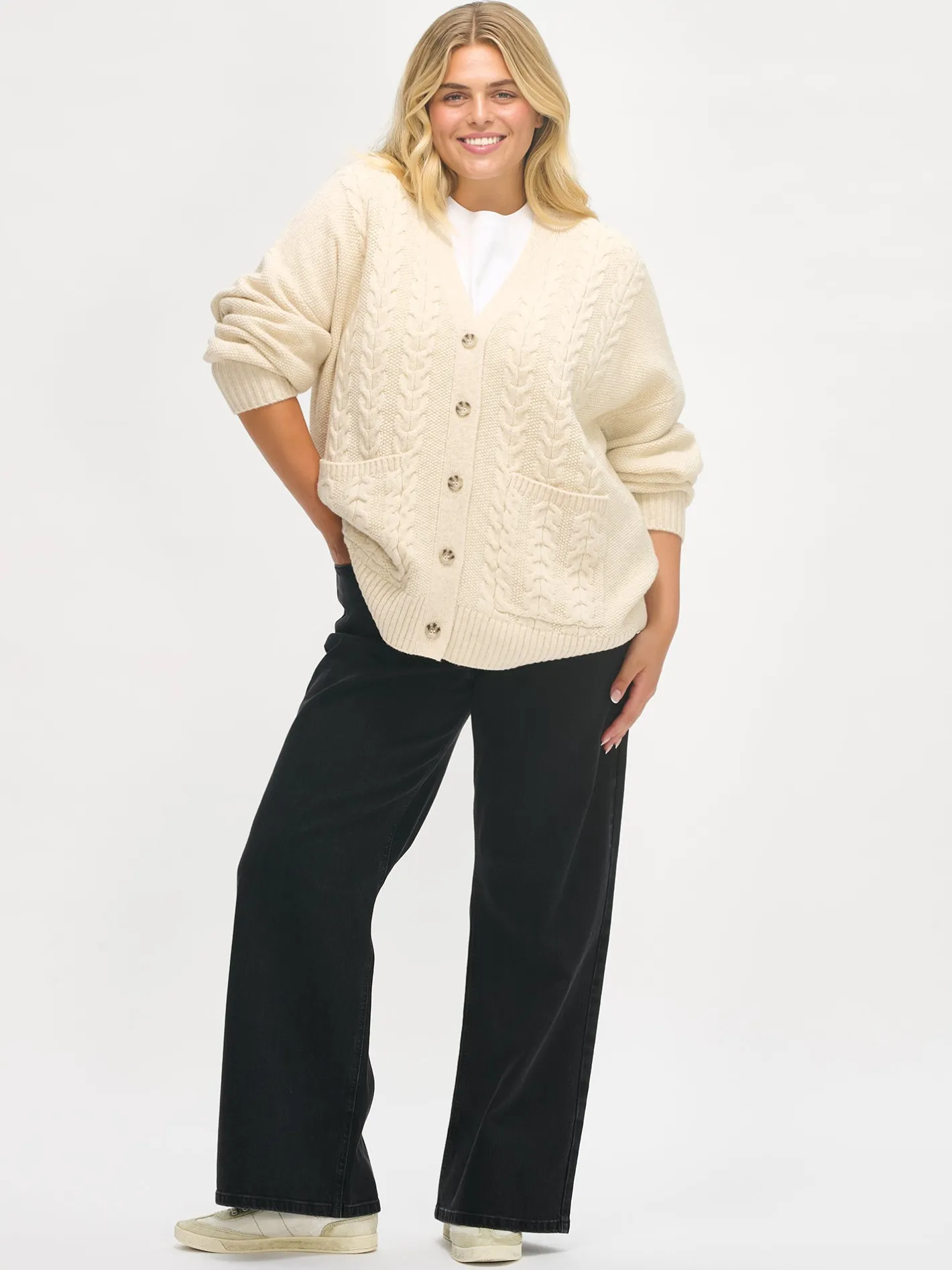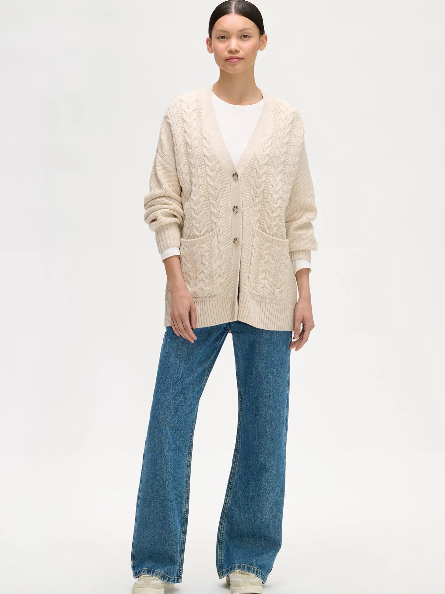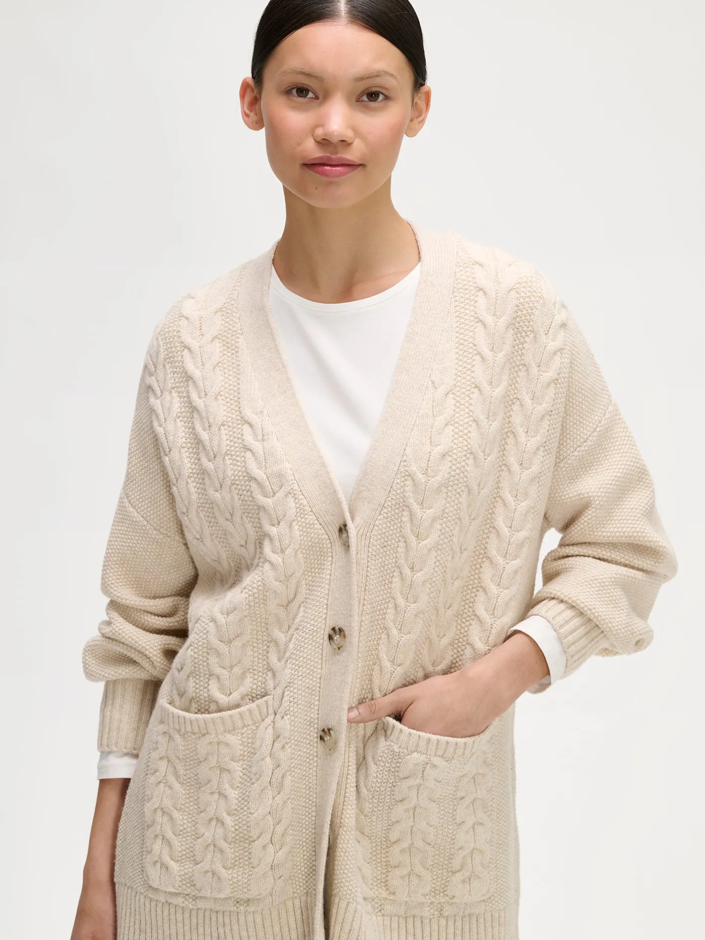 Naisten beige lämmin Palmikko-neuletakki. Muotoonneulotussa neuletakissa on täyspitkät hihat, edessä napitus ja paikkataskut. Neuletakissa on kaunis neulottu palmikkokuvio ja sen pituus koossa M on noin 70 cm. Neulos on pehmeän ja miellyttävän tuntuista villa-polyamidi sekoitetta. Tuotteen valmistuksessa on käytetty sertifioitua villaa.