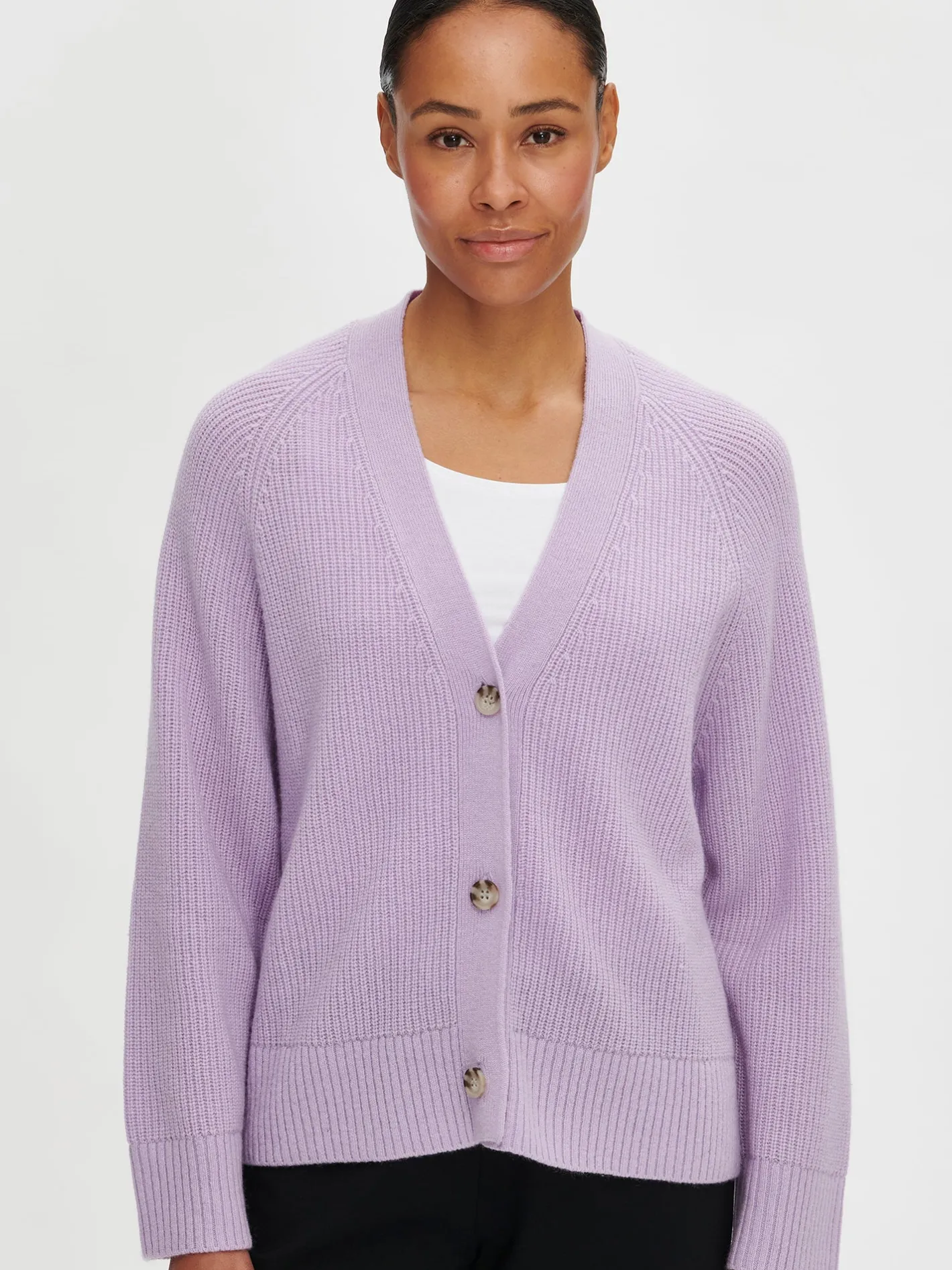Naisten lämmin lila Pamela-neuletakki. Pehmeä villatakki on täydellinen vaate viileämpiin päiviin. Muotoonneulotussa laatikkomaisessa neuletakissa on avara v-pääntie, edessä napitus ja täyspitkät suoralinjaiset raglanhihat. Neuletakin pituus koossa M on noin 60 cm. Neulos on pehmeän ja miellyttävän tuntuista villa-viskoosi-polyamidi sekoitetta. Tuotteen valmistuksessa on käytetty sertifioitua villaa.