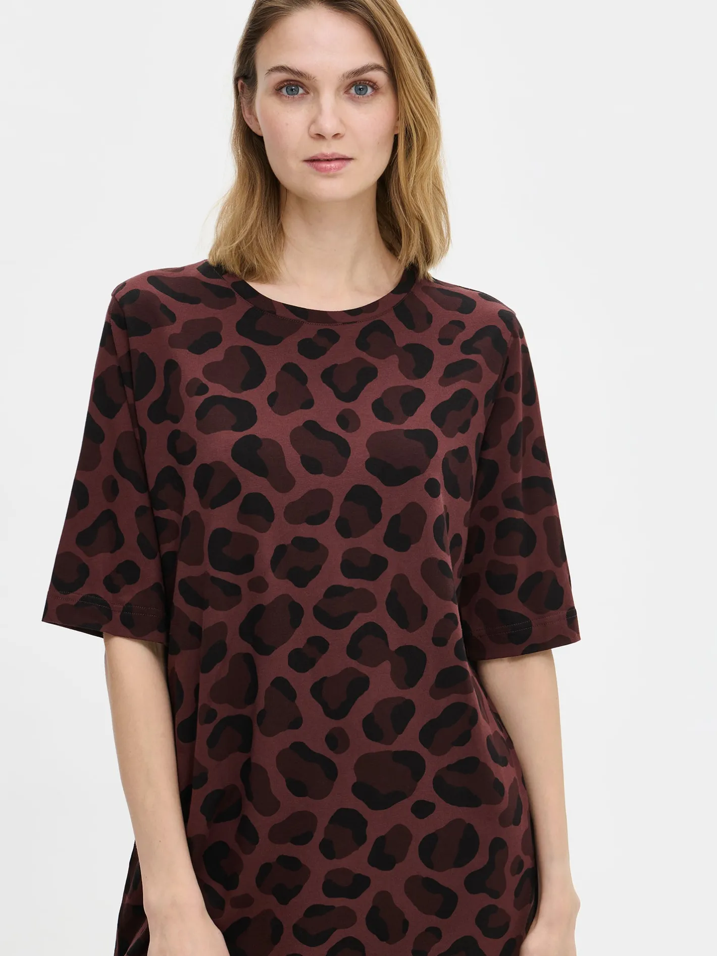 Naisten kuosillinen ruskea suoralinjainen Pantteri-yöpaita puoli pitkillä hihoilla ja pyöreällä pääntiellä. Yöpaidan pituus koossa M on noin 95 cm. Materiaali on laadukasta, iholla miellyttävän pehmeältä tuntuvaa ja helppohoitoista puuvilla-modaalia, joka pysyy hyvänä pesusta toiseen. Mukava ja rento valinta rauhallisiin kotihetkiin tai levollisiin uniin. Näyttävä Pantteri-kuosi tuo pehmeyden keskelle iloa.