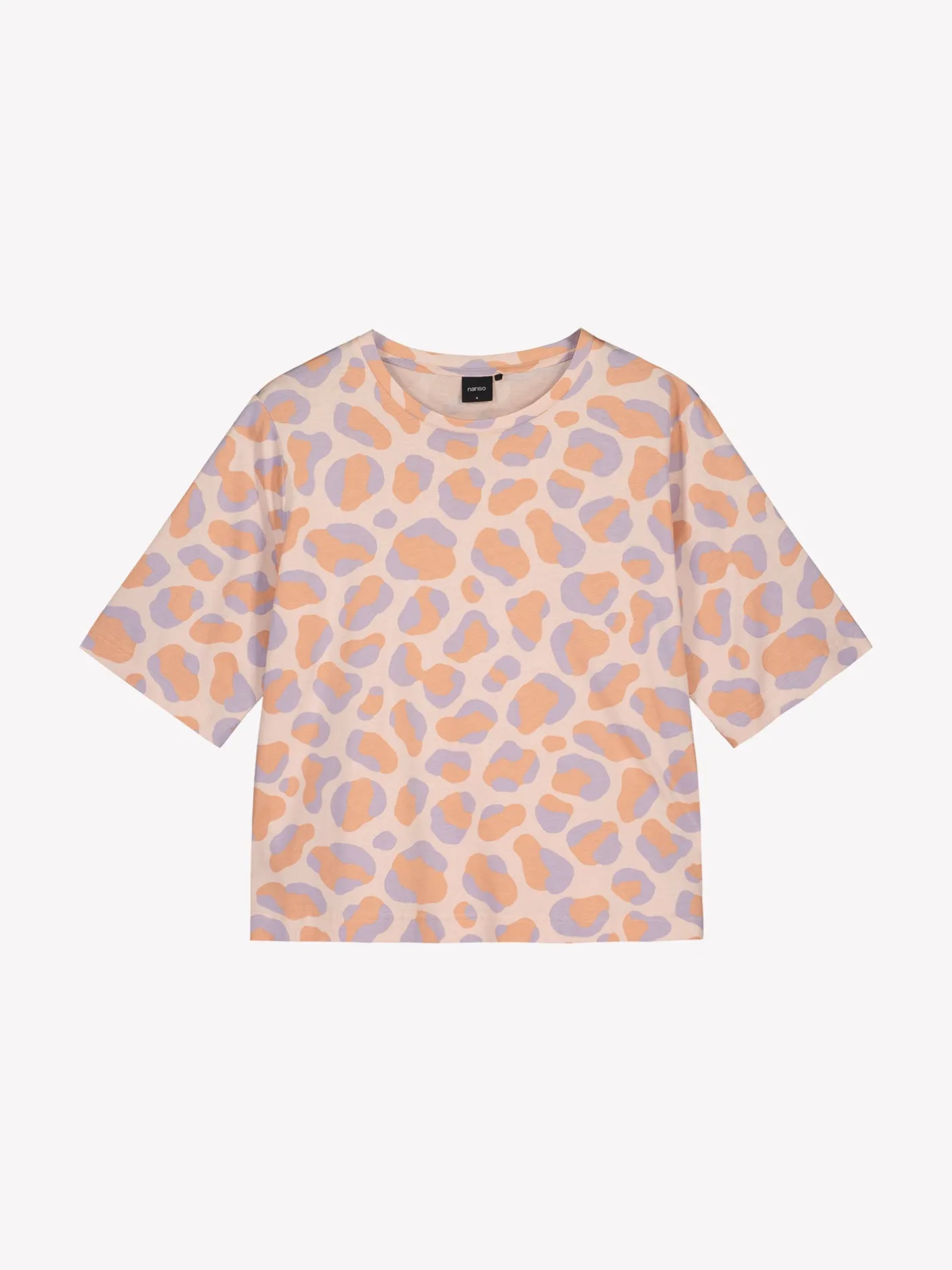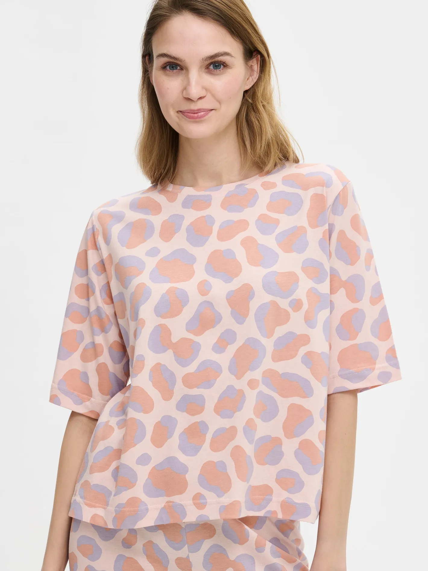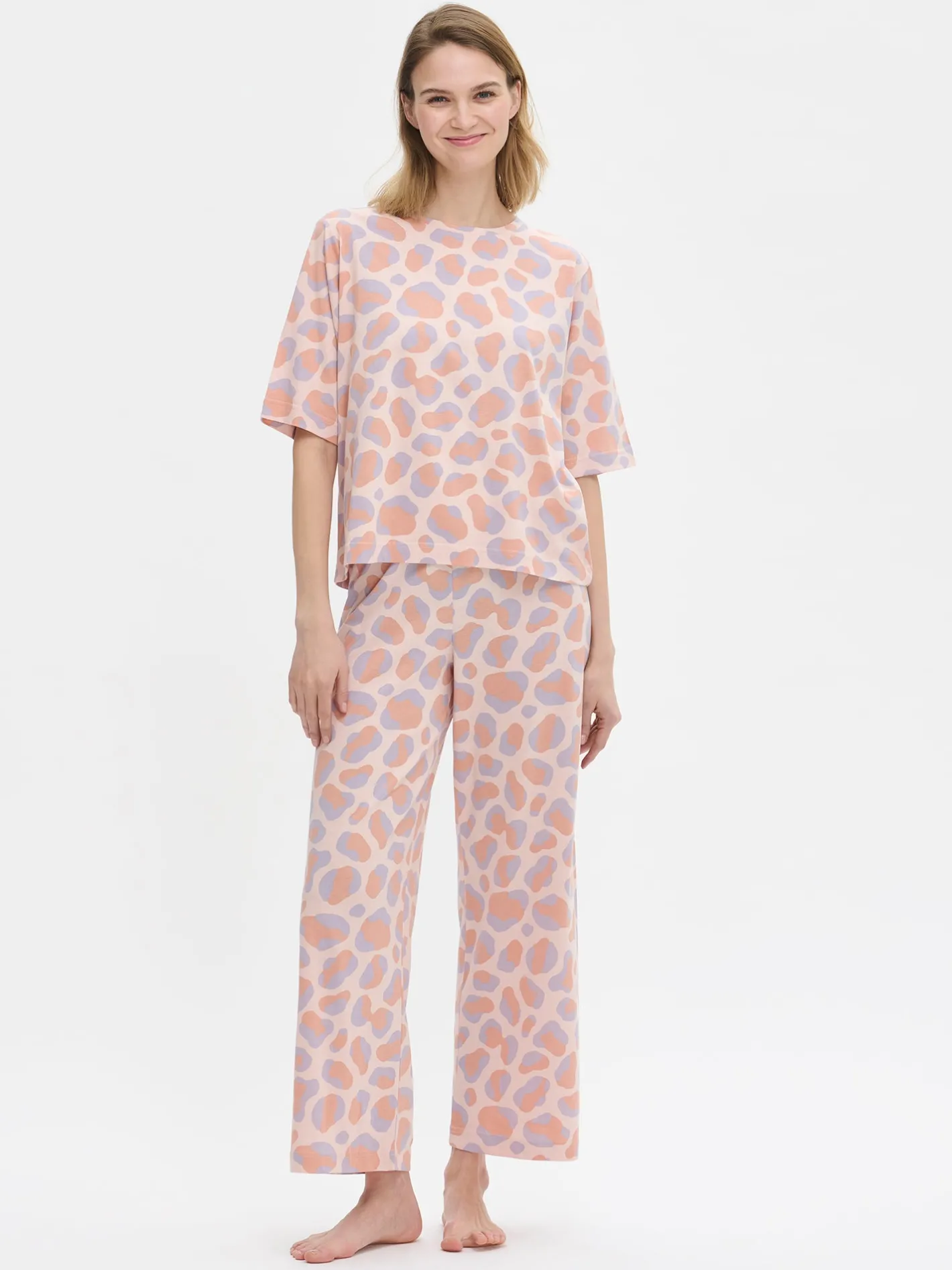 Naisten kuosillinen vaaleanpunainen suoralinjainen Pantteri-t-paita puoli pitkillä hihoilla ja pyöreällä pääntiellä. T-paidan pituus koossa M on noin 62 cm. Materiaali on laadukasta, iholla miellyttävän pehmeältä tuntuvaa ja helppohoitoista puuvilla-modaalia, joka pysyy hyvänä pesusta toiseen. Täydellinen valinta rauhallisiin aamuhetkiin tai rentoon kotipäivään. ja luo iloinen ja mukava asukokonaisuus kotiin.
