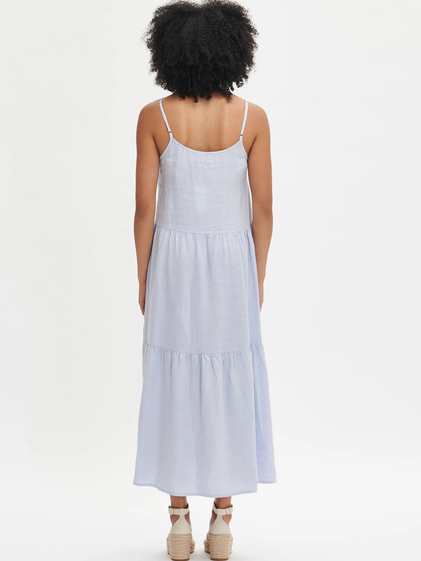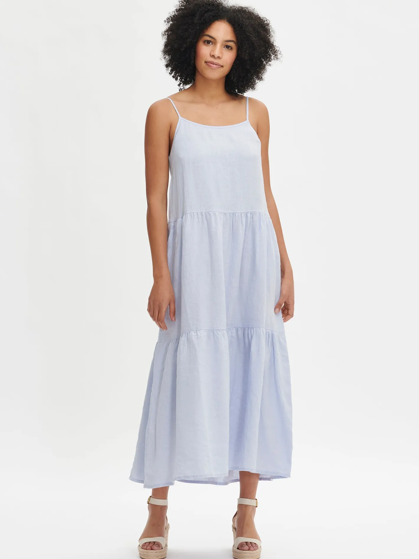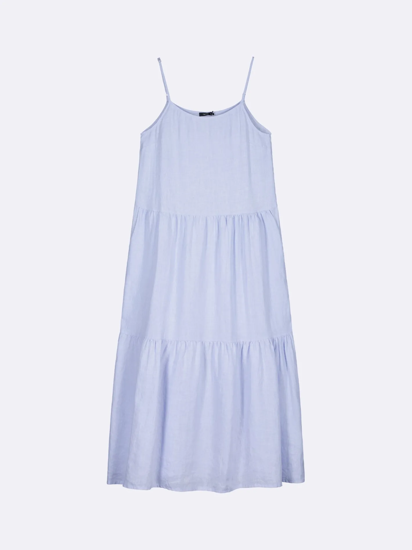 Naisten hihaton vaaleansininen Pellava-mekko. Kauniissa keveässä pellavamekossa on kapeat säädettävät olkaimet ja mekon runsas helma poimuttuu leikkaussaumoihin. Mekon sivuissa on taskut. Mekon pituus koossa 38 on noin 135 cm. Materiaali on kudottua pellavakangasta, joka on kestävää ja hengittävää. Pellavalle on ominaista luonnollinen pieni rypistyminen. Tuote on esipesty tuotannossa, joten se ei kutistu ensimmäisessä pesussa.