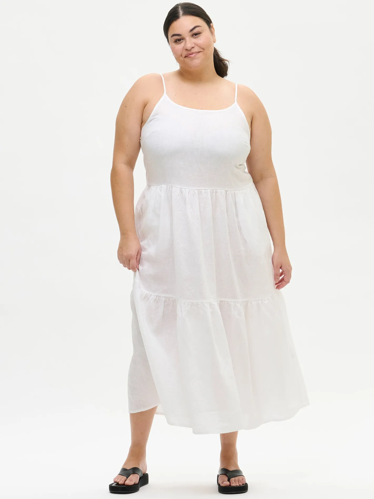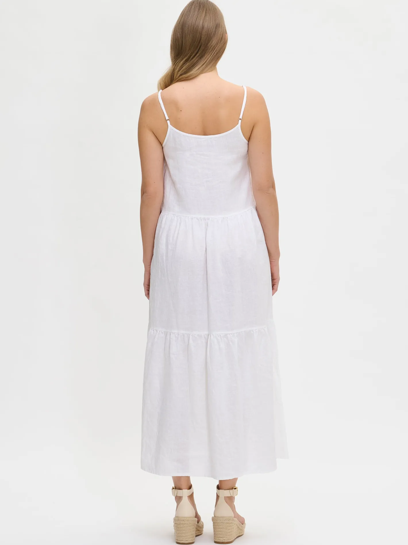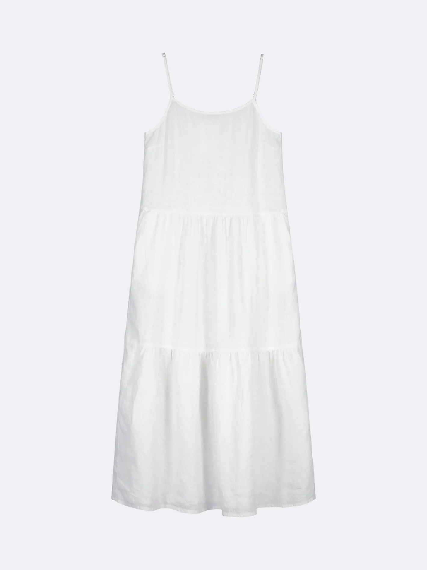 Naisten hihaton valkoinen Pellava-mekko. Kauniissa keveässä pellavamekossa on kapeat säädettävät olkaimet ja mekon runsas helma poimuttuu leikkaussaumoihin. Mekon sivuissa on taskut. Mekon pituus koossa 38 on noin 135 cm. Materiaali on kudottua pellavakangasta, joka on kestävää ja hengittävää. Pellavalle on ominaista luonnollinen pieni rypistyminen.