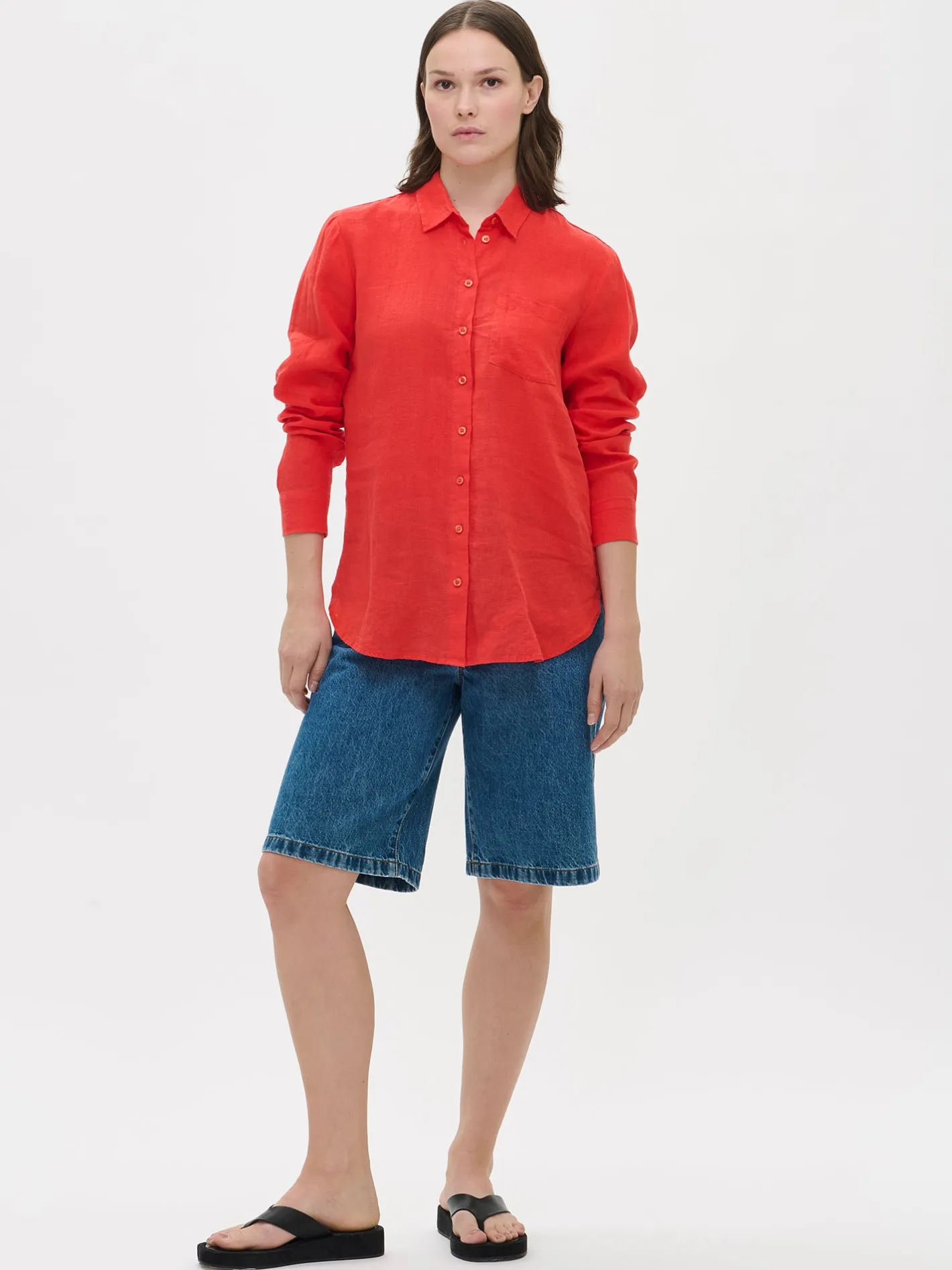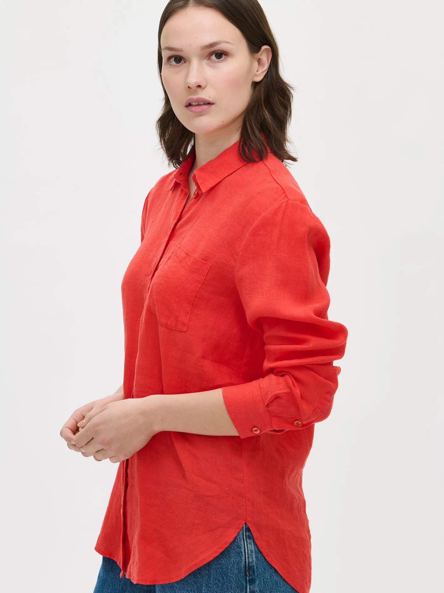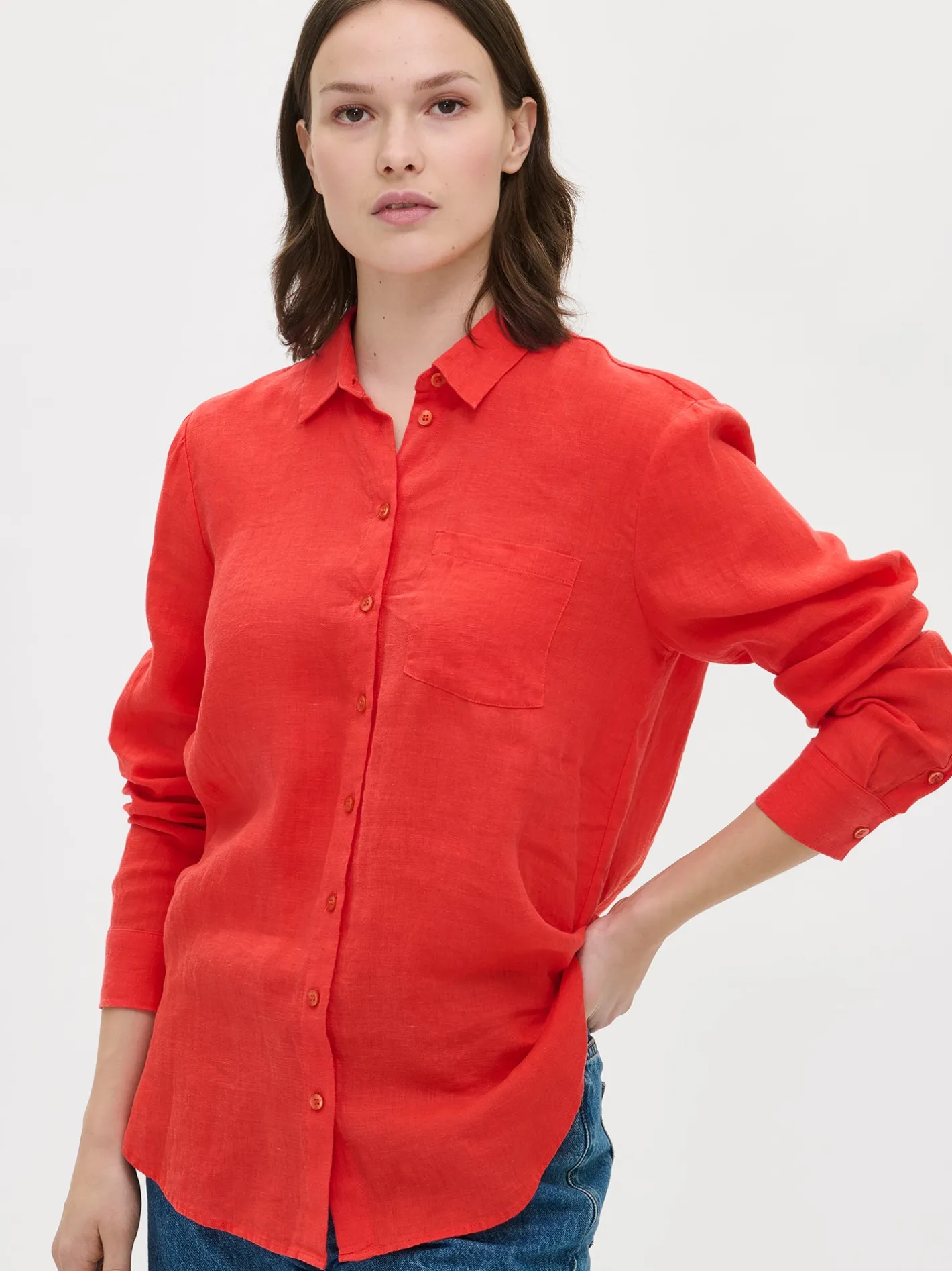 Naisten rento pitkähihainen punainen Pellava-paitapusero. Klassinen kauluspaita on todellinen vaatekaapin kulmakivi. Ajaton kauluspaita hurmaa monikäyttöisyydellään ja siksi se on varma valinta kerta toisensa jälkeen. Tyylikkäässä pellavapaidassa on napit edessä ja rintatasku. Puseron pituus koossa 38 on noin 75 cm. Materiaali on kudottua pellavakangasta, joka on kestävää ja hengittävää. Pellavalle on ominaista luonnollinen pieni rypistyminen. Tuote on esipesty tuotannossa, joten se ei kutistu ensimmäisessä pesussa.