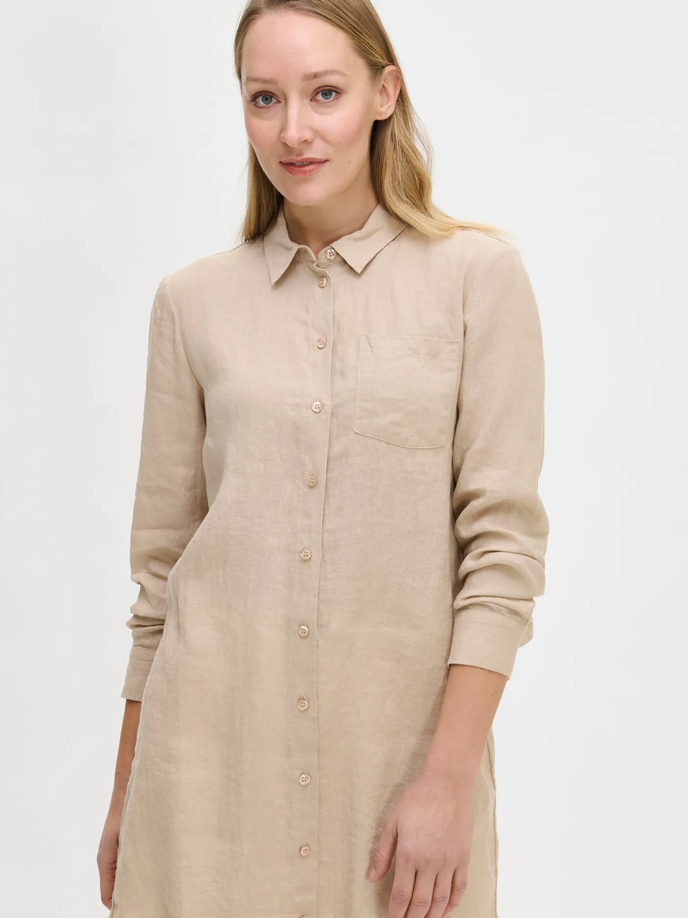 Naisten rento ja pitkä beige Pellava-paitapusero. Klassinen pitkä kauluspaita sopii niin arkeen kuin juhlaan. Tyylikäs pitkähihainen paitapusero on kesän monipuolinen luottovaate – voit pukea sen sekä mekkona, että pitkänä paitapuserona housujen kanssa. Pellavapuserossa on napit edessä ja rintatasku. Pitkä paidan pituus koossa 38 on noin 95 cm. Materiaali on kudottua pellavakangasta, joka on kestävää ja hengittävää. Pellavalle on ominaista luonnollinen pieni rypistyminen. Tuote on esipesty tuotannossa, joten se ei kutistu ensimmäisessä pesussa.