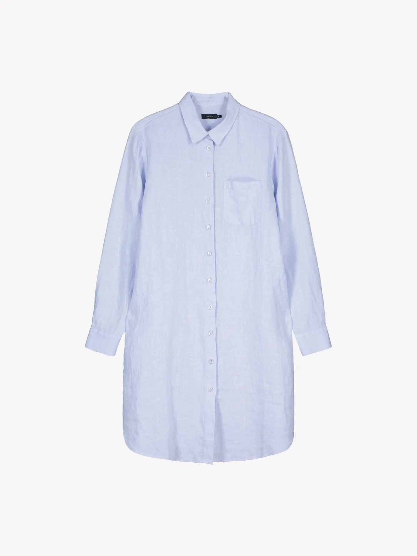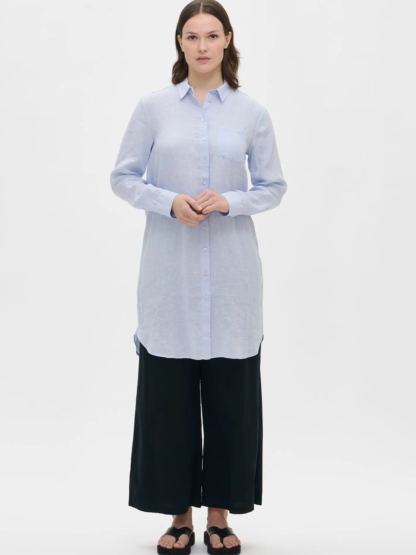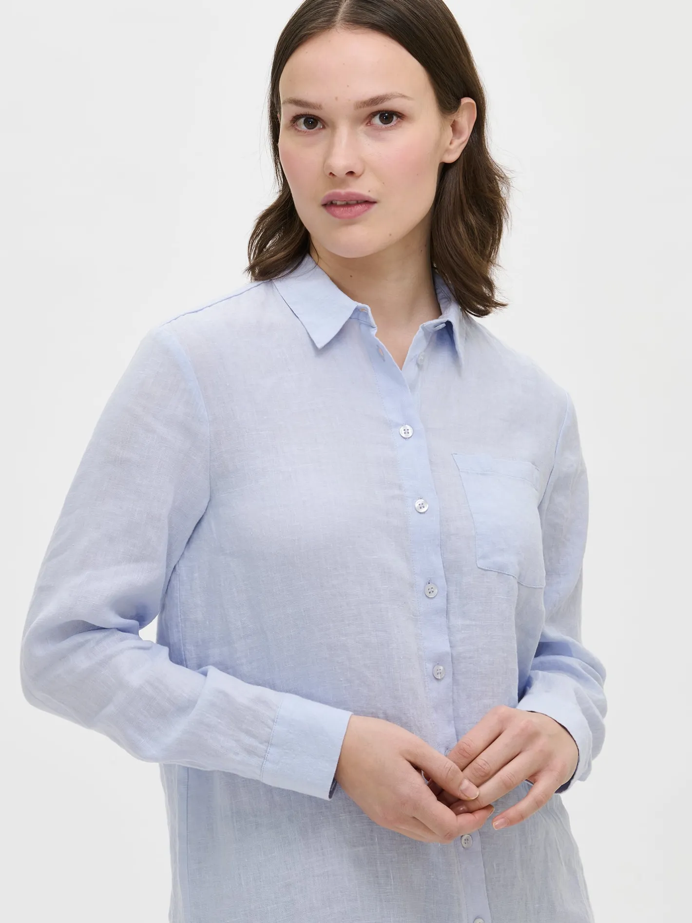 Naisten rento ja pitkä vaaleansininen Pellava-paitapusero. Klassinen pitkä kauluspaita sopii niin arkeen kuin juhlaan. Tyylikäs pitkähihainen paitapusero on kesän monipuolinen luottovaate – voit pukea sen sekä mekkona, että pitkänä paitapuserona housujen kanssa. Pellavapuserossa on napit edessä ja rintatasku. Pitkä paidan pituus koossa 38 on noin 95 cm. Materiaali on kudottua pellavakangasta, joka on kestävää ja hengittävää. Pellavalle on ominaista luonnollinen pieni rypistyminen. Tuote on esipesty tuotannossa, joten se ei kutistu ensimmäisessä pesussa.
