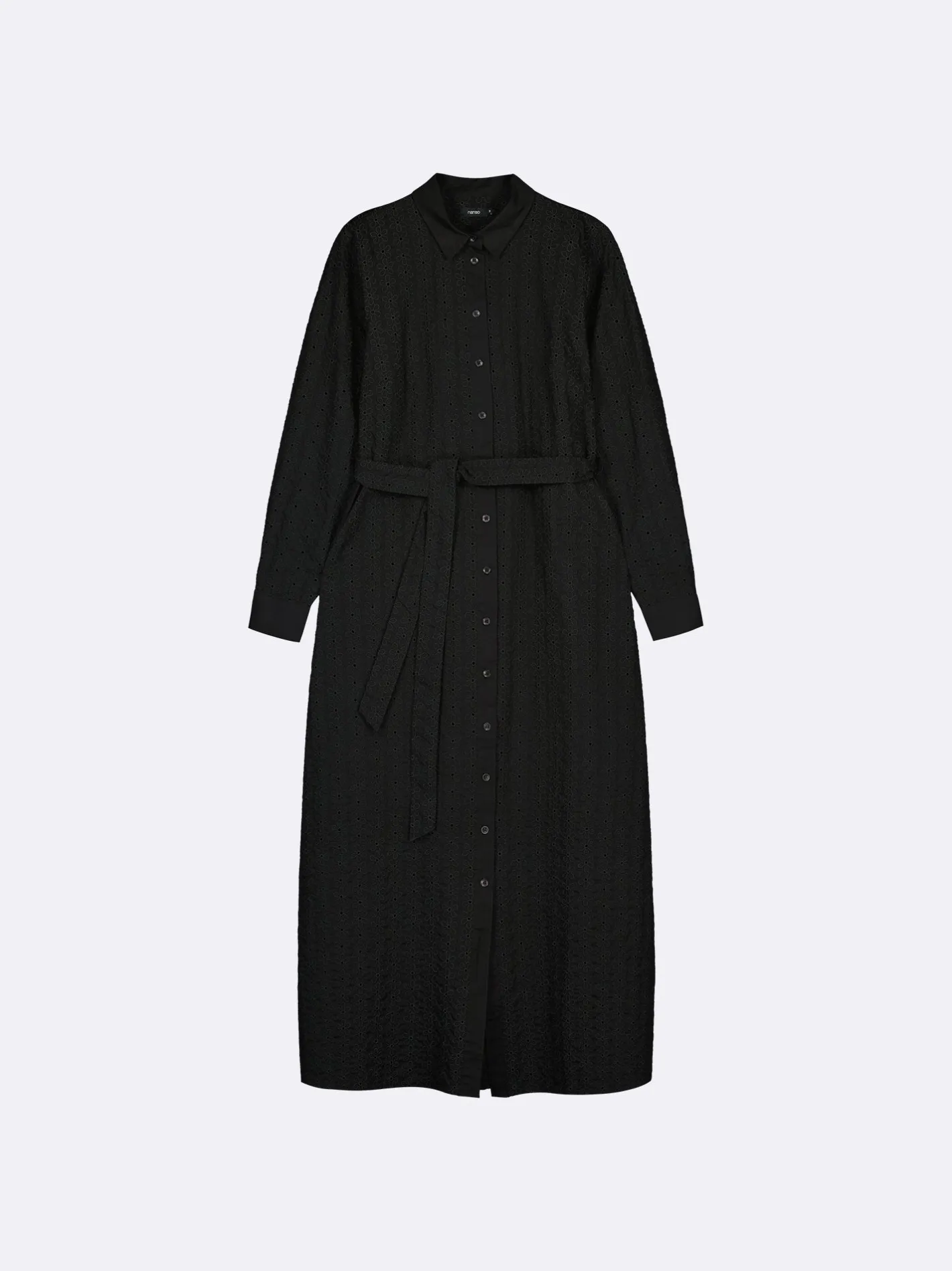 Naisten ihastuttava musta Petra-paitapuseromekko. Istuvassa paitapuseromekossa on napitus edessä ja hihat ovat täyspitkät. Hihansuissa on nappihalkiot ja mekon vyötäröllä on irroitettava vyö. Mekon sivuissa on taskut. Mekon takana on kaarroke, jonka alapuolella on poimutusta. Mekon pituus koossa 38 on noin 135 cm. Materiaali on kudottua puuvilla-popliinikangasta, jossa on kaunis brodeeraus. Materiaali on kevyttä ja hengittävää. Petra-paitapuseromekko yhdistyy täydellisesti kanssa. Tyylikäs mekko on täydellinen valinta kesän juhliin, yhdistäen mukavuuden ja eleganssin vaivattomasti.