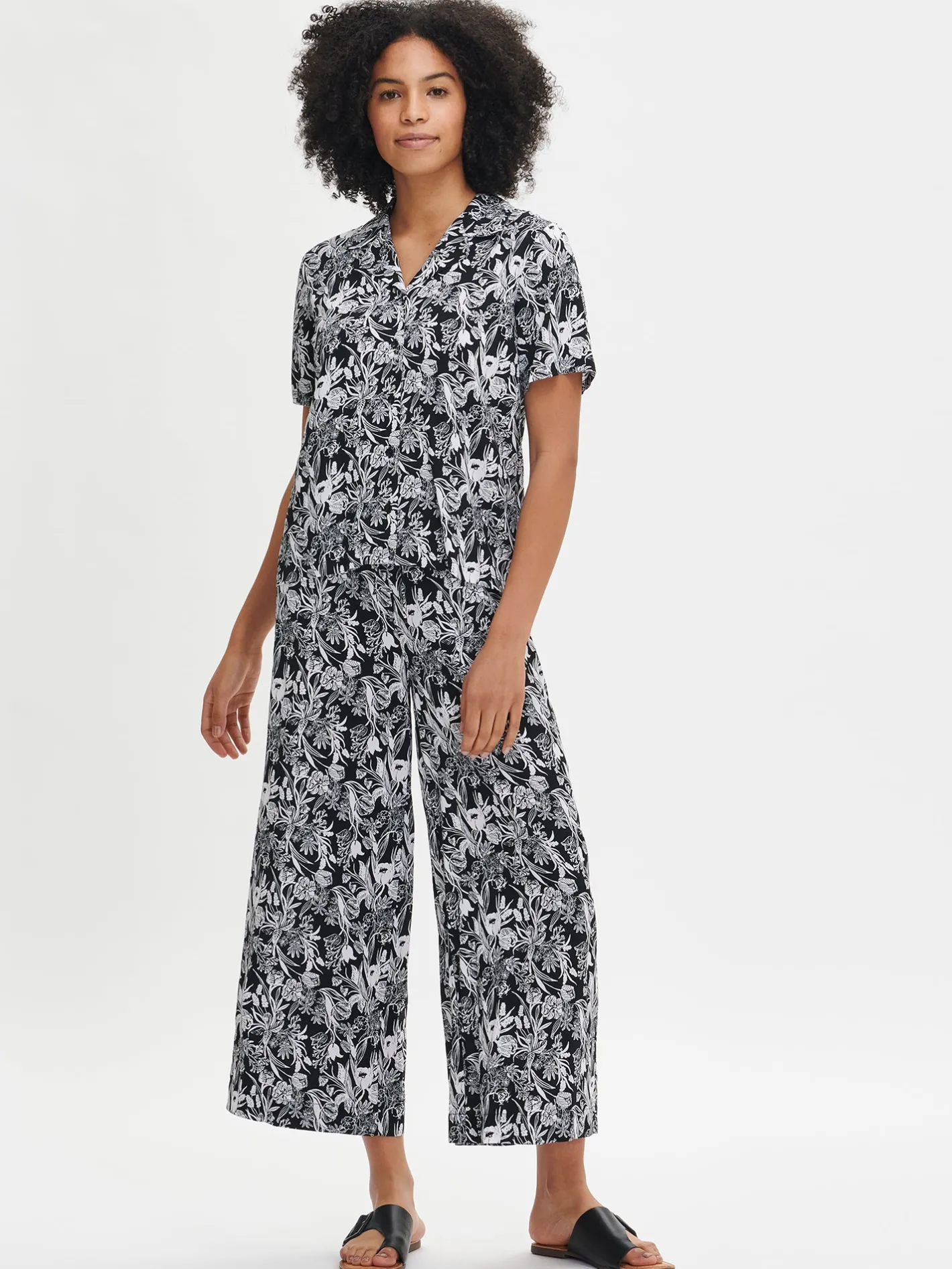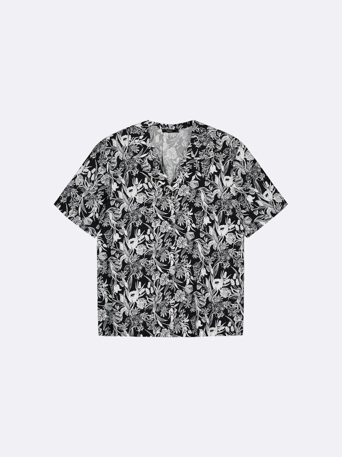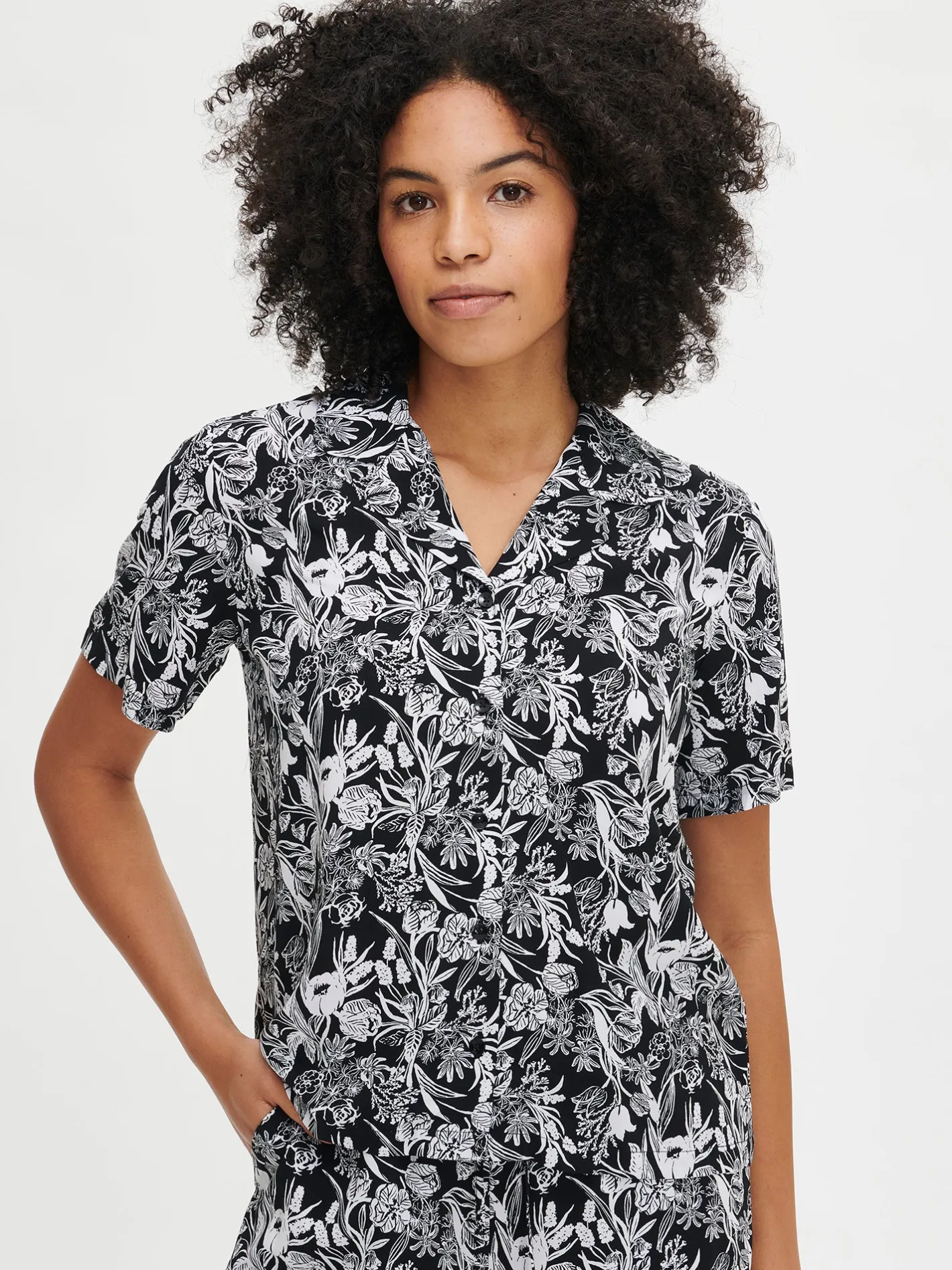 Naisten kuosillinen mustavalkoinen Pieni Floristi -paitapusero kauniilla kukkakuviolla. Rennossa suoralinjaisessa paitapuserossa on taitekaulus, nappilista, rintamuotolaskokset ja laskos selässä. Hihat ovat 1/4 pituiset ja helma on suora. Paitapuseron pituus koossa 38 on noin 62 cm. Materiaali on kauniisti laskeutuvaa 100 % viskoosikangasta. Materiaalille on ominaista 3-5 % kutistuminen ensimmäisessä pesussa.