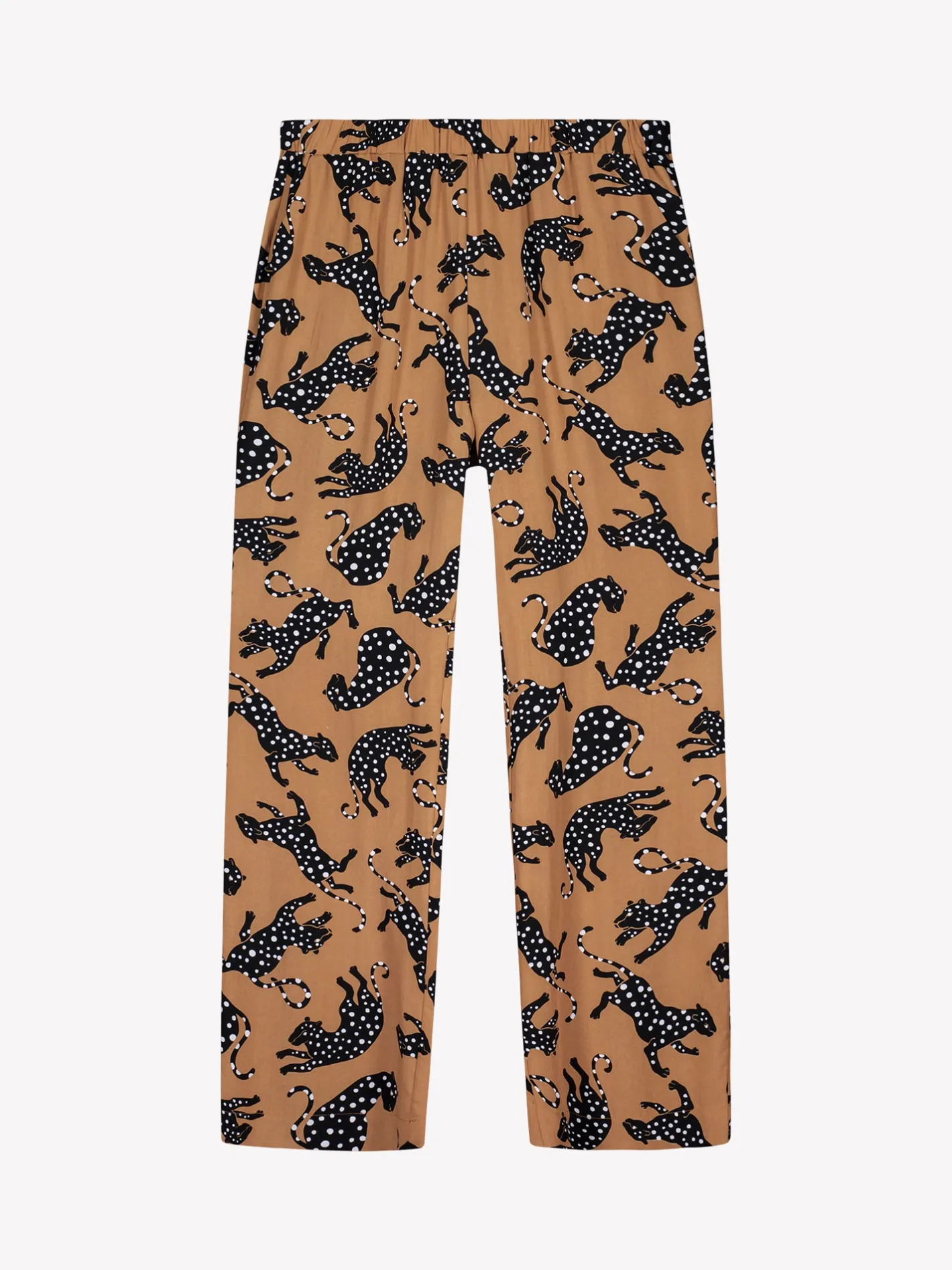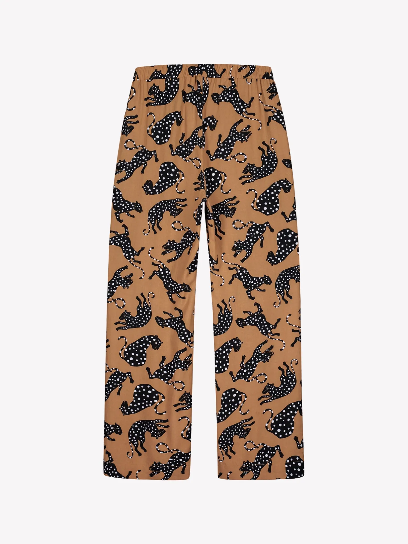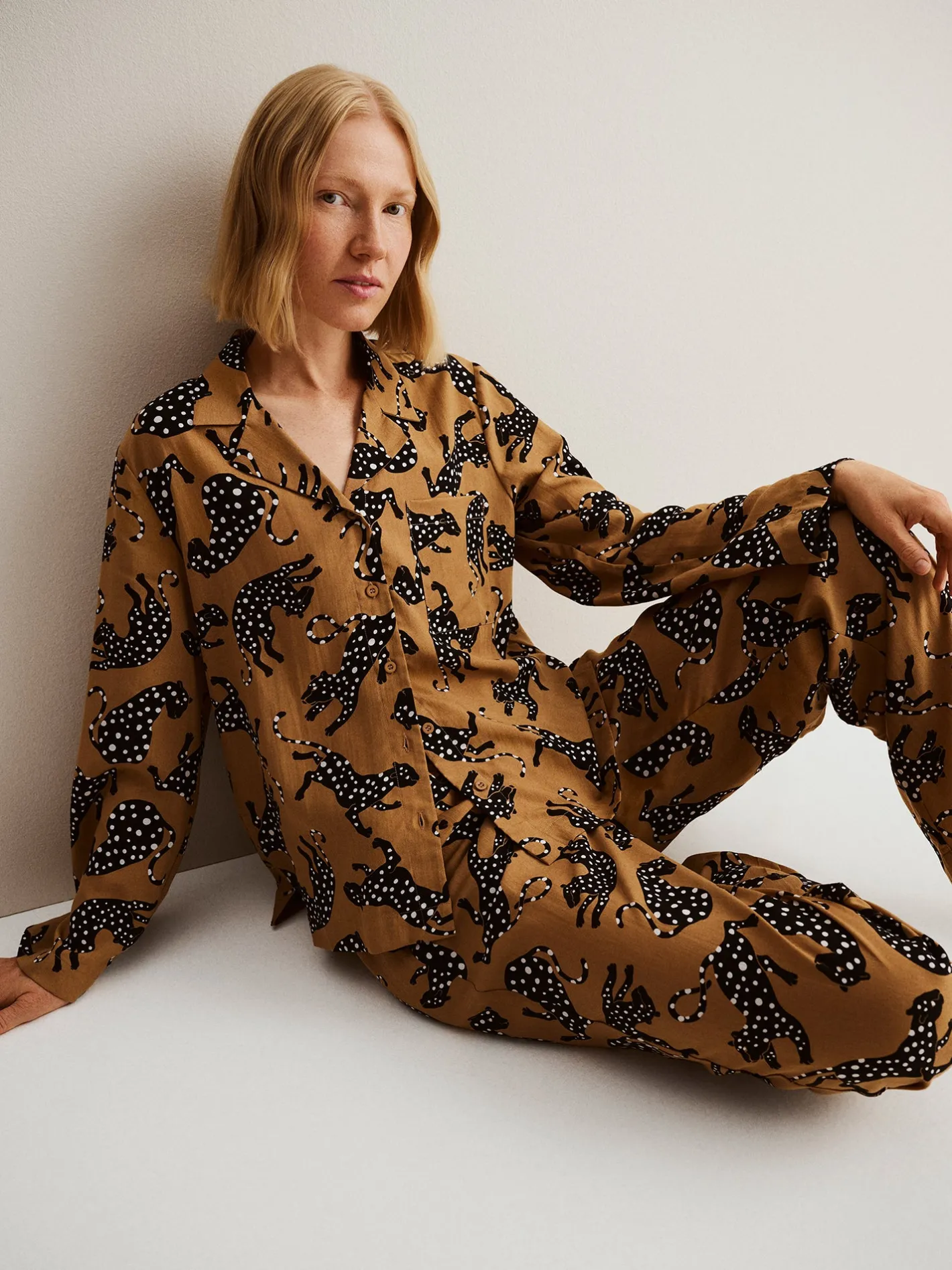 Naisten kuosilliset beiget Pieni Leonora-housut sivutaskuilla. Vyötäröllä on mukava ja siisti kuminauharakenne. Housuissa on suorat täyspitkät lahkeet. Materiaali on ylellistä ja ihanan kevyttä kudottua lyocell-popliinikangasta. Täydellinen valinta pehmeisiin kotihetkiin tai rauhallisiin aamuhetkiin. ja luo harmoninen ja huoleton asukokonaisuus kotiin. Materiaalille on ominaista 3-5% kutistuminen ensimmäisessä pesussa.