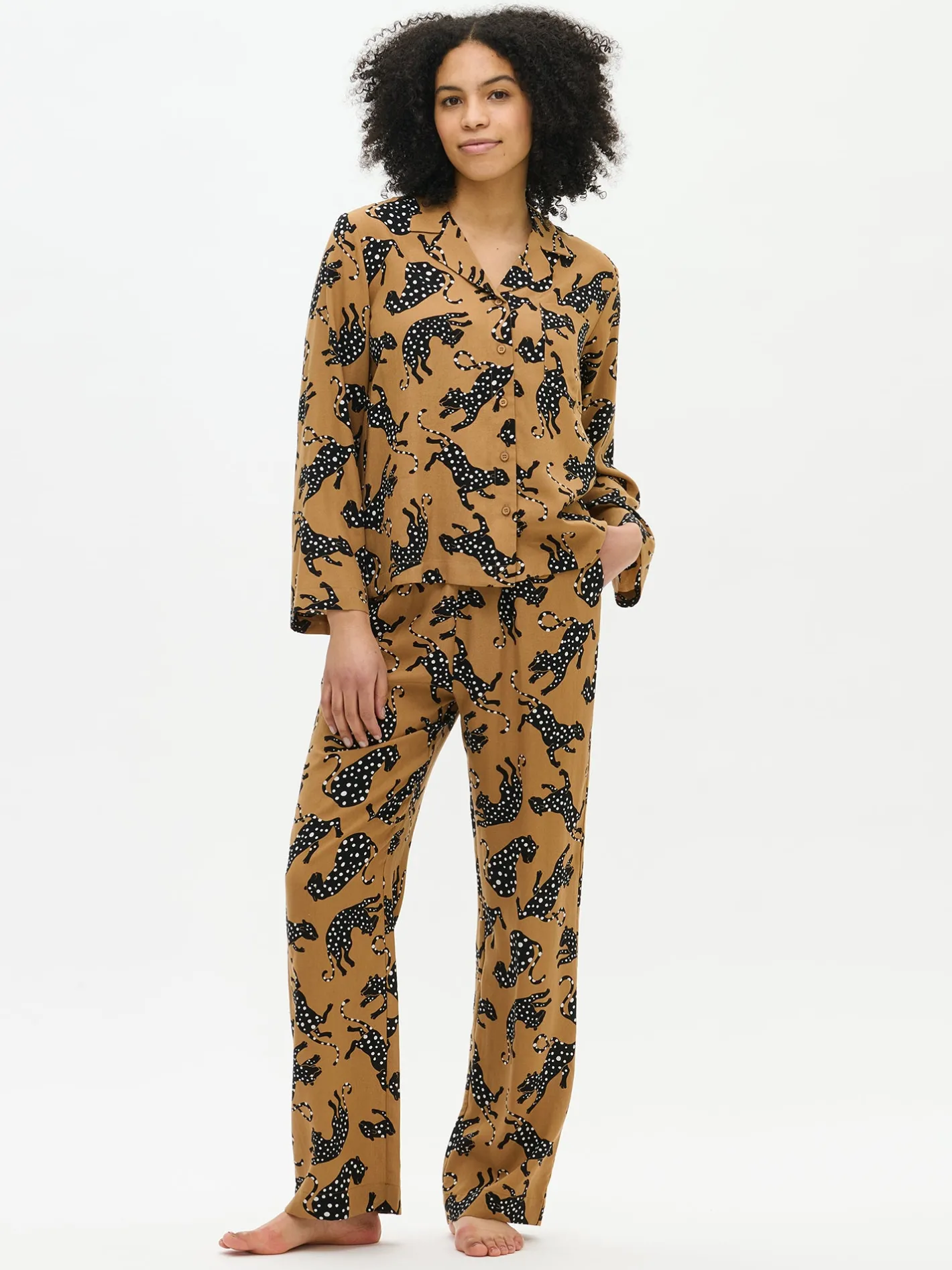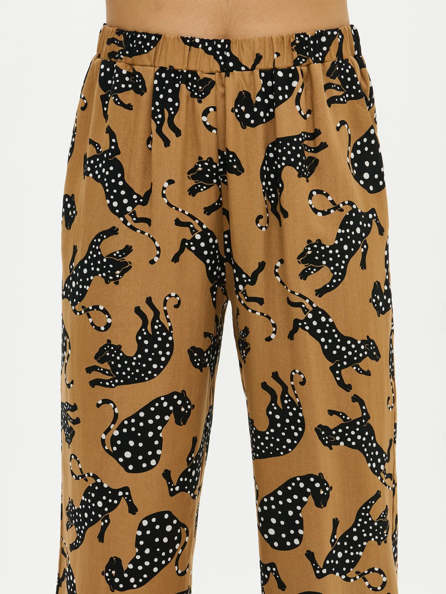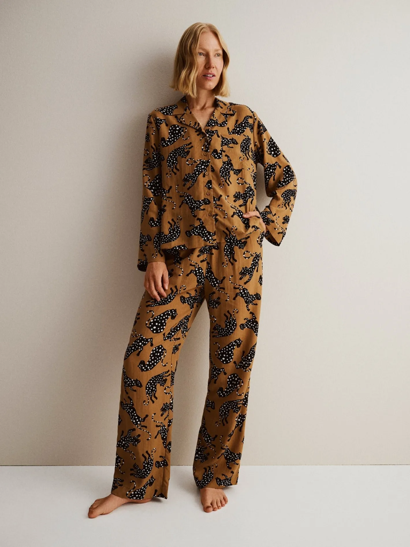 Naisten kuosilliset beiget Pieni Leonora-housut sivutaskuilla. Vyötäröllä on mukava ja siisti kuminauharakenne. Housuissa on suorat täyspitkät lahkeet. Materiaali on ylellistä ja ihanan kevyttä kudottua lyocell-popliinikangasta. Täydellinen valinta pehmeisiin kotihetkiin tai rauhallisiin aamuhetkiin. ja luo harmoninen ja huoleton asukokonaisuus kotiin. Materiaalille on ominaista 3-5% kutistuminen ensimmäisessä pesussa.