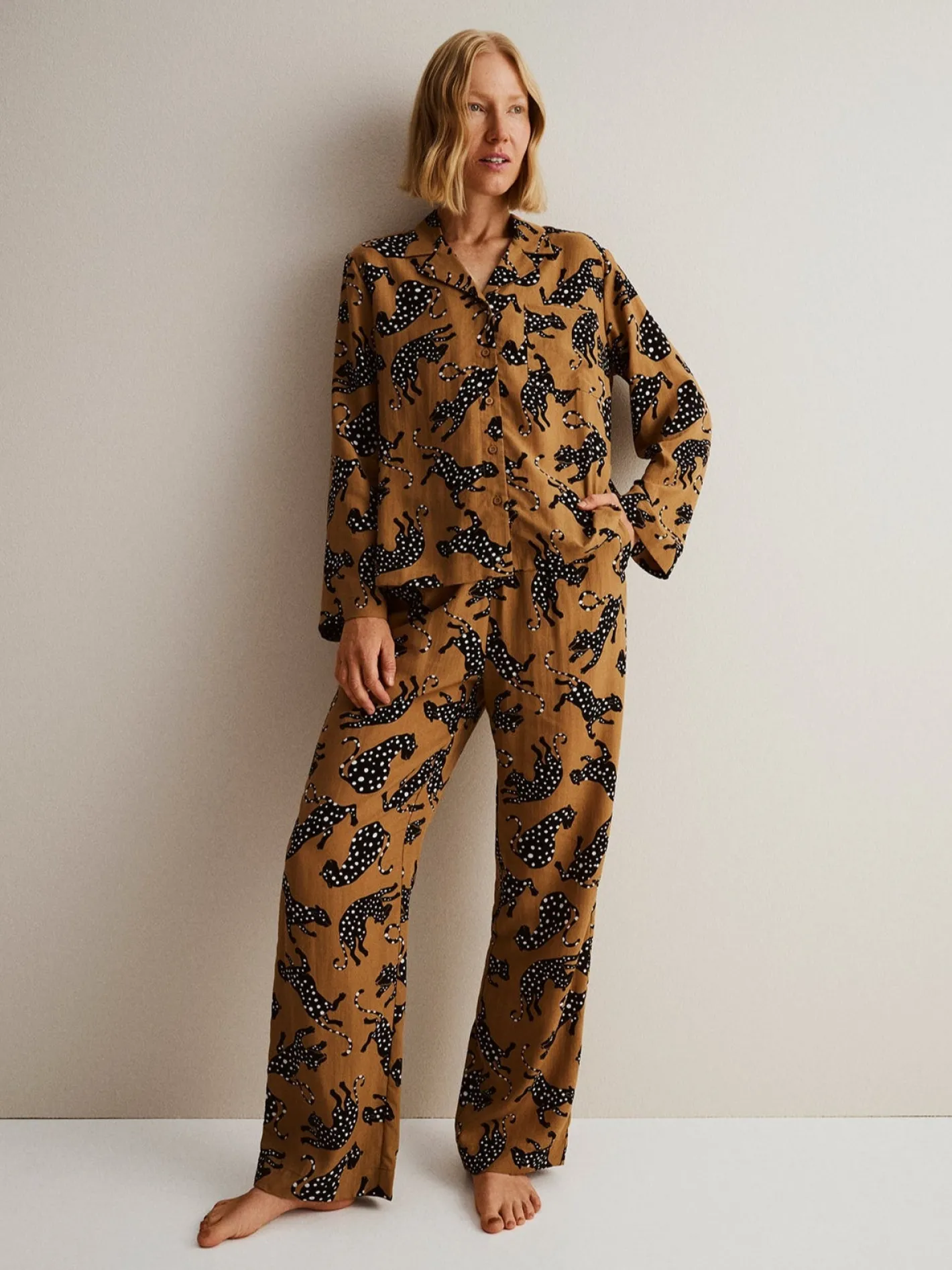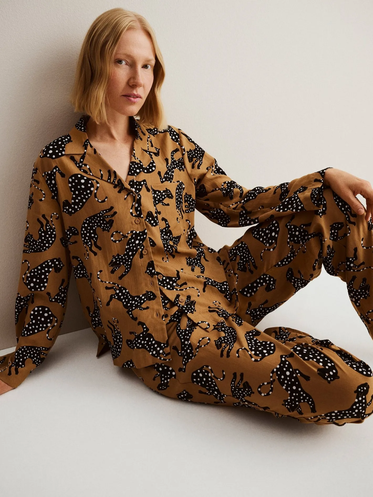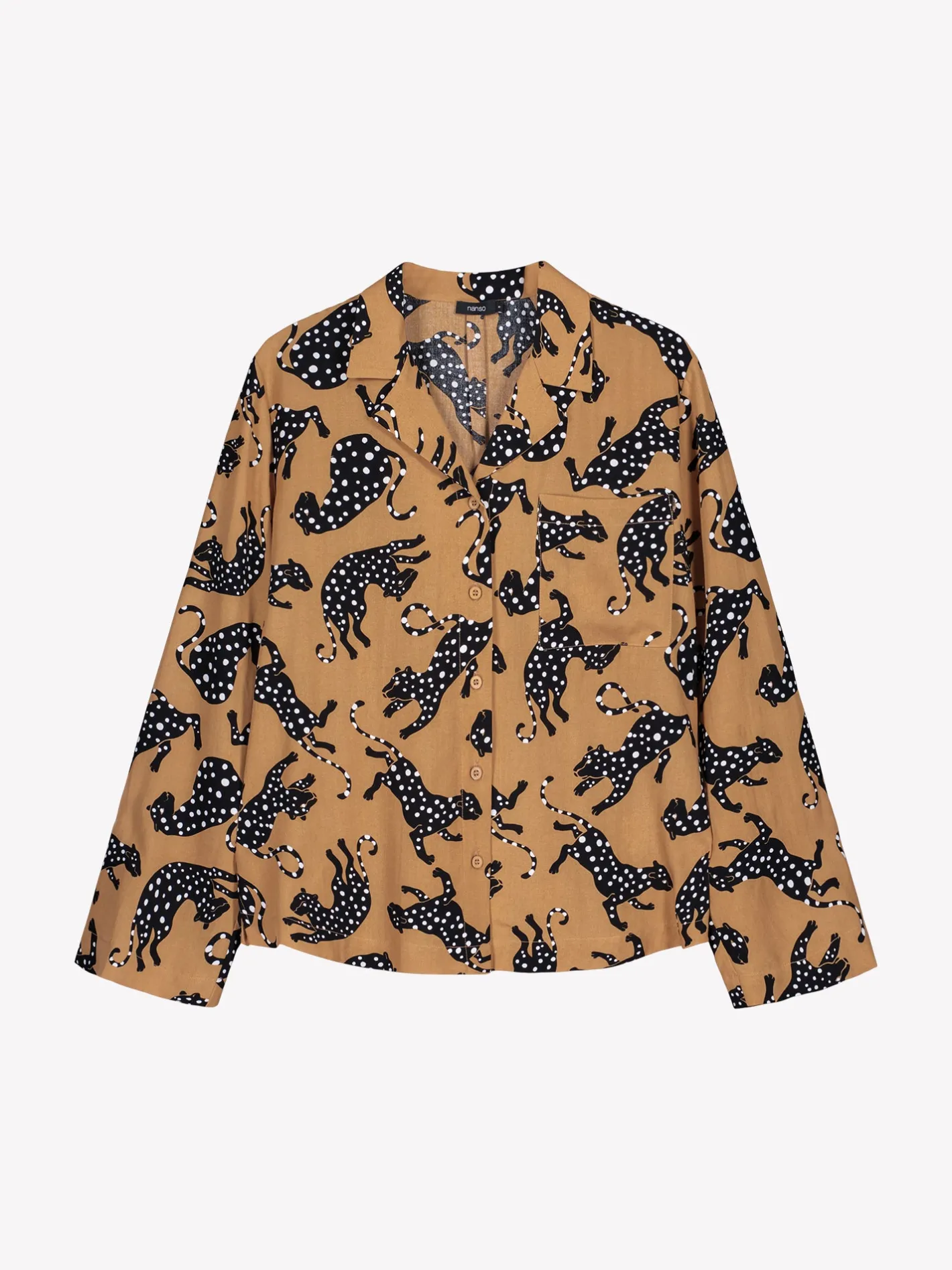 Naisten kuosillinen beige Pieni Leonora-pusero. Pitkähihaisessa puserossa on kauniisti muotoiltu kaulus, nappilista, rintatasku ja suora helma sivuhalkioilla. A-linjaisen puseron hihat ovat täyspitkät. Puseron pituus koossa M on noin 65 cm. Materiaali on ylellistä ja ihanan kevyttä kudottua lyocell-popliinikangasta. Täydellinen valinta rauhallisiin aamuhetkiin tai pehmeään kotityyliin. ja luo näyttävä mutta rento asukokonaisuus. Materiaalille on ominaista 3-5% kutistuminen ensimmäisessä pesussa.