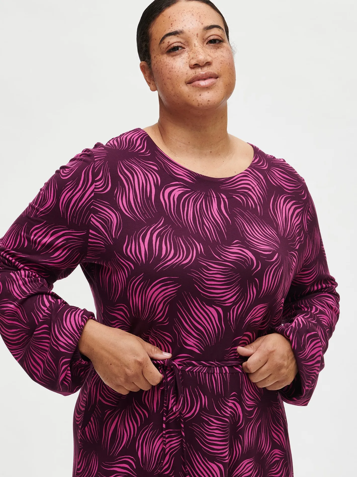 Naisten kuosillinen viininpunainen Pieni Tuija-mekko. Mekossa on alavaralla viimeistelty pyöreä pääntie ja sivutaskut. Täyspitkät hihat poimuttuvat kauniisti hihansuiden kuminauhakäänteeseen. Mekon vyötäröllä on poikkisauma, kapea irroitettava vyö ja kellotettu helma. Mekon pituus koossa M on noin 112 cm. Tuote on valmistettu LENZING™ ECOVERO™-viskoosista. Materiaali on laadukasta, miellyttävän tuntuista ja laskeutuvaa viskoosi-elastaani-neulosta, joka pysyy hyvänä pesusta toiseen. Materiaalille on ominaista 3-5% kutistuminen ensimmäisessä pesussa.
