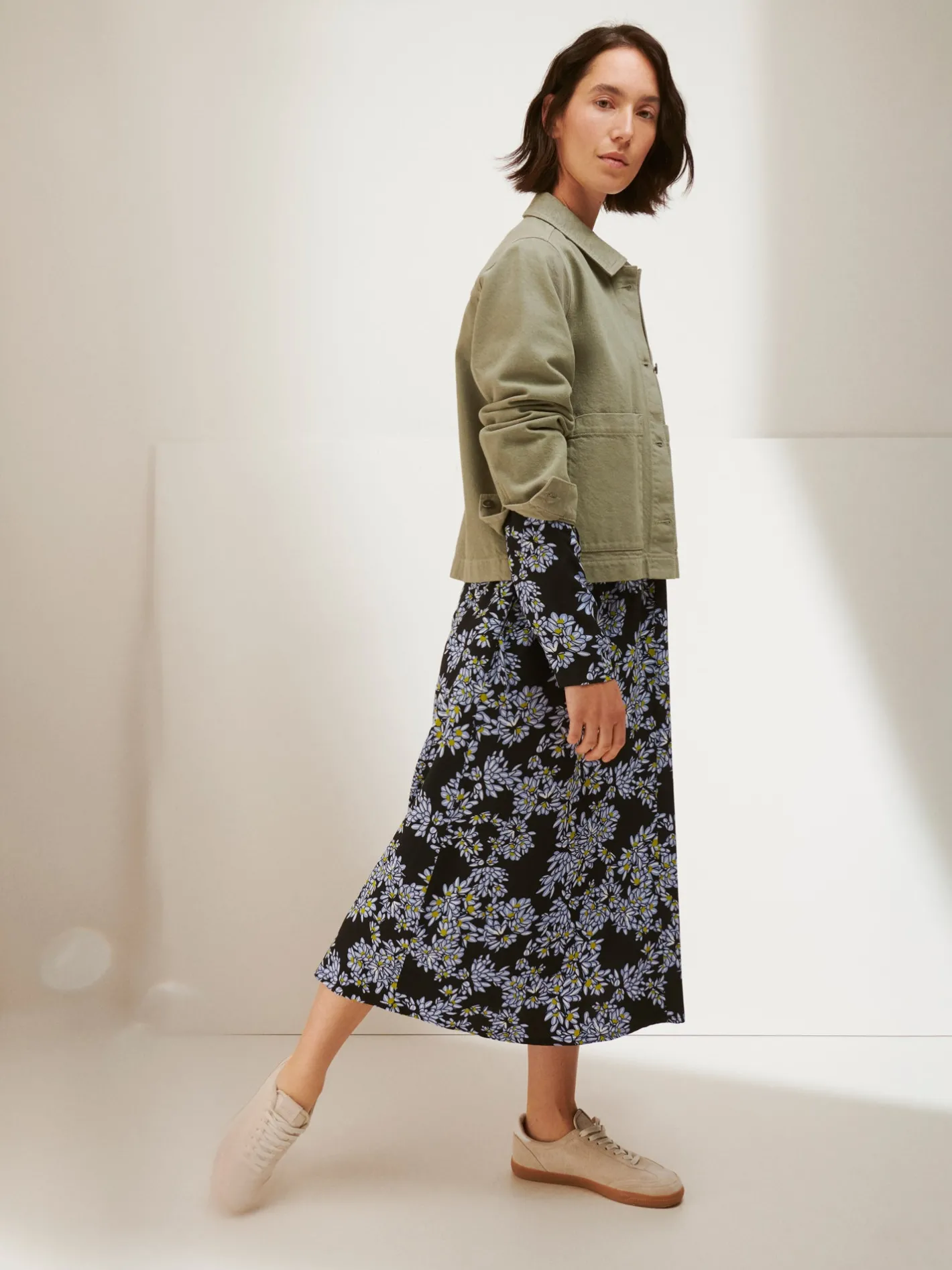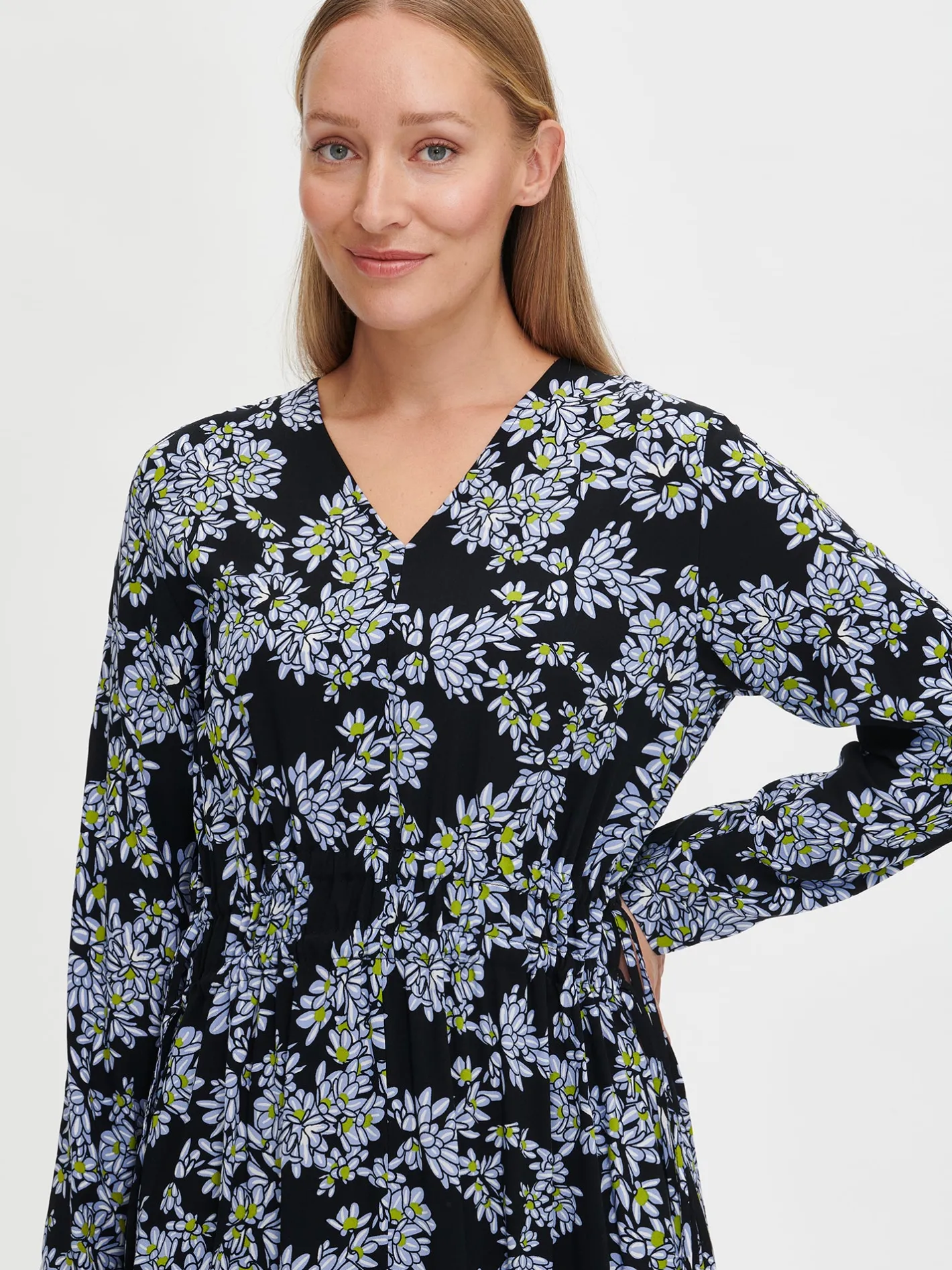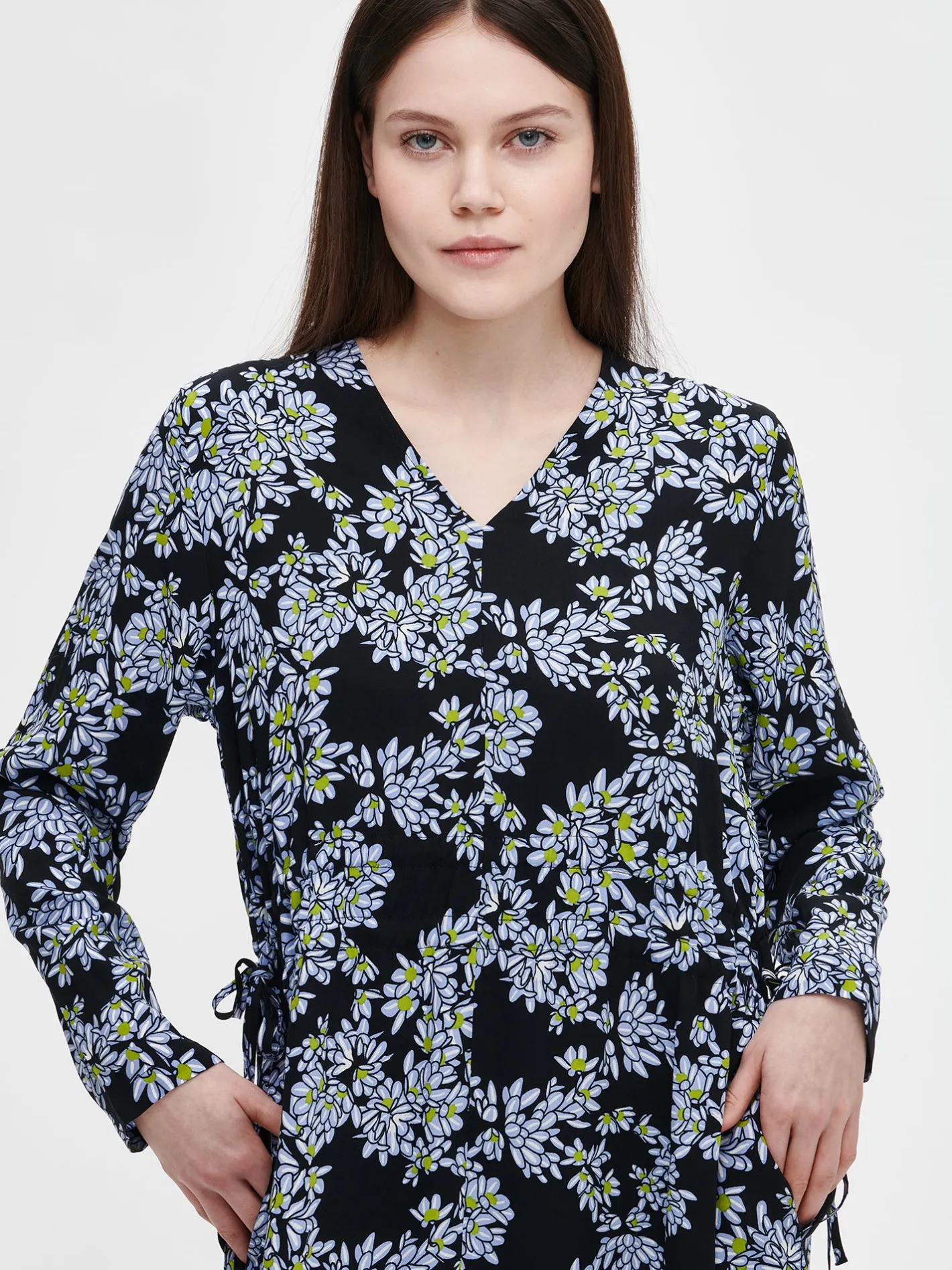 Naisten kuosillinen musta Pihlaja-mekko. Mekossa on V- pääntie, sivutaskut ja täyspitkät hihat. Vyötäröllä on kaksi nyörikujaa, joiden nyörit saa kiristettyä sivuilta. Mekon pituus koossa 38 on noin 125 cm. Materiaali on kauniisti laskeutuvaa kudottua 100 % viskoosikangasta. Materiaalille on ominaista 3-5% kutistuminen ensimmäisessä pesussa.
