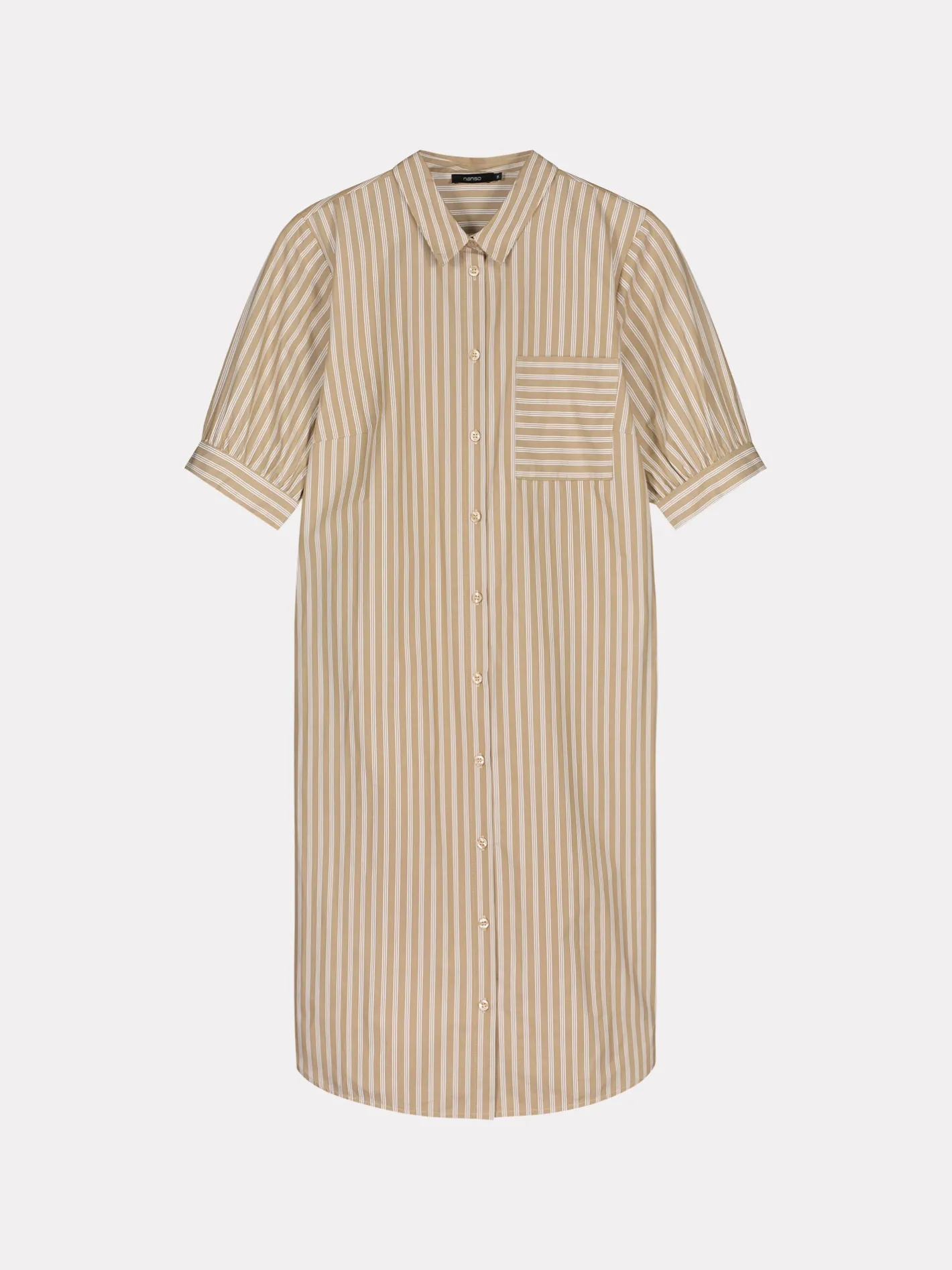 Naisten raidallinen ruskea Piirto-paitamekko. Tyylikkään paitamekon voi pukea arkeen tai juhlaan. Mekossa on kaulus, edessä napitus, rintamuotolaskokset ja paikkatasku. 2/4 pituiset hihat poimuttuvat kauniisti hihansuun leveän kaitaleen yläpuolella. Mekossa on sivutaskut ja pyöristetty helma. Mekon pituus koossa 38 on noin 105 cm. Materiaali on kevyttä kudottua puuvillakangasta.