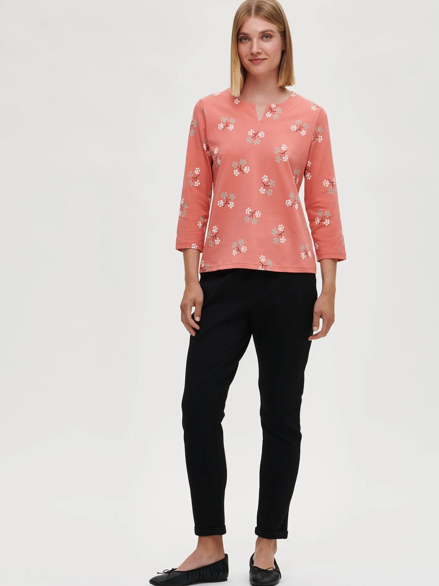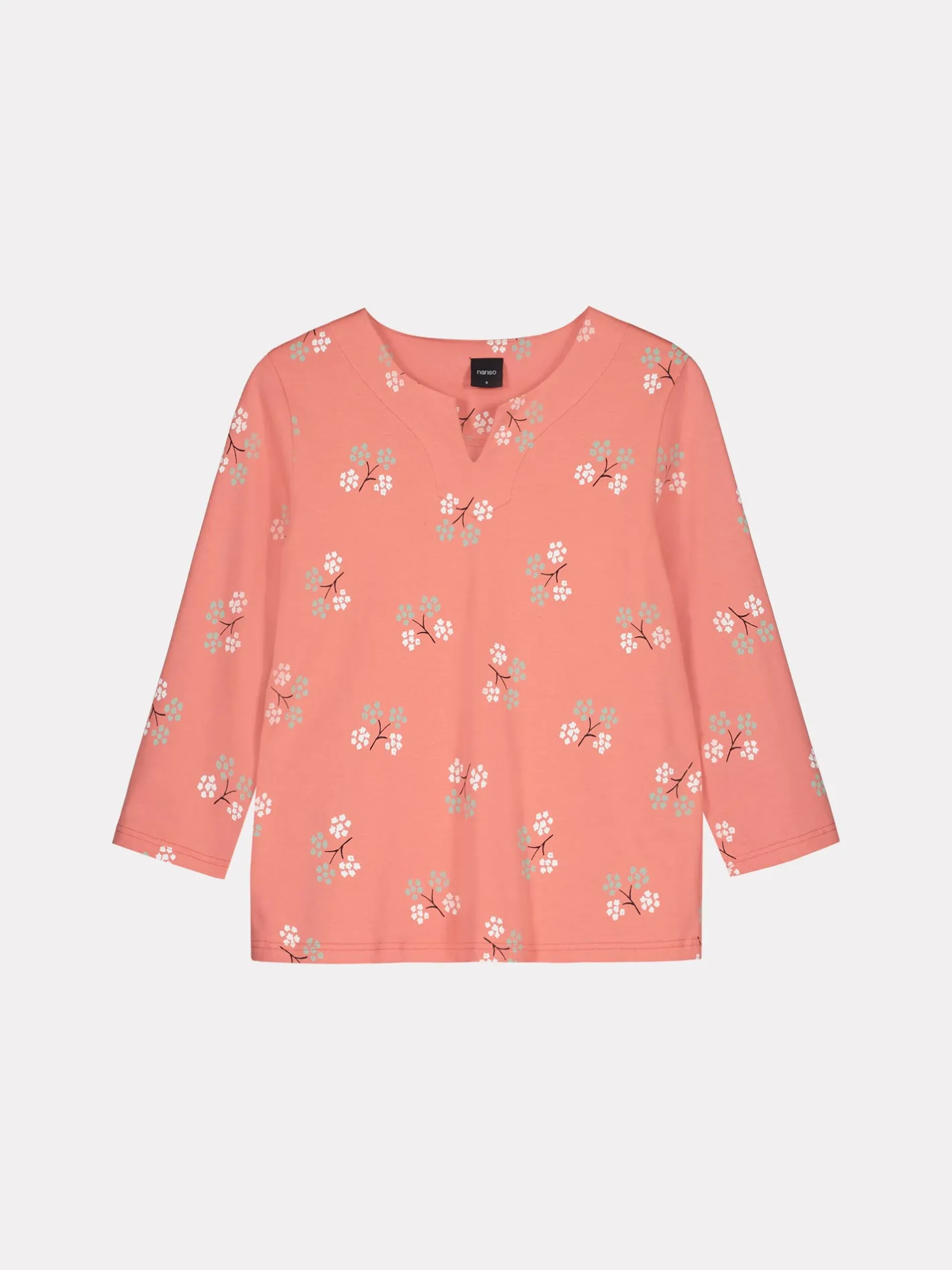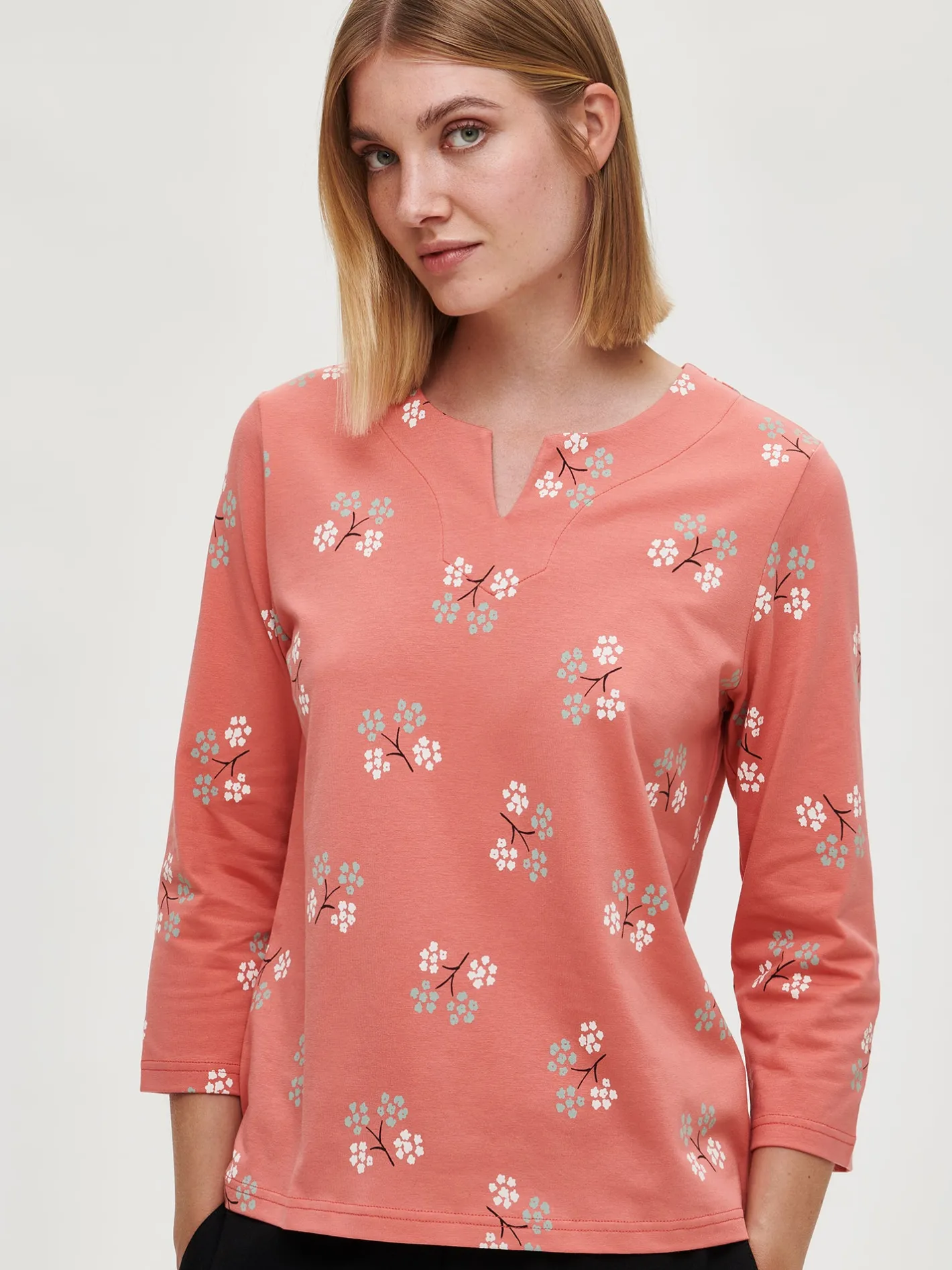 Naisten kuosillinen koralli Pikku Cassia-pusero. Puserossa on alavaralla viimeistelty pyöreä pääntie, jonka edessä on halkio. Puserossa on 3/4 pituiset hihat ja helma on suora. Puseron pituus koossa M on noin 64 cm. Materiaali on miellyttävää ja joustavaa puuvilla-elastaani-neulosta.