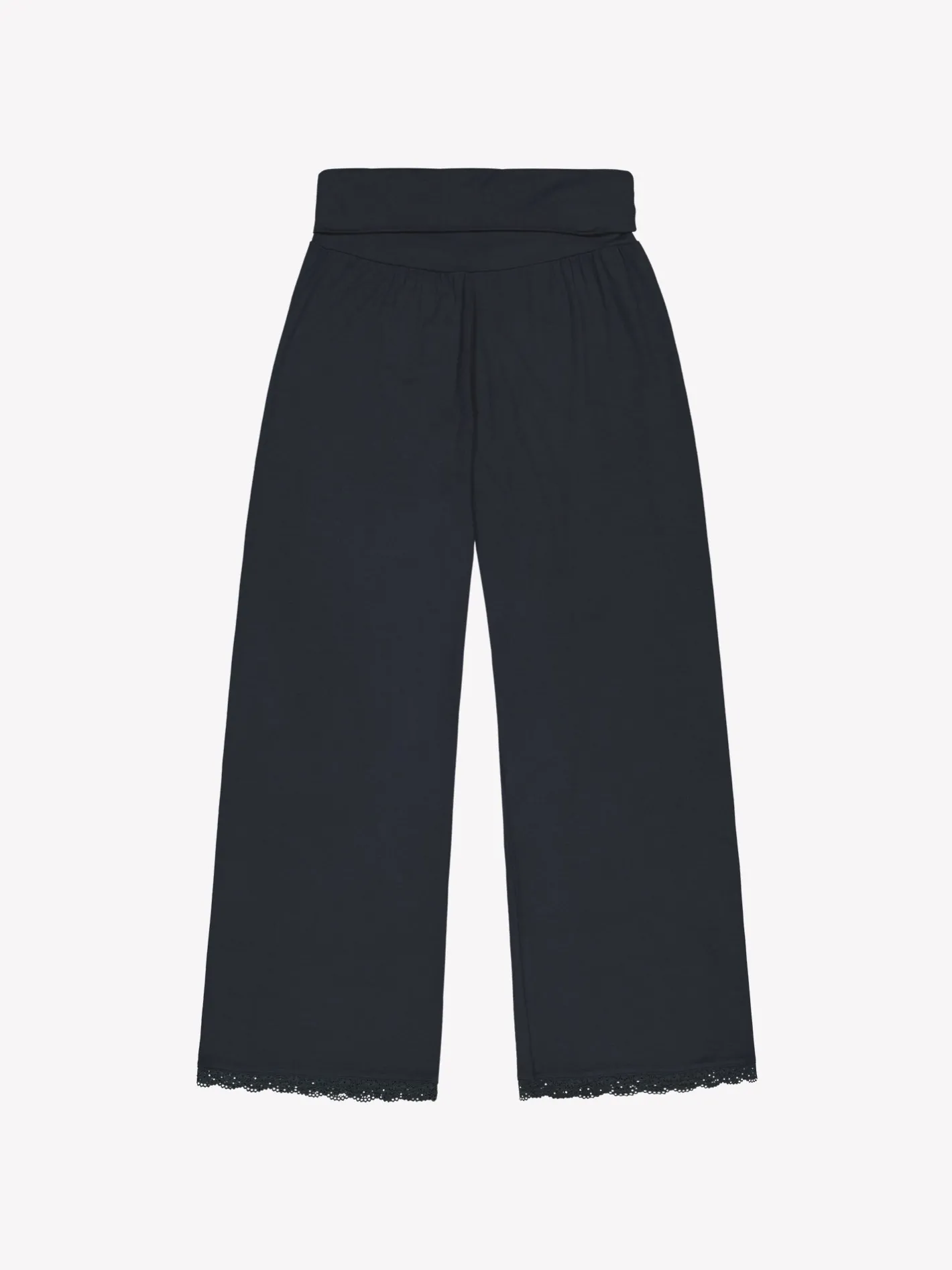Naisten ylellisen pehmeät Pitsi-housut tummansinisenä. Housuissa on mukava vyötärörakenne leveällä ja tukevalla tuplakaistaleella. 7/8 mittaisten housujen lahkeensuita koristaa ajaton pitsinauha. Materiaali on laadukasta, iholla silkkisen pehmeältä tuntuvaa mikromodaali-elastaania.