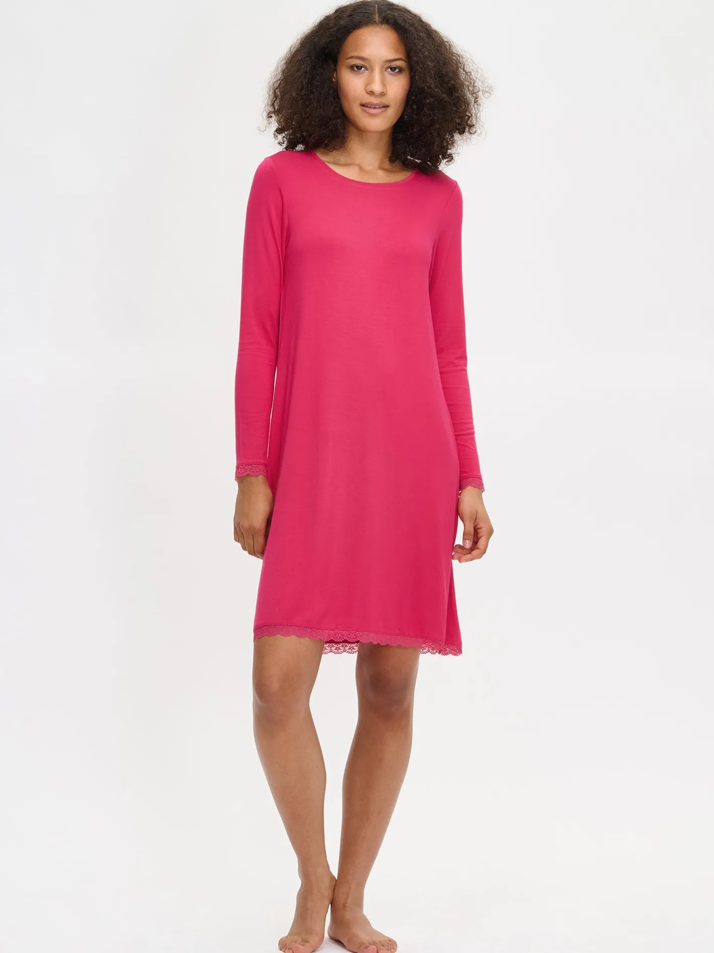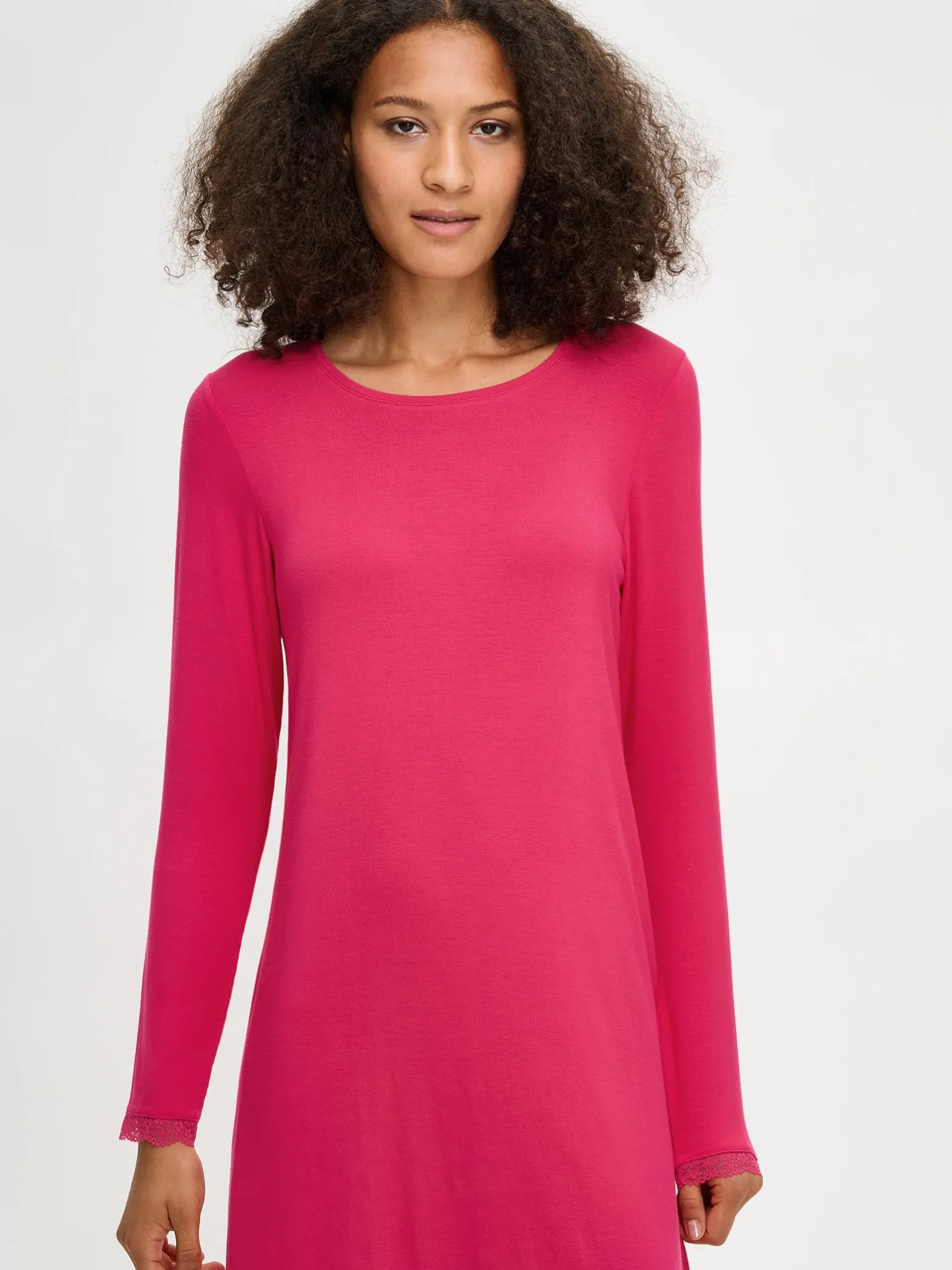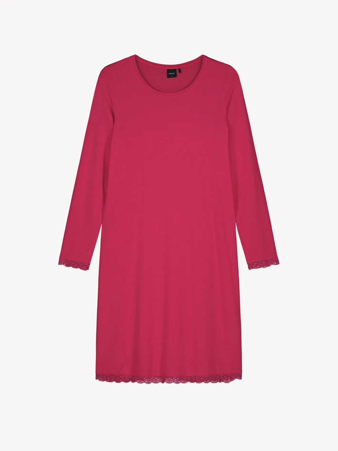 Naisten ylellisen pehmeä Pitsi-yöpaita täyspitkillä hihoilla ja pyöreällä pääntiellä pinkissä värissä. Hihansuita ja helmaa koristaa ajaton pitsinauha. Yöpaidan pituus koossa M on noin 95 cm. Materiaali on laadukasta, iholla silkkisen pehmeältä tuntuvaa mikromodaali-elastaania.