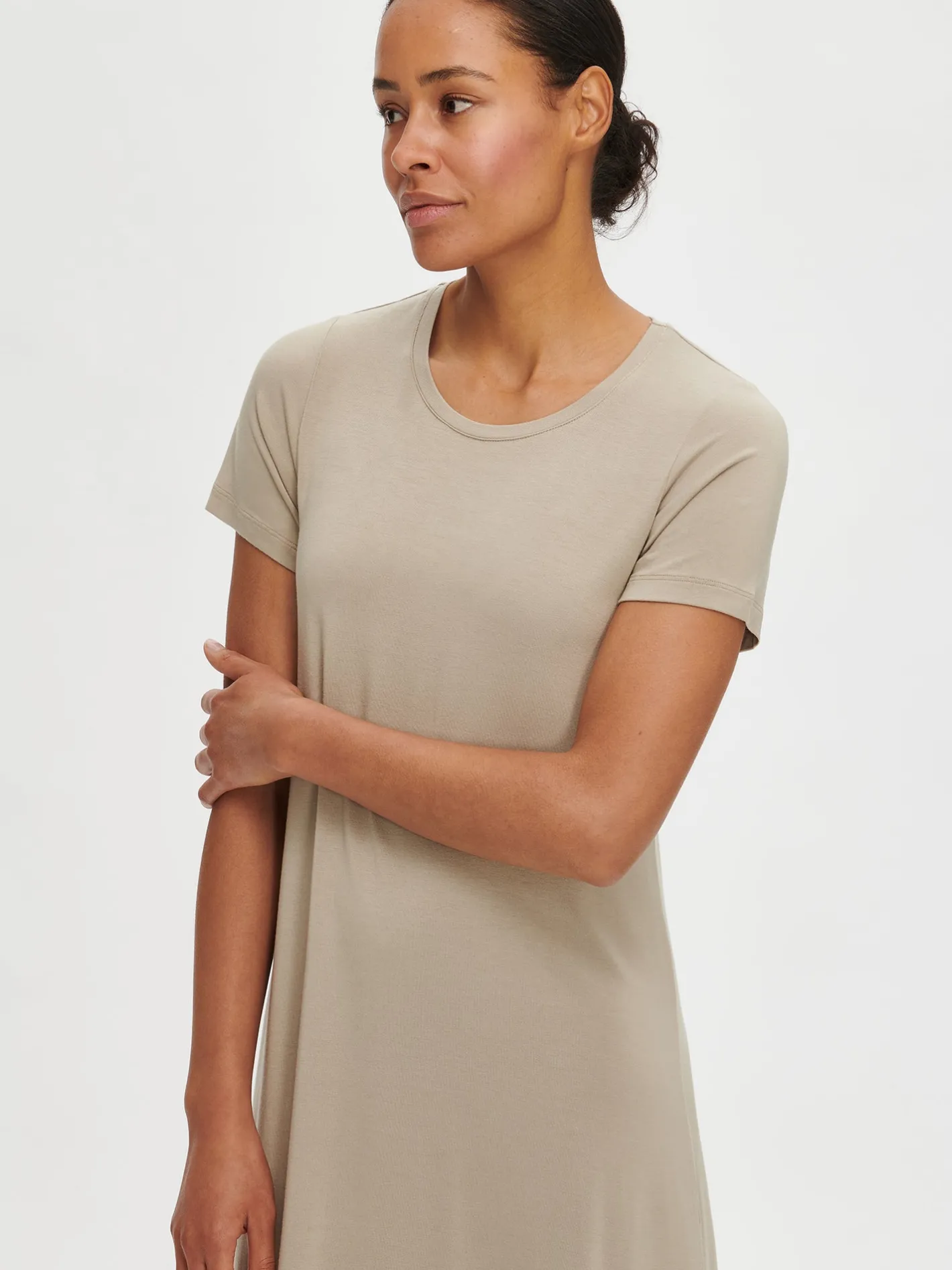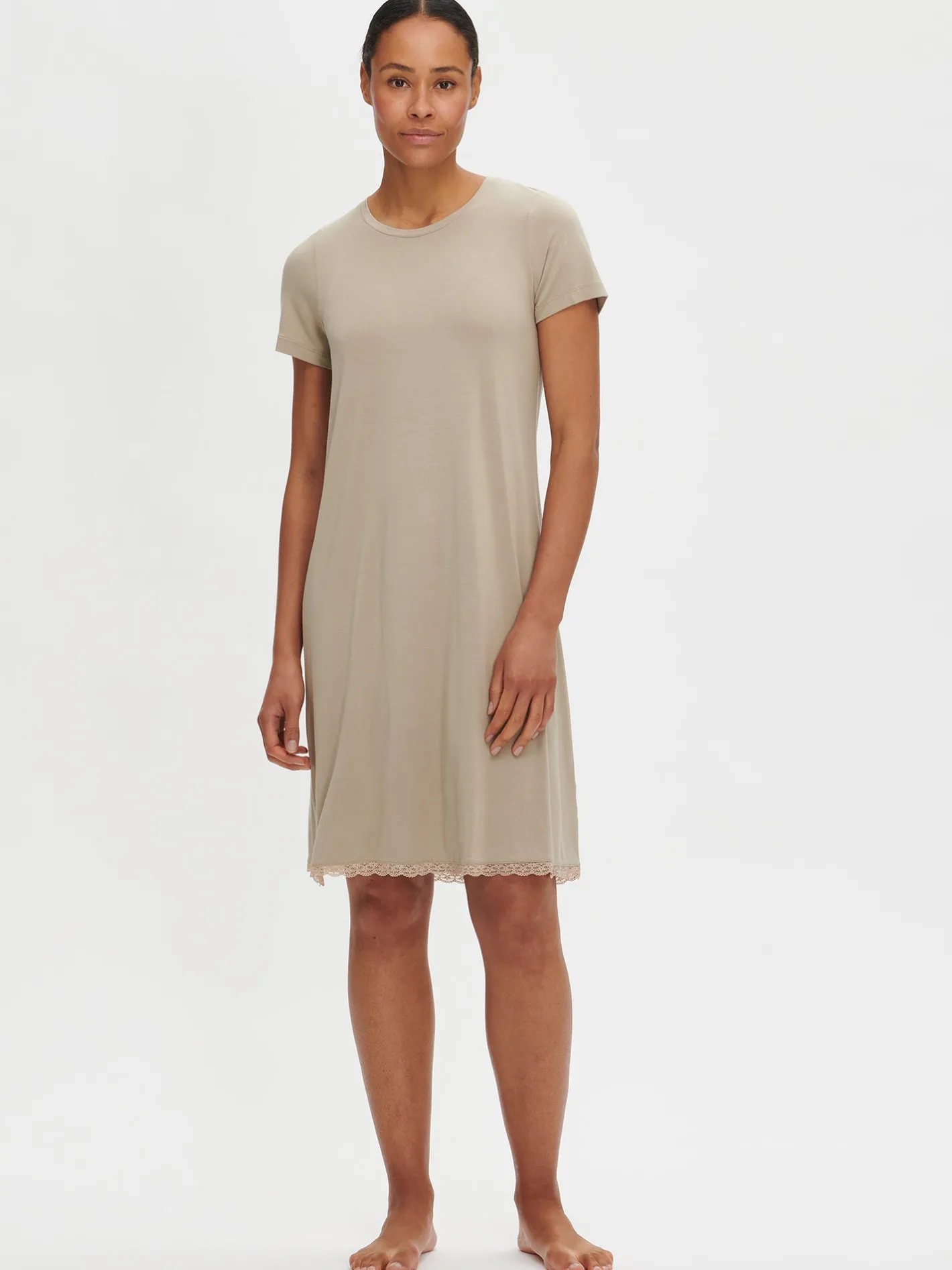 Ylellisen pehmeä ruskea Pitsi-yöpaita lyhyillä hihoilla ja pyöreällä pääntiellä. Helmaa koristaa ajaton pitsinauha. Yöpaidan pituus koossa M on noin 95 cm. Materiaali on laadukasta, iholla silkkisen pehmeältä tuntuvaa mikromodaali-elastaania.