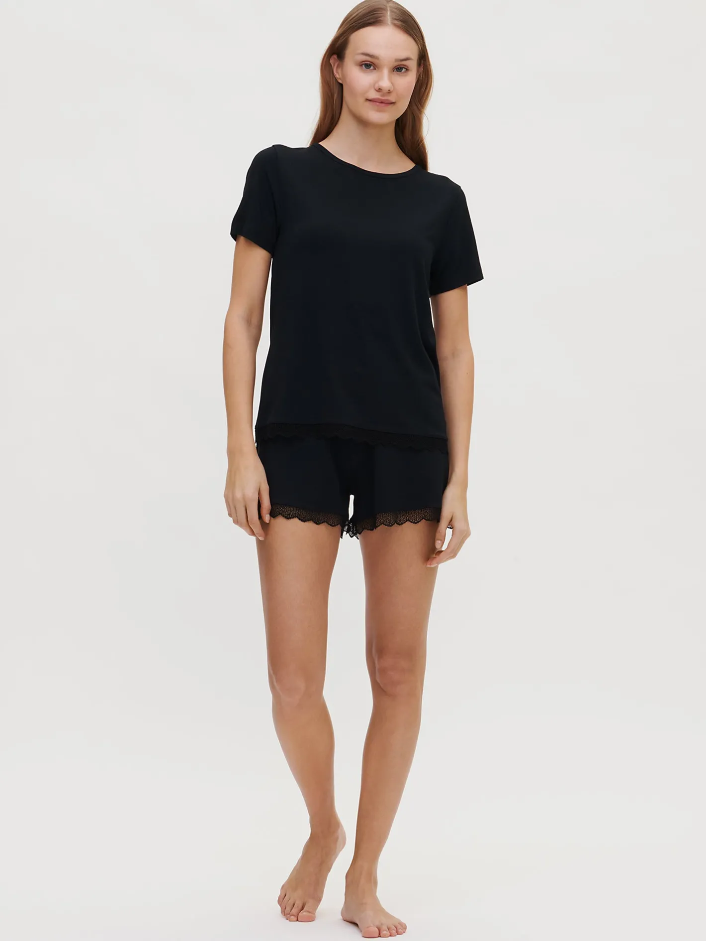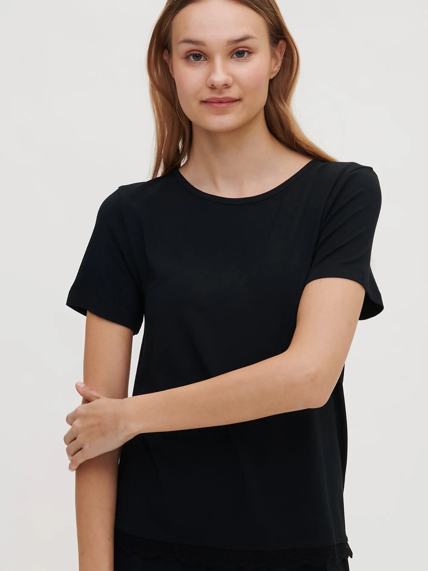 Naisten ylellisen pehmeä musta Pitsi-pusero lyhyillä hihoilla. Helmaa koristaa ajaton pitsinauha. Puseron pituus koossa M on noin 62 cm. Materiaali on laadukasta, iholla silkkisen pehmeältä tuntuvaa modaali-elastaania.