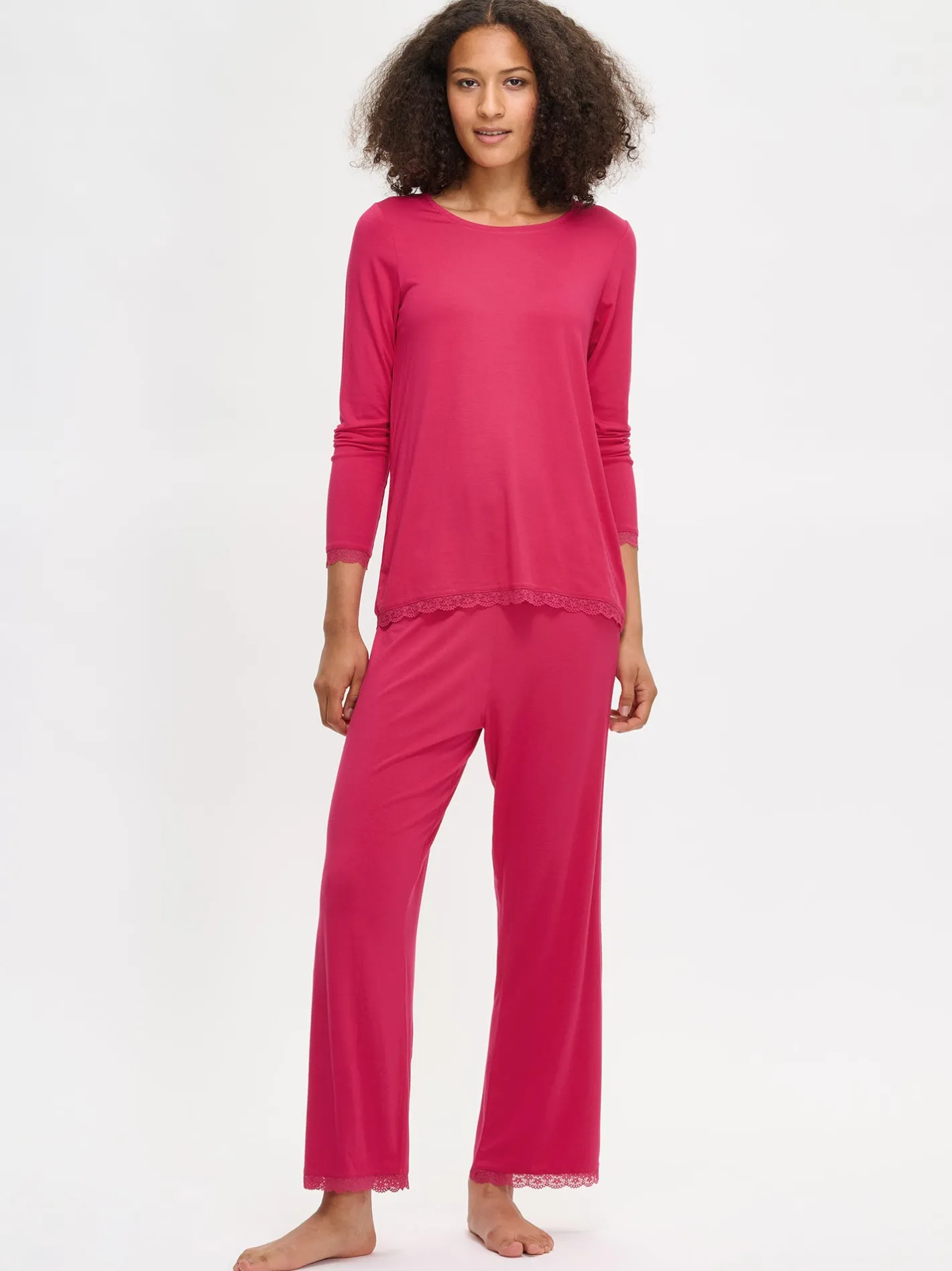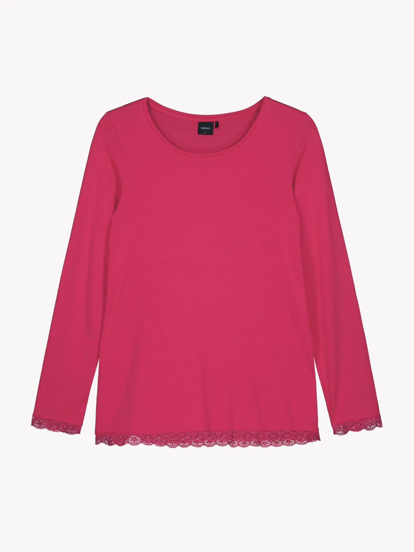 Naisten ylellisen pehmeä Pitsi-pusero täyspitkillä hihoilla ja pyöreällä pääntiellä pinkissä sävyssä. Hihansuita ja helmaa koristaa ajaton pitsinauha. Puseron pituus koossa M on noin 68 cm. Materiaali on laadukasta, iholla silkkisen pehmeältä tuntuvaa mikromodaali-elastaania.