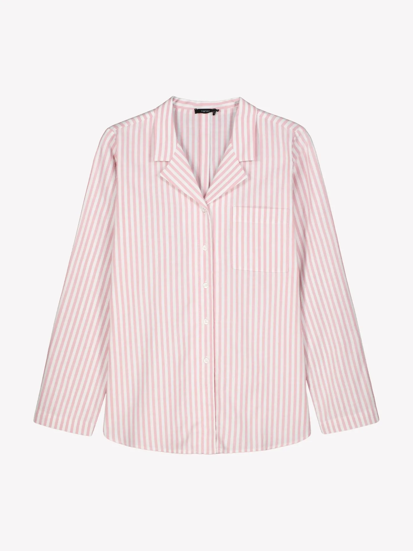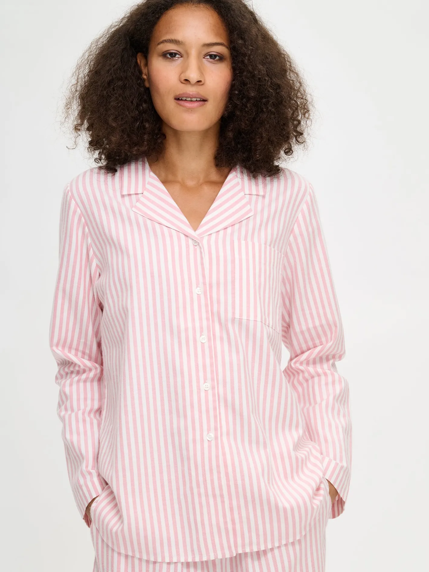 Naisten raidallinen Polka-pyjamapaita vaaleanpunaisessa värissä. Pitkähihaisessa pyjamapaidassa on kauniisti muotoiltu kaulus, nappilista ja pyöristetty helma. Puseron pituus koossa M on noin 70 cm. Materiaali on pehmeää ja miellyttävän tuntuista puuvillaflanellikangasta. Materiaalille on ominaista 3-5% kutistuminen ensimmäisessä pesussa.