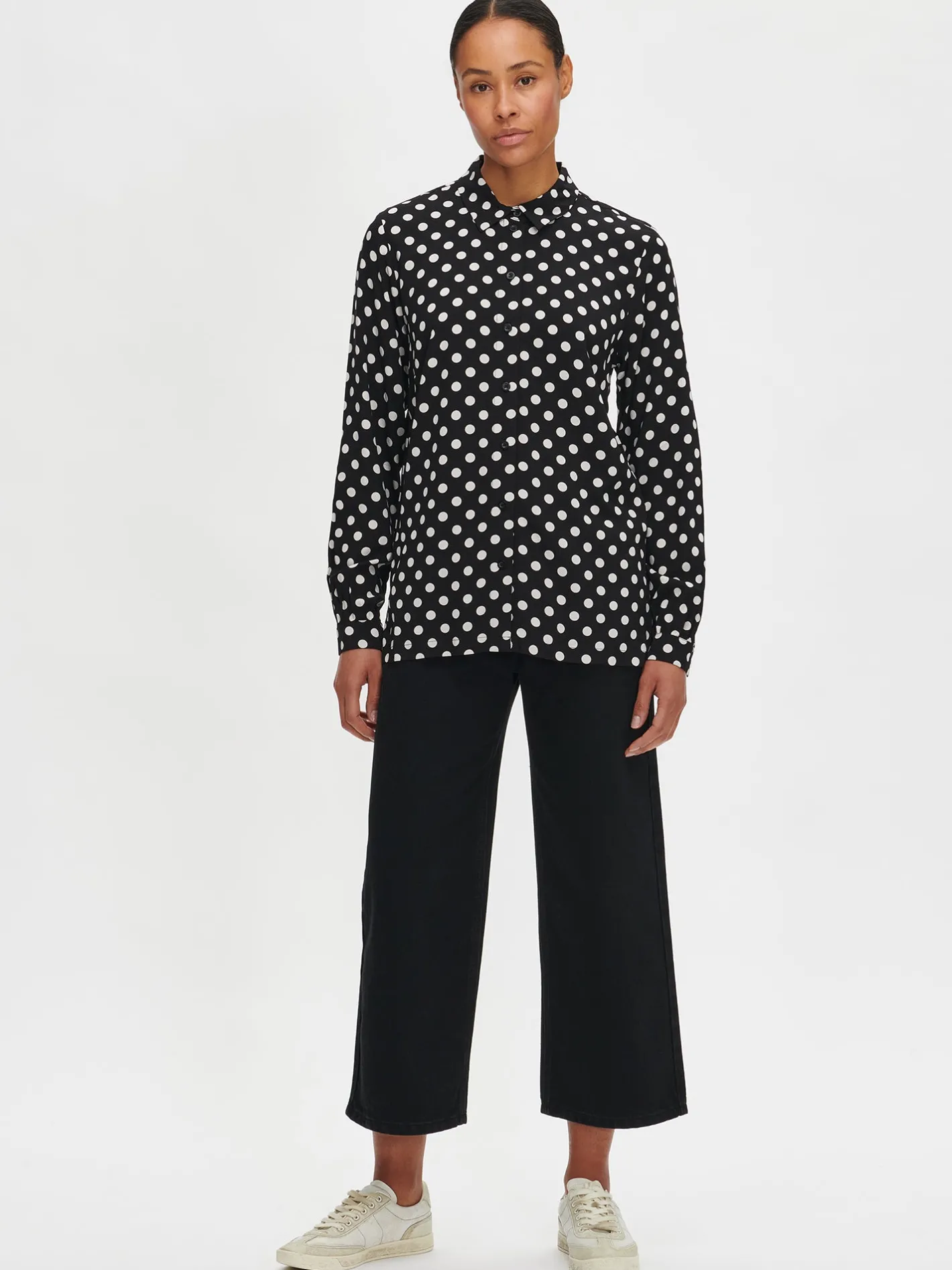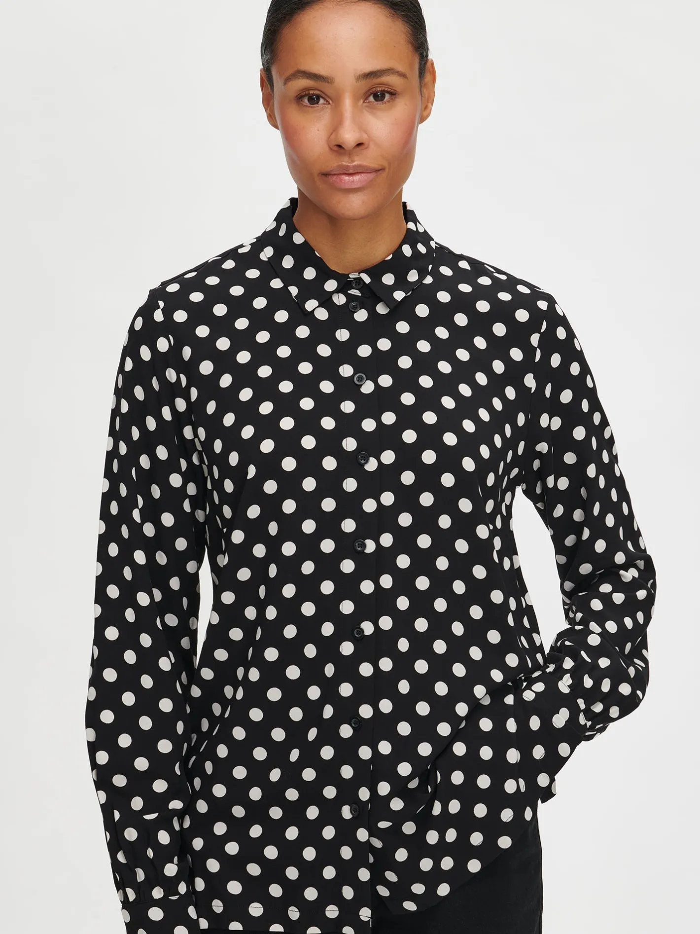 Naisten kuosillinen mustavalkoinen Polkka-pusero. Pilkkukuvioinen kauluspaita on rennon tyylikäs. Pitkähihaisessa paitapuserossa on klassiset kaulukset, edessä napitus sekä rintamuotolaskokset. Puserossa on täyspitkät hihat, joiden hihansuissa on nappikalvosimet. Puseron helma on suora ja sivuissa on halkiot. Puseron pituus koossa 38 on noin 70 cm. Materiaali on kauniisti laskeutuvaa kudottua 100 % viskoosikangasta. Materiaalille on ominaista 3-5% kutistuminen ensimmäisessä pesussa.