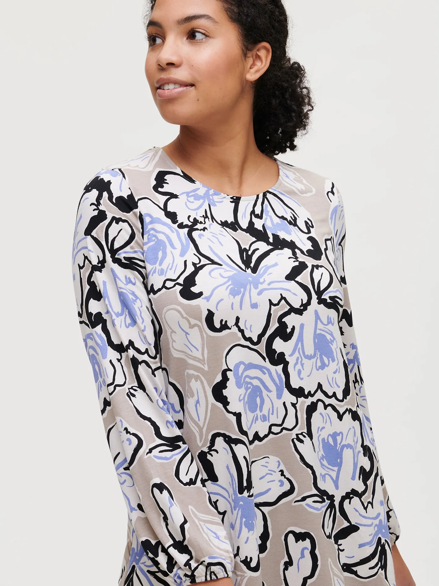 Naisten kukkakuvioinen khaki Puutarhuri-tunika. Ihanassa tunikassa on kantilla viimeistelty pyöreä pääntie, taskut sivuissa ja täyspitkät hihat, jotka poimuttuvat hihansuun kuminauhakäänteen yläpuolelle. Tunikan pituus koossa M on noin 80 cm. Materiaali on laadukasta, miellyttävän tuntuista ja laskeutuvaa viskoosi-elastaani-neulosta, joka pysyy hyvänä pesusta toiseen. Tuote on valmistettu vastuullisemmasta LENZING™ ECOVERO™ -viskoosista. Materiaalille on ominaista 3-5% kutistuminen ensimmäisessä pesussa.