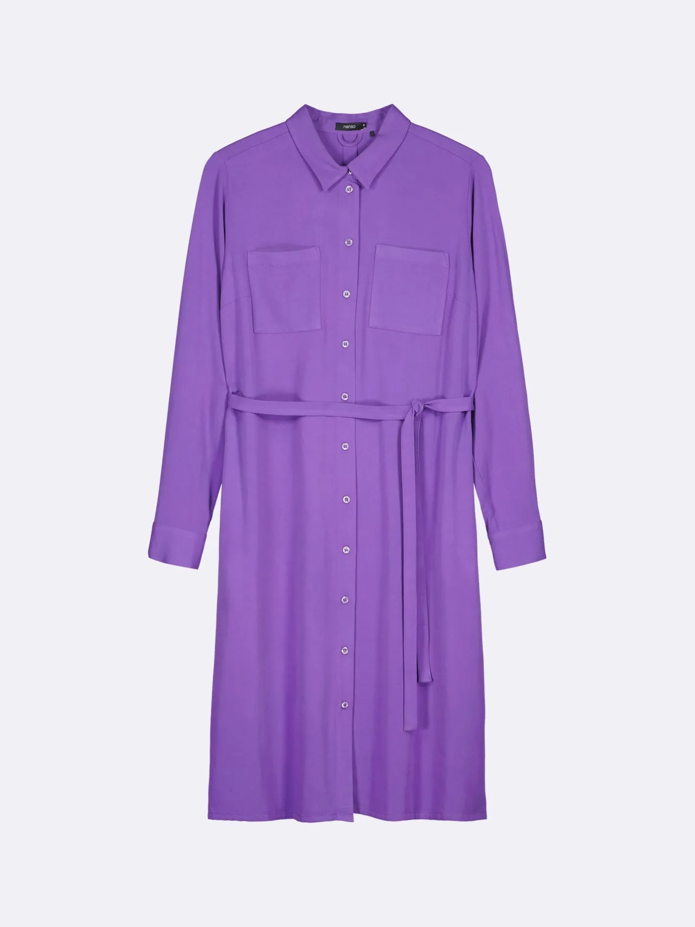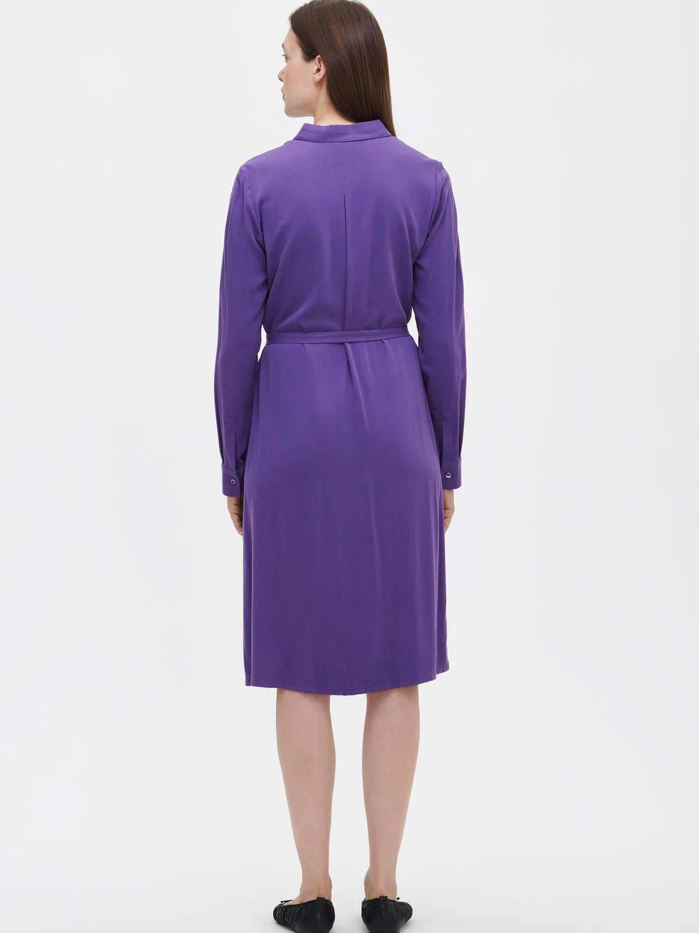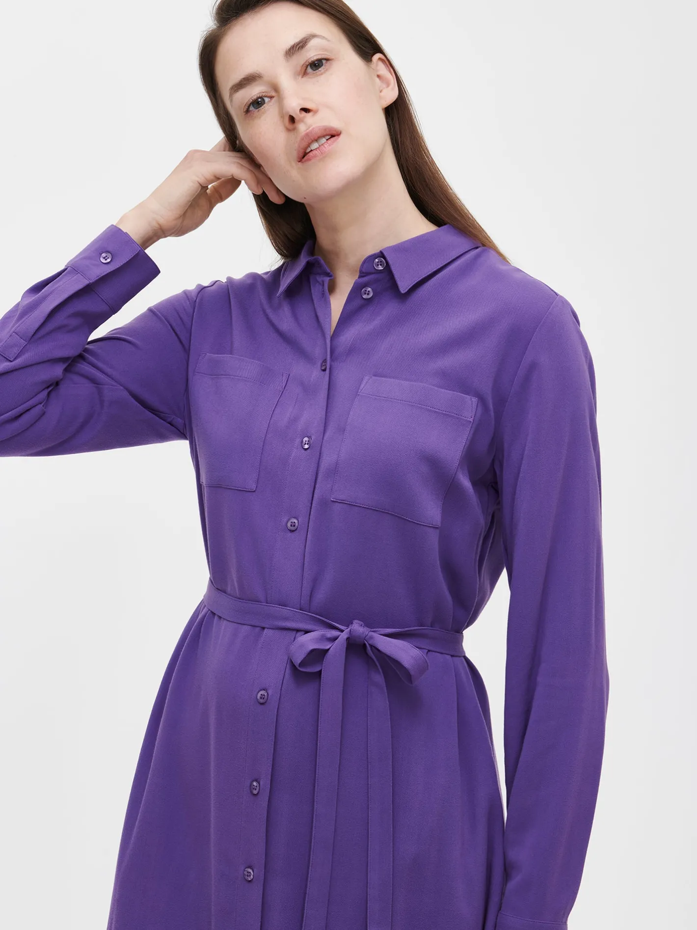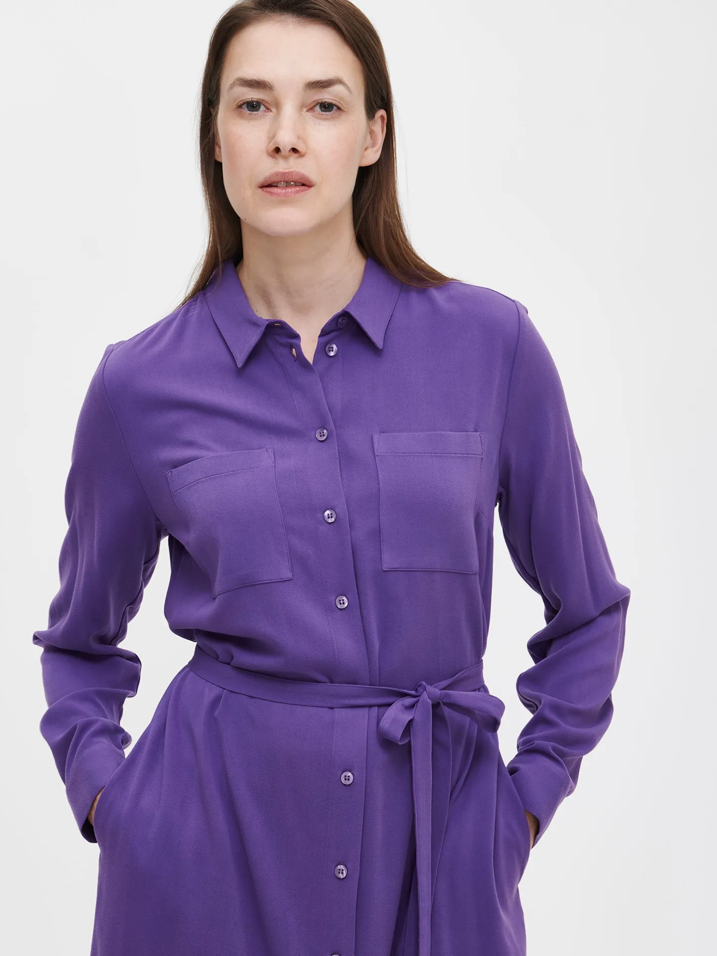 Naisten lila Raami-mekko. Kauluspaitamekko on vaatekaapin ajaton klassikko. Mekossa on edessä napitus, rintataskut, rintamuotolaskokset ja takana laskos. Mekossa on täyspitkät hihat, joiden hihansuissa on nappikalvosimet. Mukana tulee samasta materiaalista valmistettu kapea irtovyö. Mekon pituus koossa 38 on noin 110 cm. Kauniisti laskeutuvan puseron materiaali on laadukasta ja miellyttävän tuntuista twill sidoksista viskoosikangasta. Tuote on valmistettu LENZING™ ECOVERO™ -viskoosista. Materiaalille on ominaista 3-5% kutistuminen ensimmäisessä pesussa.