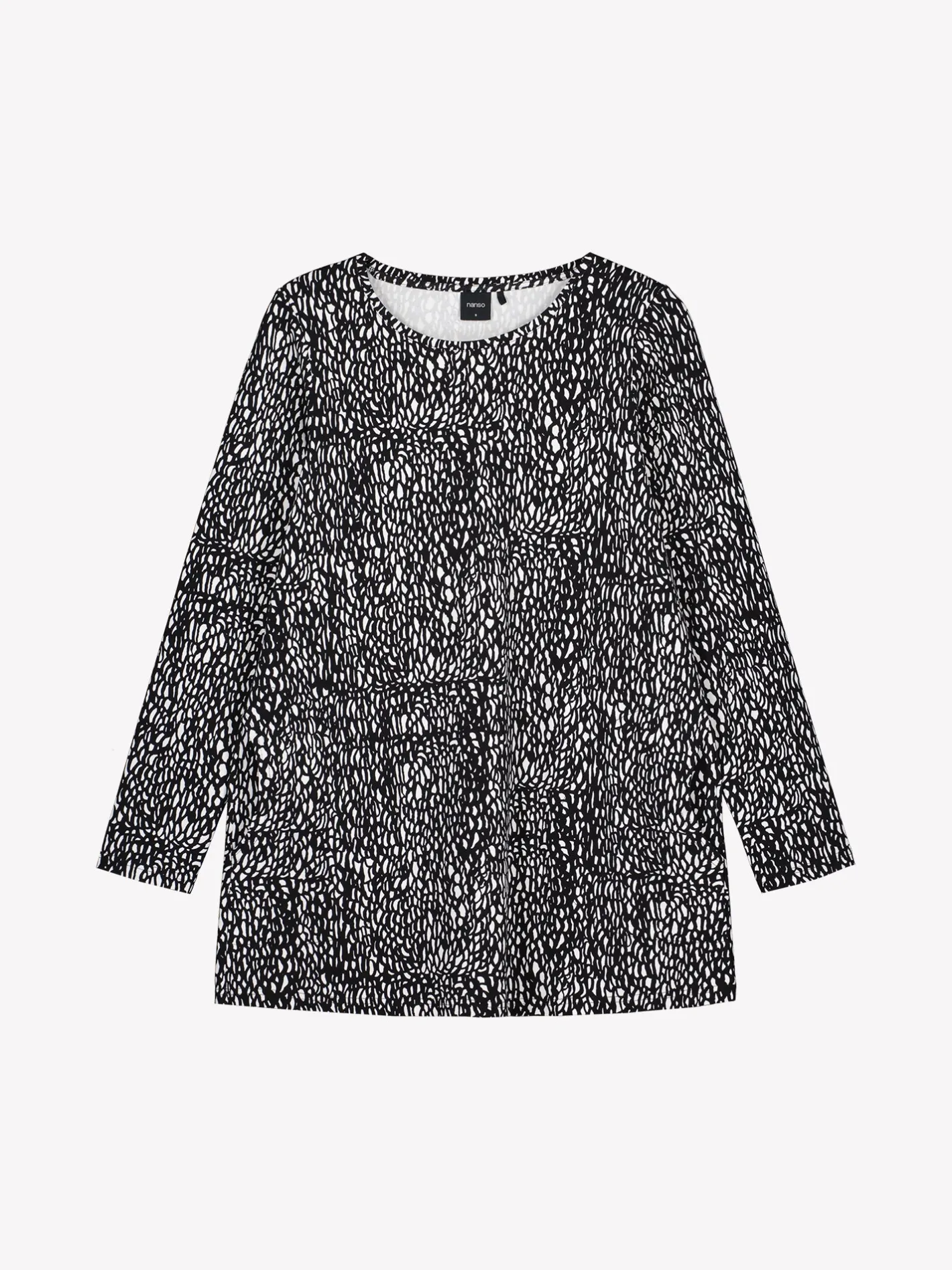 Naisten kuosillinen mustavalkoinen Raku-tunika. Tunikassa on pyöreä tereellä viimeistelty pääntie, sivuissa taskut ja täyspitkät hihat. Tunikan pituus koossa M on noin 80 cm. Materiaali on miellyttävän tuntuista ja helppohoitoista puuvilla-elastaani-neulosta.