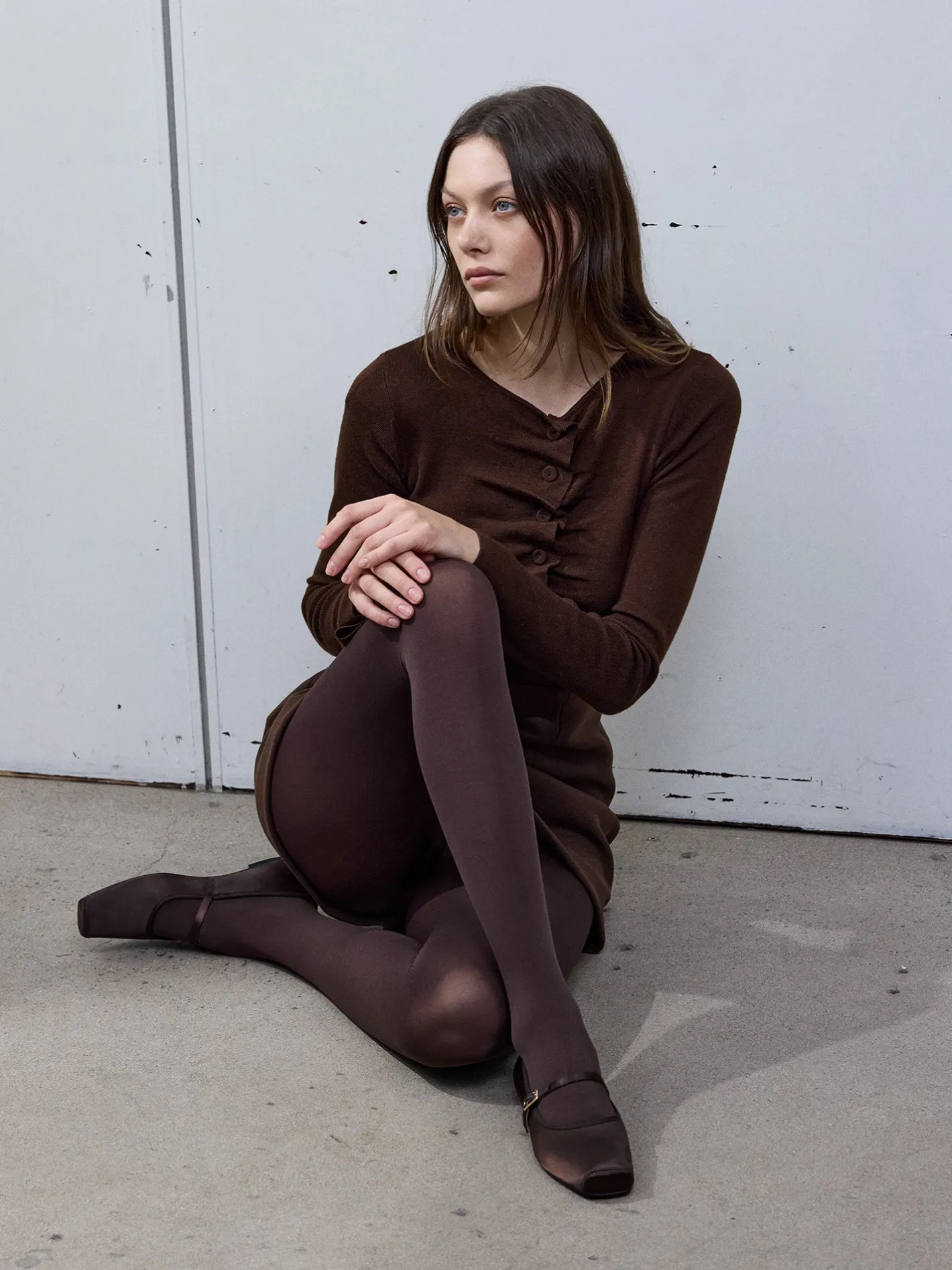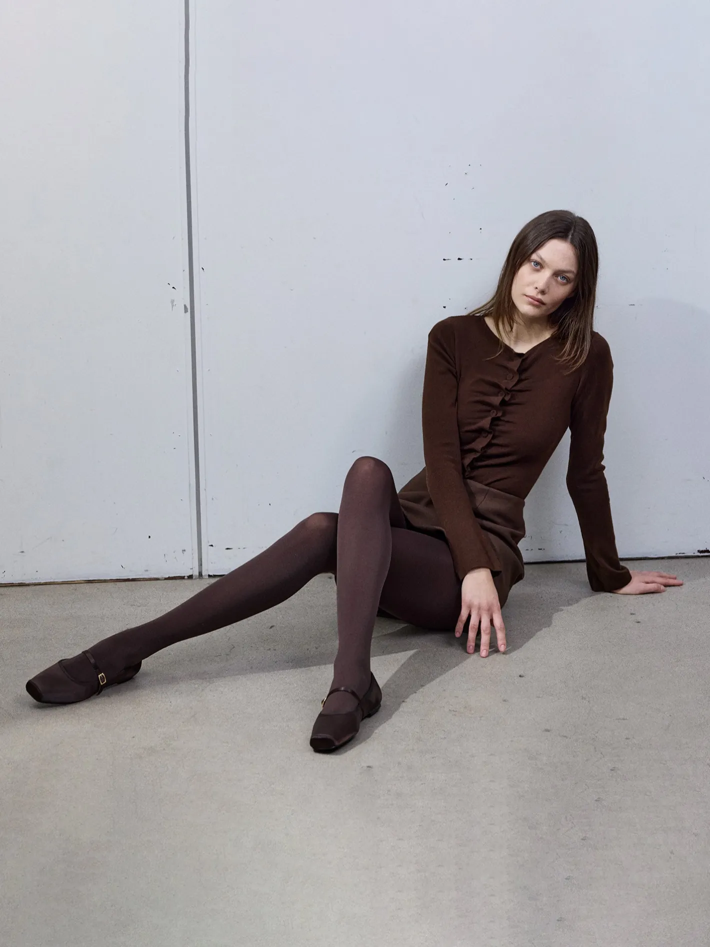 Kaakaon ruskeat matta sukkahousut antavat elegantin ilmeen tulevan syksyn asuihin. Muodikkuuden lisäksi sukkahousut lisäävät mukavuutta paksumman materiaalin ja leveän vyötärönauhan myötä. Sukkahousut on valmistettu kierrätystä Econyl-polyamidista sekä elastaanista.