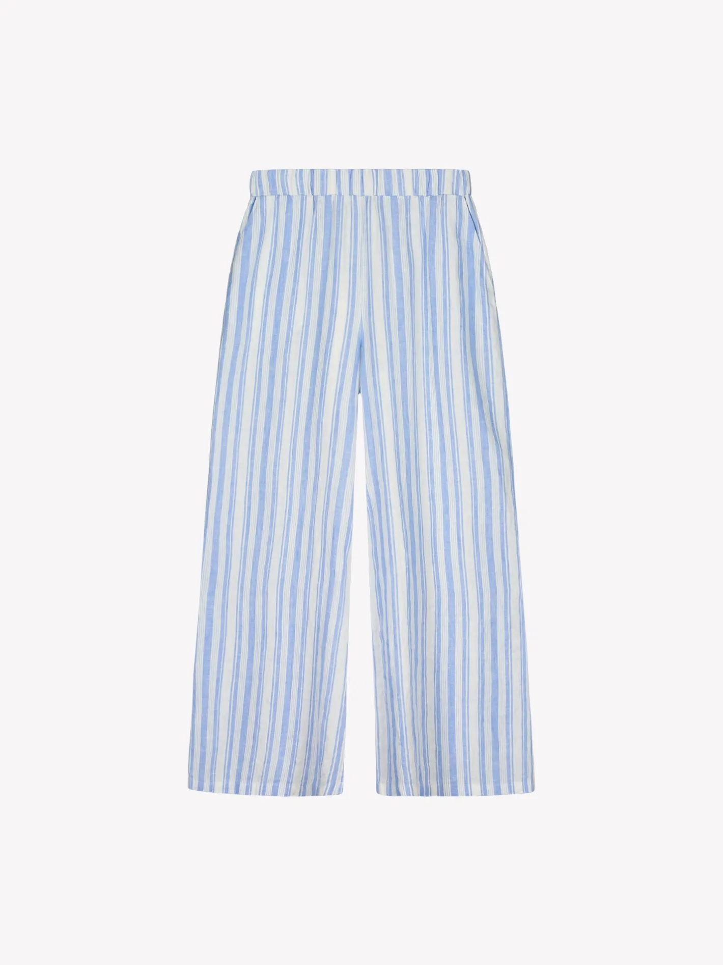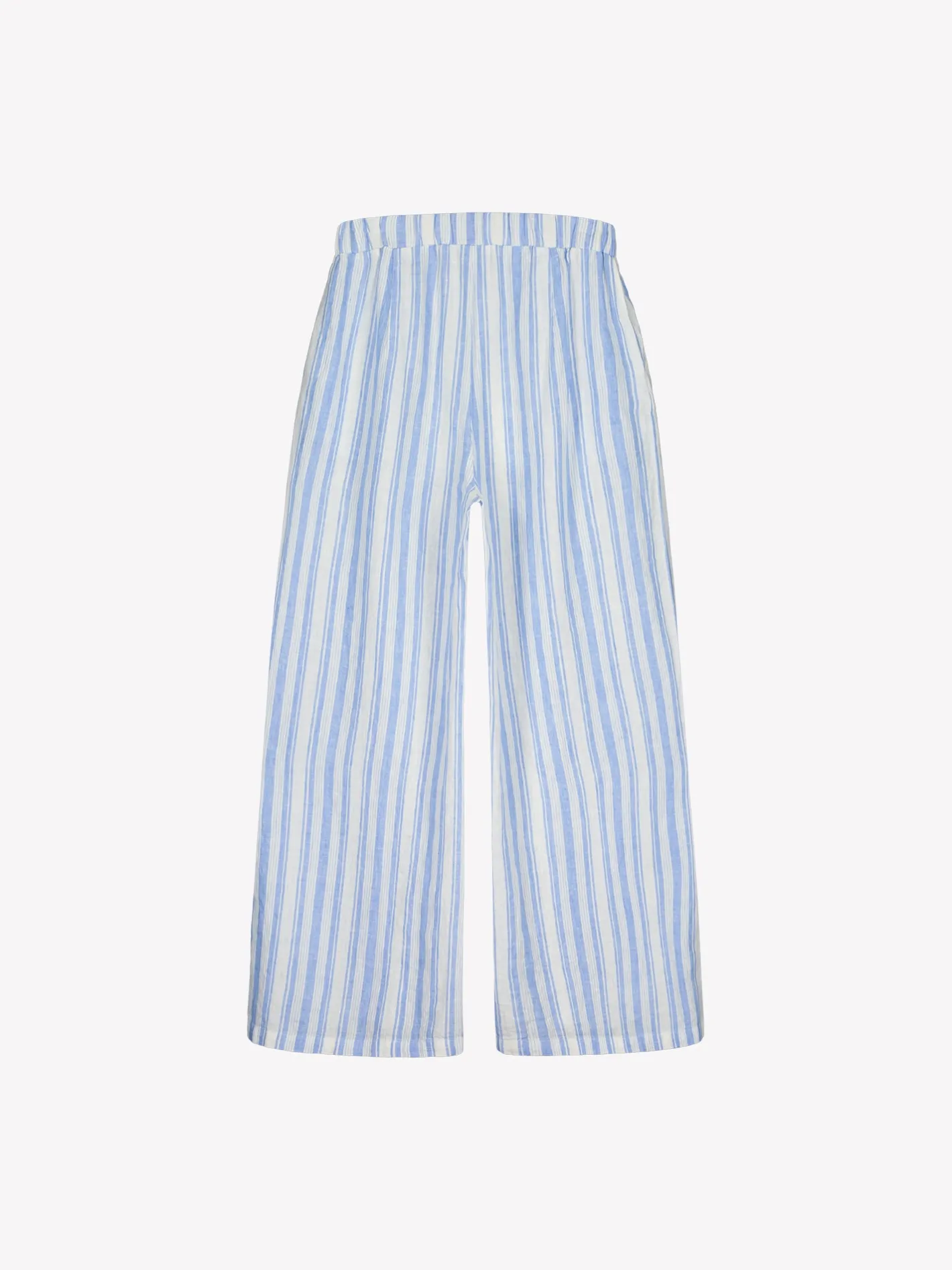 Naisten raidalliset vaaleansiniset Regatta-pellavahousut. Housuissa on leveät lahkeet, sivuissa taskut ja joustava vyötärö. Housut ovat 7/8 pituiset ja lahkeen sisäpituus koossa 38 on noin 67 cm. Materiaali kudottua pellavakangasta, joka on kestävää ja hengittävää. Pellavalle on ominaista luonnollinen pieni rypistyminen. Tuote on esipesty tuotannossa, joten se ei kutistu ensimmäisessä pesussa.