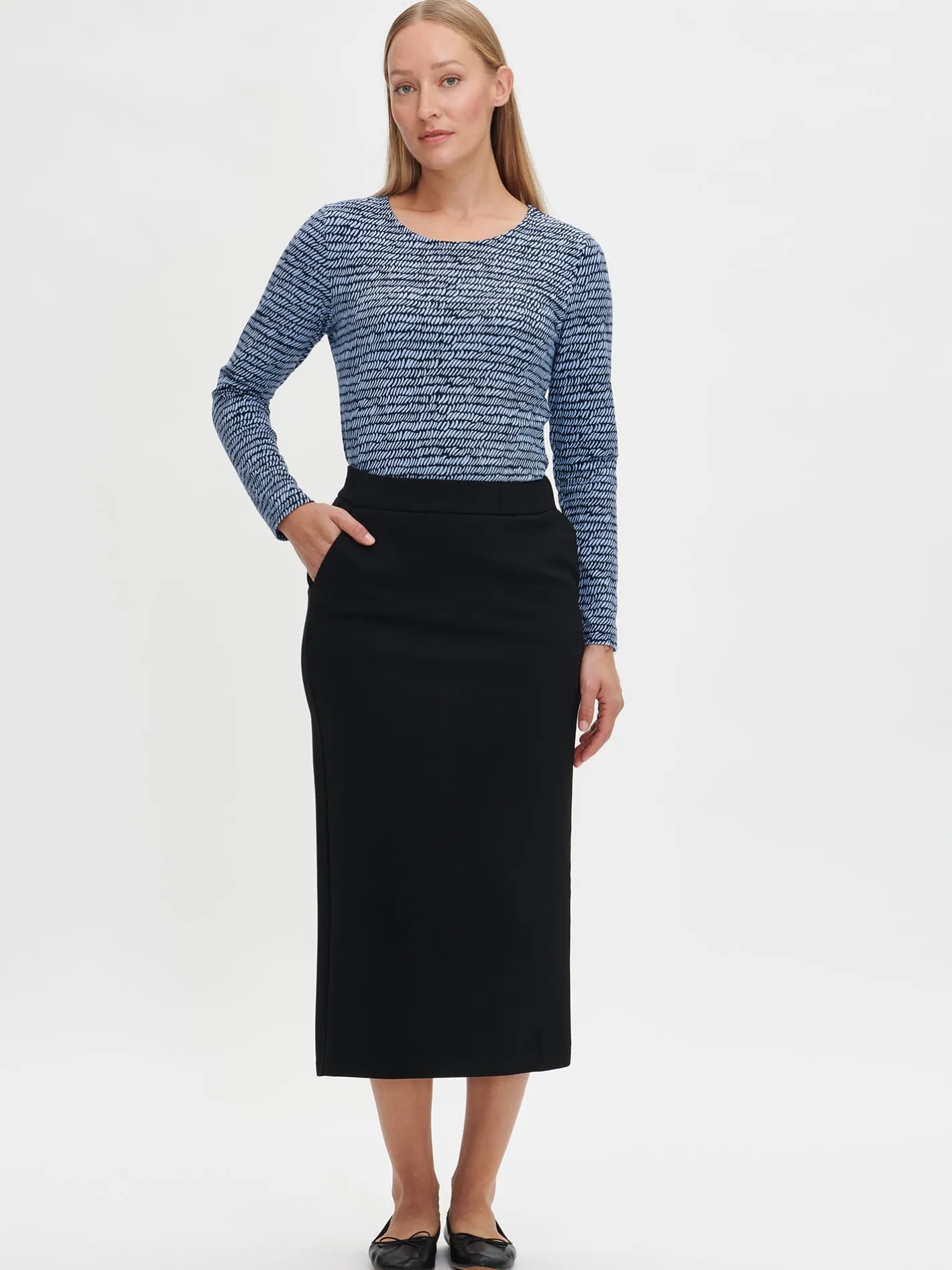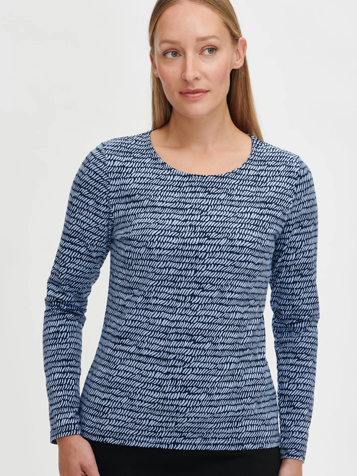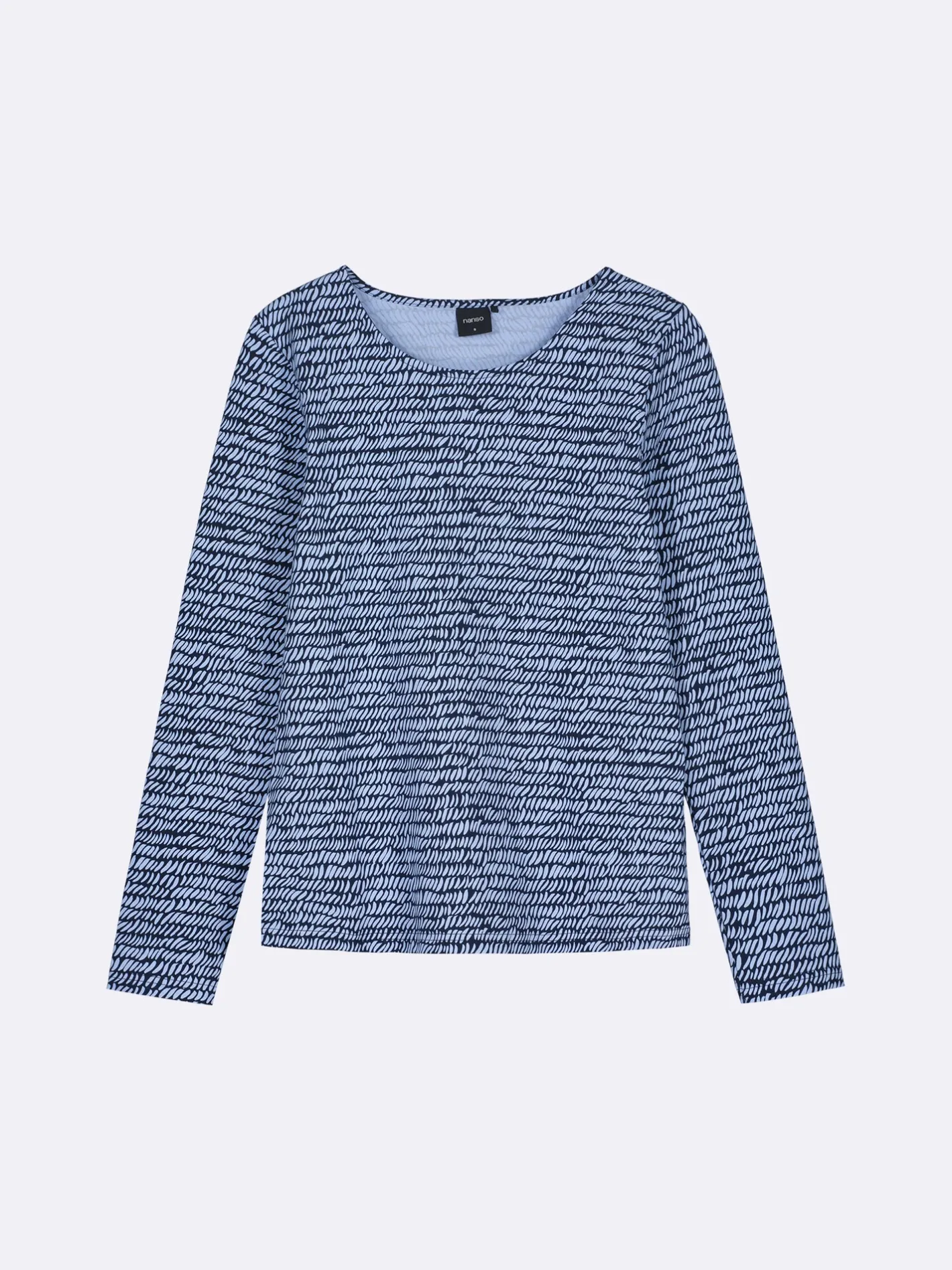 Naisten pitkähihainen, kuosillinen sininen Reija-pusero. Laadukas ja mukava pusero on helppo sovittaa erilaisiin asukokonaisuuksiin. Istuvassa puserossa on kantilla viimeistelty pyöreä pääntie ja täyspitkät hihat. Puseron pituus koossa M on noin 65 cm. Materiaali on miellyttävän tuntuista ja helppohoitoista puuvilla-elastaani-neulosta.