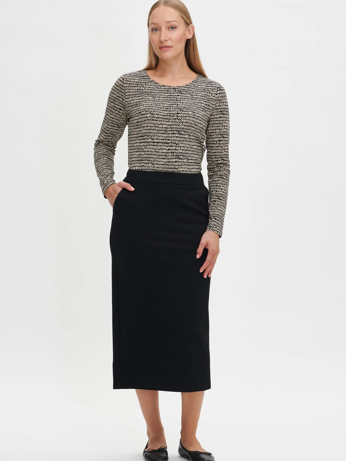 Naisten pitkähihainen, kuosillinen musta Reija-pusero. Laadukas ja mukava pusero on helppo sovittaa erilaisiin asukokonaisuuksiin. Istuvassa puserossa on kantilla viimeistelty pyöreä pääntie ja täyspitkät hihat. Puseron pituus koossa M on noin 65 cm. Materiaali on miellyttävän tuntuista ja helppohoitoista puuvilla-elastaani-neulosta.