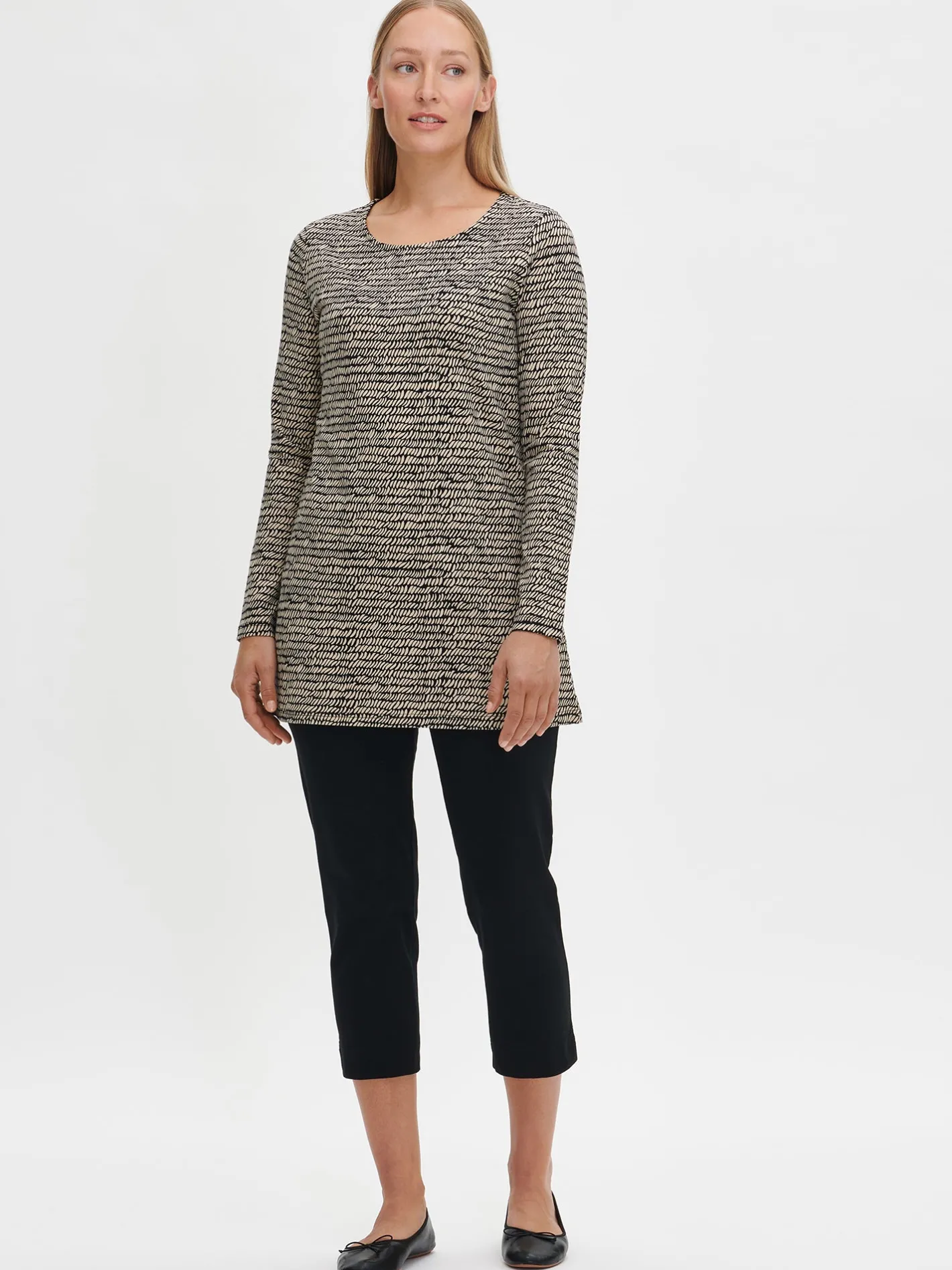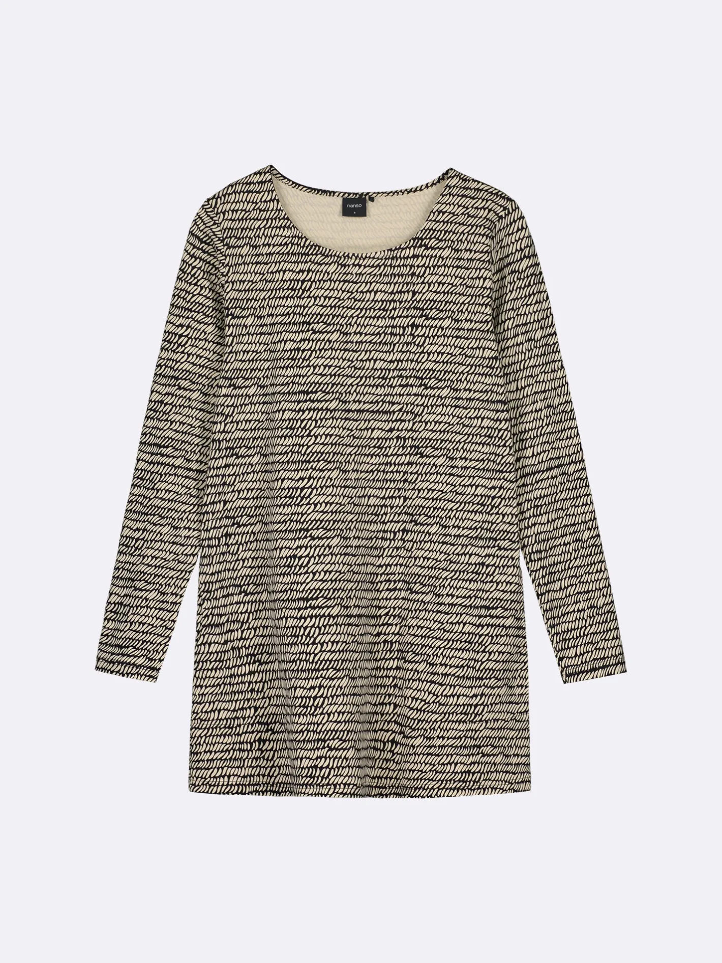 Naisten kuosillinen musta Reija-tunika. Pitkähihainen tunika on rento ja mukava arkivaate, johon on aina ihanaa pukeutua. Tunikassa on kantilla viimeistelty pyöreä pääntie, taskut sivuissa ja täyspitkät hihat. Tunikan pituus koossa M on noin 80 cm. Materiaali on miellyttävän tuntuista ja helppohoitoista puuvilla-elastaani-neulosta.